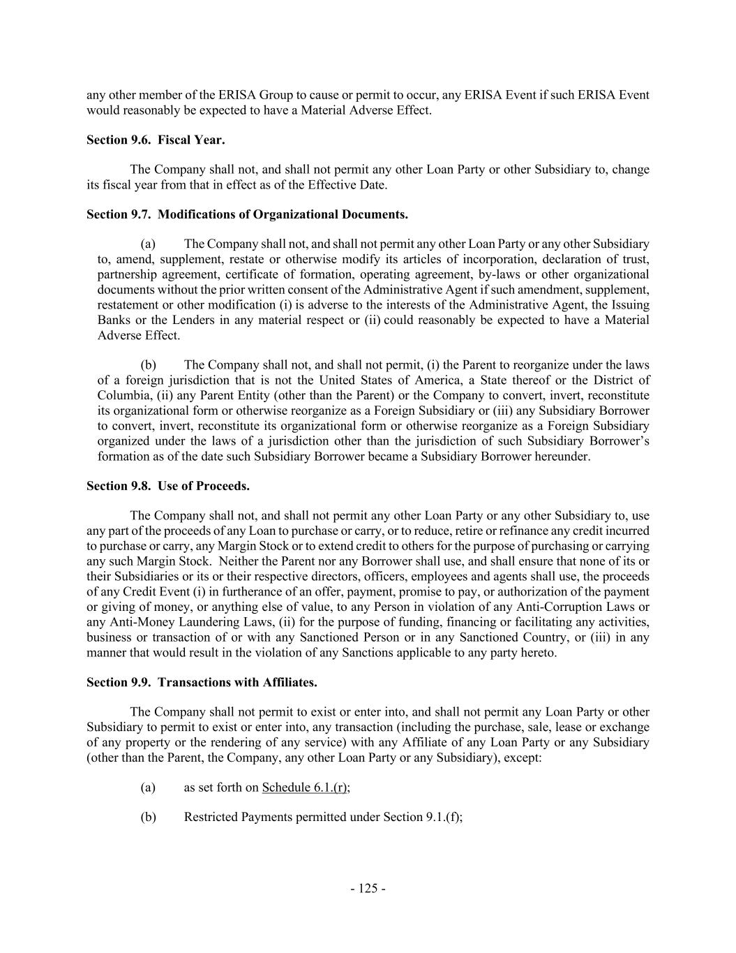- 125 - any other member of the ERISA Group to cause or permit to occur, any ERISA Event if such ERISA Event would reasonably be expected to have a Material Adverse Effect. Section 9.6. Fiscal Year. The Company shall not, and shall not permit any other Loan Party or other Subsidiary to, change its fiscal year from that in effect as of the Effective Date. Section 9.7. Modifications of Organizational Documents. (a) The Company shall not, and shall not permit any other Loan Party or any other Subsidiary to, amend, supplement, restate or otherwise modify its articles of incorporation, declaration of trust, partnership agreement, certificate of formation, operating agreement, by-laws or other organizational documents without the prior written consent of the Administrative Agent if such amendment, supplement, restatement or other modification (i) is adverse to the interests of the Administrative Agent, the Issuing Banks or the Lenders in any material respect or (ii) could reasonably be expected to have a Material Adverse Effect. (b) The Company shall not, and shall not permit, (i) the Parent to reorganize under the laws of a foreign jurisdiction that is not the United States of America, a State thereof or the District of Columbia, (ii) any Parent Entity (other than the Parent) or the Company to convert, invert, reconstitute its organizational form or otherwise reorganize as a Foreign Subsidiary or (iii) any Subsidiary Borrower to convert, invert, reconstitute its organizational form or otherwise reorganize as a Foreign Subsidiary organized under the laws of a jurisdiction other than the jurisdiction of such Subsidiary Borrower’s formation as of the date such Subsidiary Borrower became a Subsidiary Borrower hereunder. Section 9.8. Use of Proceeds. The Company shall not, and shall not permit any other Loan Party or any other Subsidiary to, use any part of the proceeds of any Loan to purchase or carry, or to reduce, retire or refinance any credit incurred to purchase or carry, any Margin Stock or to extend credit to others for the purpose of purchasing or carrying any such Margin Stock. Neither the Parent nor any Borrower shall use, and shall ensure that none of its or their Subsidiaries or its or their respective directors, officers, employees and agents shall use, the proceeds of any Credit Event (i) in furtherance of an offer, payment, promise to pay, or authorization of the payment or giving of money, or anything else of value, to any Person in violation of any Anti-Corruption Laws or any Anti-Money Laundering Laws, (ii) for the purpose of funding, financing or facilitating any activities, business or transaction of or with any Sanctioned Person or in any Sanctioned Country, or (iii) in any manner that would result in the violation of any Sanctions applicable to any party hereto. Section 9.9. Transactions with Affiliates. The Company shall not permit to exist or enter into, and shall not permit any Loan Party or other Subsidiary to permit to exist or enter into, any transaction (including the purchase, sale, lease or exchange of any property or the rendering of any service) with any Affiliate of any Loan Party or any Subsidiary (other than the Parent, the Company, any other Loan Party or any Subsidiary), except: (a) as set forth on Schedule 6.1.(r); (b) Restricted Payments permitted under Section 9.1.(f);