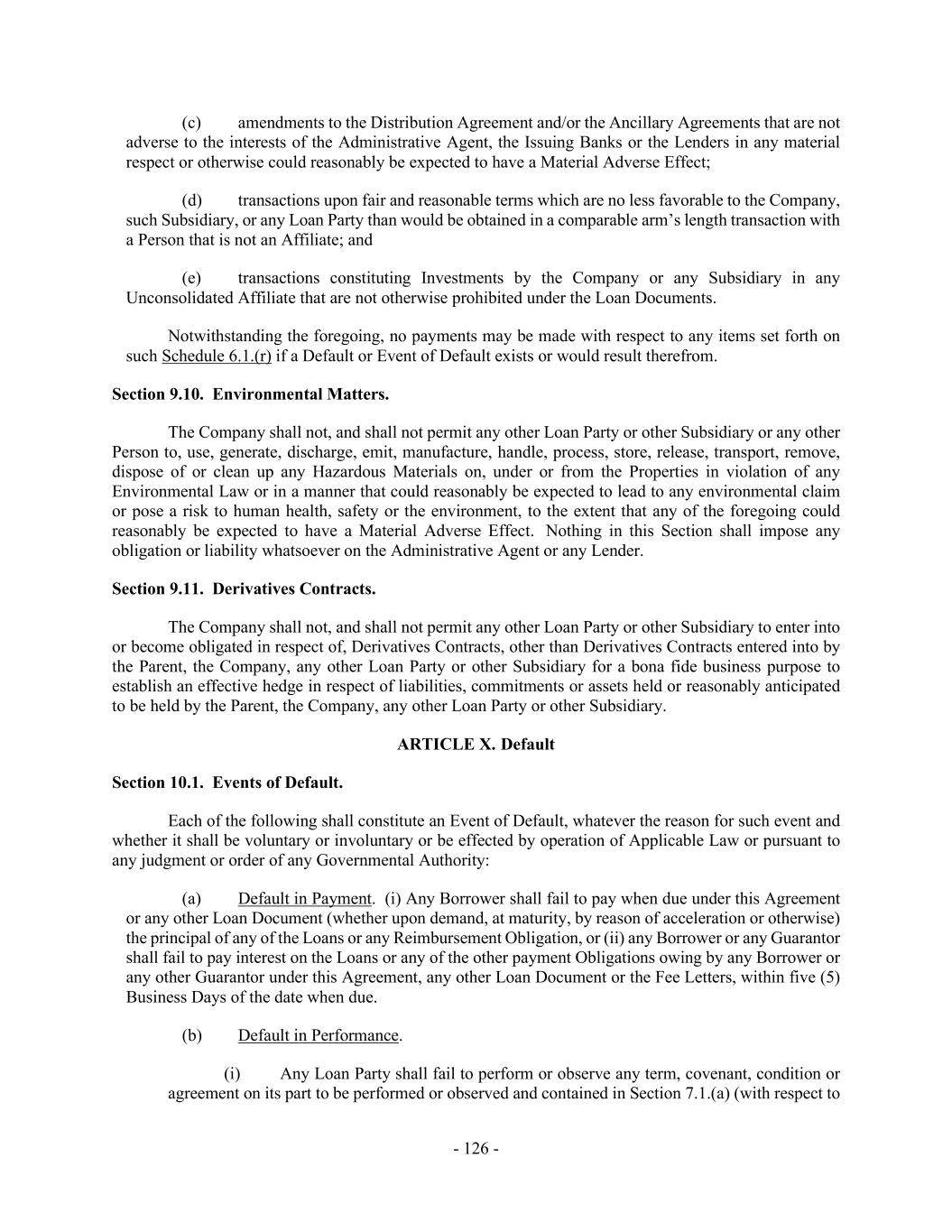 - 126 - (c) amendments to the Distribution Agreement and/or the Ancillary Agreements that are not adverse to the interests of the Administrative Agent, the Issuing Banks or the Lenders in any material respect or otherwise could reasonably be expected to have a Material Adverse Effect; (d) transactions upon fair and reasonable terms which are no less favorable to the Company, such Subsidiary, or any Loan Party than would be obtained in a comparable arm’s length transaction with a Person that is not an Affiliate; and (e) transactions constituting Investments by the Company or any Subsidiary in any Unconsolidated Affiliate that are not otherwise prohibited under the Loan Documents. Notwithstanding the foregoing, no payments may be made with respect to any items set forth on such Schedule 6.1.(r) if a Default or Event of Default exists or would result therefrom. Section 9.10. Environmental Matters. The Company shall not, and shall not permit any other Loan Party or other Subsidiary or any other Person to, use, generate, discharge, emit, manufacture, handle, process, store, release, transport, remove, dispose of or clean up any Hazardous Materials on, under or from the Properties in violation of any Environmental Law or in a manner that could reasonably be expected to lead to any environmental claim or pose a risk to human health, safety or the environment, to the extent that any of the foregoing could reasonably be expected to have a Material Adverse Effect. Nothing in this Section shall impose any obligation or liability whatsoever on the Administrative Agent or any Lender. Section 9.11. Derivatives Contracts. The Company shall not, and shall not permit any other Loan Party or other Subsidiary to enter into or become obligated in respect of, Derivatives Contracts, other than Derivatives Contracts entered into by the Parent, the Company, any other Loan Party or other Subsidiary for a bona fide business purpose to establish an effective hedge in respect of liabilities, commitments or assets held or reasonably anticipated to be held by the Parent, the Company, any other Loan Party or other Subsidiary. ARTICLE X. Default Section 10.1. Events of Default. Each of the following shall constitute an Event of Default, whatever the reason for such event and whether it shall be voluntary or involuntary or be effected by operation of Applicable Law or pursuant to any judgment or order of any Governmental Authority: (a) Default in Payment. (i) Any Borrower shall fail to pay when due under this Agreement or any other Loan Document (whether upon demand, at maturity, by reason of acceleration or otherwise) the principal of any of the Loans or any Reimbursement Obligation, or (ii) any Borrower or any Guarantor shall fail to pay interest on the Loans or any of the other payment Obligations owing by any Borrower or any other Guarantor under this Agreement, any other Loan Document or the Fee Letters, within five (5) Business Days of the date when due. (b) Default in Performance. (i) Any Loan Party shall fail to perform or observe any term, covenant, condition or agreement on its part to be performed or observed and contained in Section 7.1.(a) (with respect to