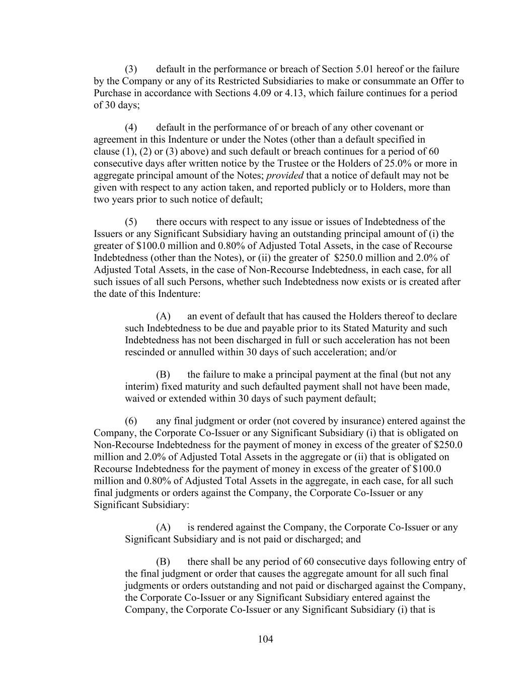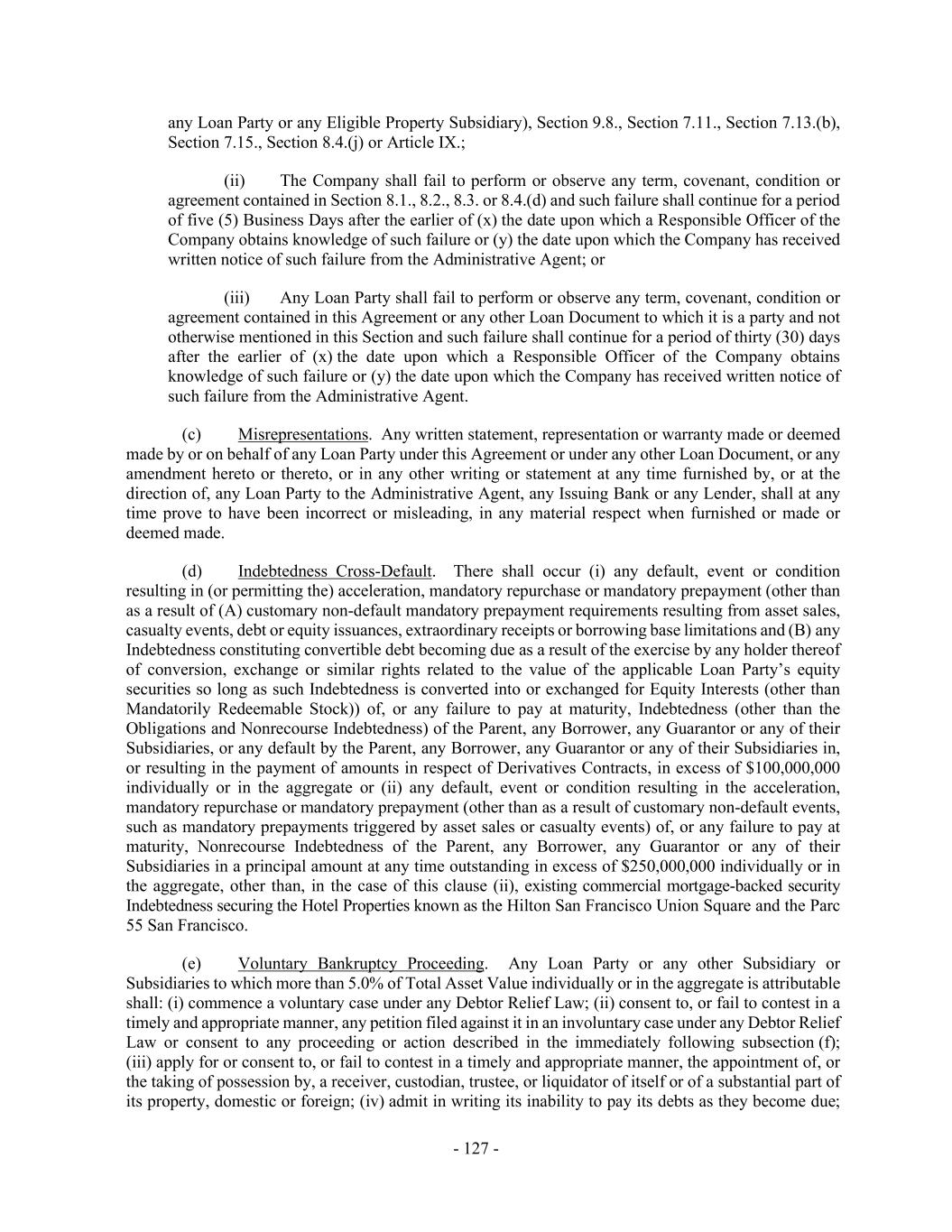 - 127 - any Loan Party or any Eligible Property Subsidiary), Section 9.8., Section 7.11., Section 7.13.(b), Section 7.15., Section 8.4.(j) or Article IX.; (ii) The Company shall fail to perform or observe any term, covenant, condition or agreement contained in Section 8.1., 8.2., 8.3. or 8.4.(d) and such failure shall continue for a period of five (5) Business Days after the earlier of (x) the date upon which a Responsible Officer of the Company obtains knowledge of such failure or (y) the date upon which the Company has received written notice of such failure from the Administrative Agent; or (iii) Any Loan Party shall fail to perform or observe any term, covenant, condition or agreement contained in this Agreement or any other Loan Document to which it is a party and not otherwise mentioned in this Section and such failure shall continue for a period of thirty (30) days after the earlier of (x) the date upon which a Responsible Officer of the Company obtains knowledge of such failure or (y) the date upon which the Company has received written notice of such failure from the Administrative Agent. (c) Misrepresentations. Any written statement, representation or warranty made or deemed made by or on behalf of any Loan Party under this Agreement or under any other Loan Document, or any amendment hereto or thereto, or in any other writing or statement at any time furnished by, or at the direction of, any Loan Party to the Administrative Agent, any Issuing Bank or any Lender, shall at any time prove to have been incorrect or misleading, in any material respect when furnished or made or deemed made. (d) Indebtedness Cross-Default. There shall occur (i) any default, event or condition resulting in (or permitting the) acceleration, mandatory repurchase or mandatory prepayment (other than as a result of (A) customary non-default mandatory prepayment requirements resulting from asset sales, casualty events, debt or equity issuances, extraordinary receipts or borrowing base limitations and (B) any Indebtedness constituting convertible debt becoming due as a result of the exercise by any holder thereof of conversion, exchange or similar rights related to the value of the applicable Loan Party’s equity securities so long as such Indebtedness is converted into or exchanged for Equity Interests (other than Mandatorily Redeemable Stock)) of, or any failure to pay at maturity, Indebtedness (other than the Obligations and Nonrecourse Indebtedness) of the Parent, any Borrower, any Guarantor or any of their Subsidiaries, or any default by the Parent, any Borrower, any Guarantor or any of their Subsidiaries in, or resulting in the payment of amounts in respect of Derivatives Contracts, in excess of $100,000,000 individually or in the aggregate or (ii) any default, event or condition resulting in the acceleration, mandatory repurchase or mandatory prepayment (other than as a result of customary non-default events, such as mandatory prepayments triggered by asset sales or casualty events) of, or any failure to pay at maturity, Nonrecourse Indebtedness of the Parent, any Borrower, any Guarantor or any of their Subsidiaries in a principal amount at any time outstanding in excess of $250,000,000 individually or in the aggregate, other than, in the case of this clause (ii), existing commercial mortgage-backed security Indebtedness securing the Hotel Properties known as the Hilton San Francisco Union Square and the Parc 55 San Francisco. (e) Voluntary Bankruptcy Proceeding. Any Loan Party or any other Subsidiary or Subsidiaries to which more than 5.0% of Total Asset Value individually or in the aggregate is attributable shall: (i) commence a voluntary case under any Debtor Relief Law; (ii) consent to, or fail to contest in a timely and appropriate manner, any petition filed against it in an involuntary case under any Debtor Relief Law or consent to any proceeding or action described in the immediately following subsection (f); (iii) apply for or consent to, or fail to contest in a timely and appropriate manner, the appointment of, or the taking of possession by, a receiver, custodian, trustee, or liquidator of itself or of a substantial part of its property, domestic or foreign; (iv) admit in writing its inability to pay its debts as they become due;