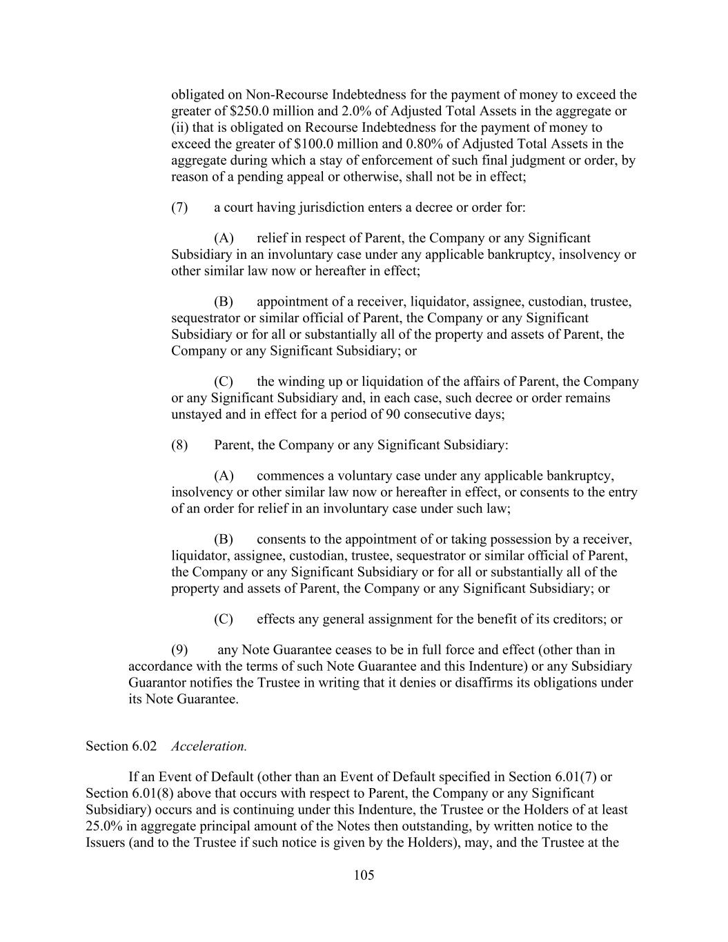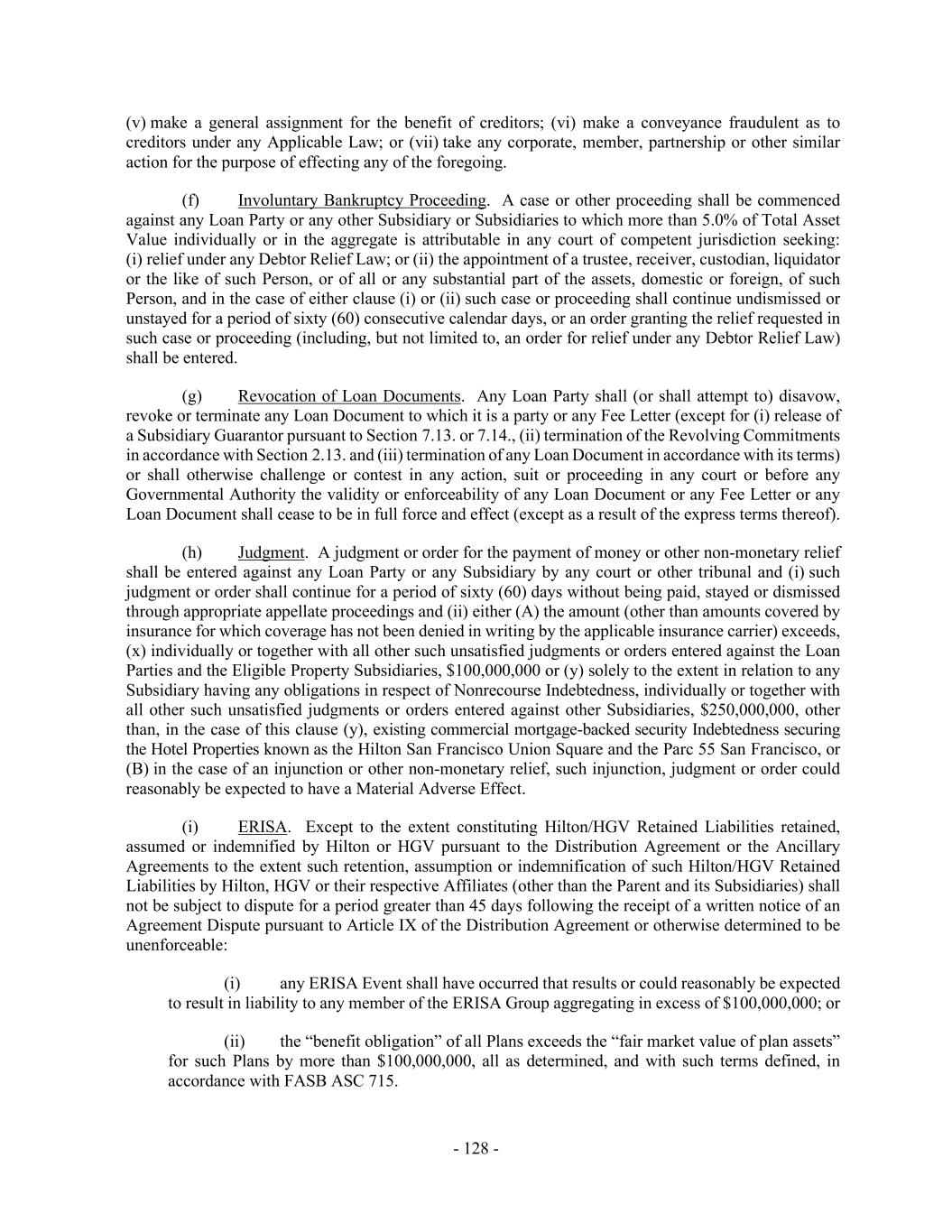 - 128 - (v) make a general assignment for the benefit of creditors; (vi) make a conveyance fraudulent as to creditors under any Applicable Law; or (vii) take any corporate, member, partnership or other similar action for the purpose of effecting any of the foregoing. (f) Involuntary Bankruptcy Proceeding. A case or other proceeding shall be commenced against any Loan Party or any other Subsidiary or Subsidiaries to which more than 5.0% of Total Asset Value individually or in the aggregate is attributable in any court of competent jurisdiction seeking: (i) relief under any Debtor Relief Law; or (ii) the appointment of a trustee, receiver, custodian, liquidator or the like of such Person, or of all or any substantial part of the assets, domestic or foreign, of such Person, and in the case of either clause (i) or (ii) such case or proceeding shall continue undismissed or unstayed for a period of sixty (60) consecutive calendar days, or an order granting the relief requested in such case or proceeding (including, but not limited to, an order for relief under any Debtor Relief Law) shall be entered. (g) Revocation of Loan Documents. Any Loan Party shall (or shall attempt to) disavow, revoke or terminate any Loan Document to which it is a party or any Fee Letter (except for (i) release of a Subsidiary Guarantor pursuant to Section 7.13. or 7.14., (ii) termination of the Revolving Commitments in accordance with Section 2.13. and (iii) termination of any Loan Document in accordance with its terms) or shall otherwise challenge or contest in any action, suit or proceeding in any court or before any Governmental Authority the validity or enforceability of any Loan Document or any Fee Letter or any Loan Document shall cease to be in full force and effect (except as a result of the express terms thereof). (h) Judgment. A judgment or order for the payment of money or other non-monetary relief shall be entered against any Loan Party or any Subsidiary by any court or other tribunal and (i) such judgment or order shall continue for a period of sixty (60) days without being paid, stayed or dismissed through appropriate appellate proceedings and (ii) either (A) the amount (other than amounts covered by insurance for which coverage has not been denied in writing by the applicable insurance carrier) exceeds, (x) individually or together with all other such unsatisfied judgments or orders entered against the Loan Parties and the Eligible Property Subsidiaries, $100,000,000 or (y) solely to the extent in relation to any Subsidiary having any obligations in respect of Nonrecourse Indebtedness, individually or together with all other such unsatisfied judgments or orders entered against other Subsidiaries, $250,000,000, other than, in the case of this clause (y), existing commercial mortgage-backed security Indebtedness securing the Hotel Properties known as the Hilton San Francisco Union Square and the Parc 55 San Francisco, or (B) in the case of an injunction or other non-monetary relief, such injunction, judgment or order could reasonably be expected to have a Material Adverse Effect. (i) ERISA. Except to the extent constituting Hilton/HGV Retained Liabilities retained, assumed or indemnified by Hilton or HGV pursuant to the Distribution Agreement or the Ancillary Agreements to the extent such retention, assumption or indemnification of such Hilton/HGV Retained Liabilities by Hilton, HGV or their respective Affiliates (other than the Parent and its Subsidiaries) shall not be subject to dispute for a period greater than 45 days following the receipt of a written notice of an Agreement Dispute pursuant to Article IX of the Distribution Agreement or otherwise determined to be unenforceable: (i) any ERISA Event shall have occurred that results or could reasonably be expected to result in liability to any member of the ERISA Group aggregating in excess of $100,000,000; or (ii) the “benefit obligation” of all Plans exceeds the “fair market value of plan assets” for such Plans by more than $100,000,000, all as determined, and with such terms defined, in accordance with FASB ASC 715.