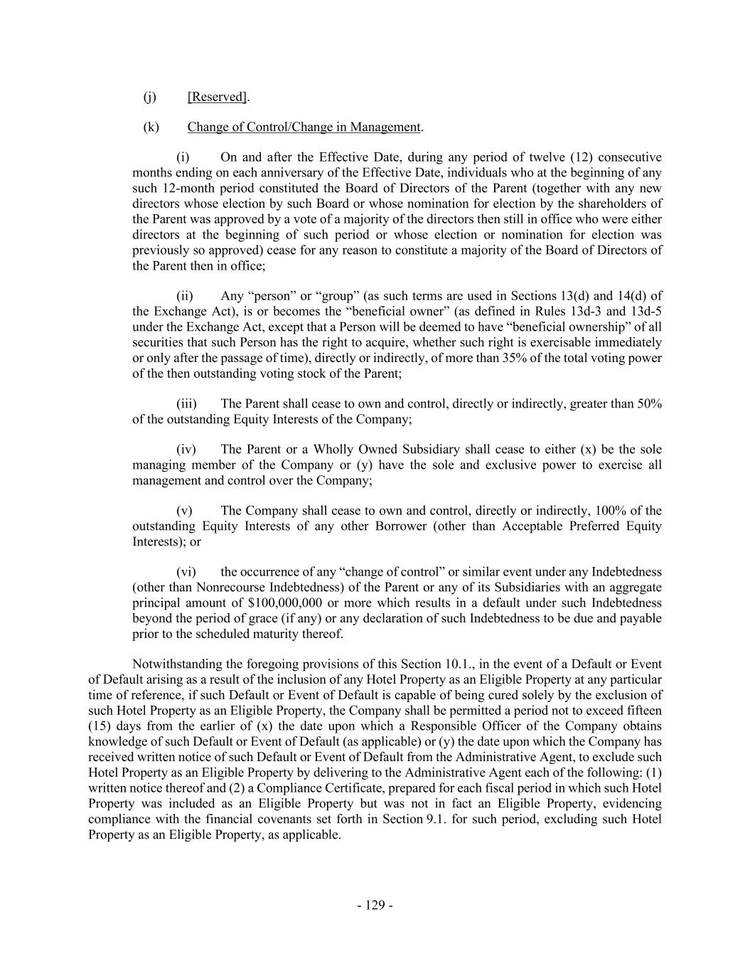 - 129 - (j) [Reserved]. (k) Change of Control/Change in Management. (i) On and after the Effective Date, during any period of twelve (12) consecutive months ending on each anniversary of the Effective Date, individuals who at the beginning of any such 12-month period constituted the Board of Directors of the Parent (together with any new directors whose election by such Board or whose nomination for election by the shareholders of the Parent was approved by a vote of a majority of the directors then still in office who were either directors at the beginning of such period or whose election or nomination for election was previously so approved) cease for any reason to constitute a majority of the Board of Directors of the Parent then in office; (ii) Any “person” or “group” (as such terms are used in Sections 13(d) and 14(d) of the Exchange Act), is or becomes the “beneficial owner” (as defined in Rules 13d-3 and 13d-5 under the Exchange Act, except that a Person will be deemed to have “beneficial ownership” of all securities that such Person has the right to acquire, whether such right is exercisable immediately or only after the passage of time), directly or indirectly, of more than 35% of the total voting power of the then outstanding voting stock of the Parent; (iii) The Parent shall cease to own and control, directly or indirectly, greater than 50% of the outstanding Equity Interests of the Company; (iv) The Parent or a Wholly Owned Subsidiary shall cease to either (x) be the sole managing member of the Company or (y) have the sole and exclusive power to exercise all management and control over the Company; (v) The Company shall cease to own and control, directly or indirectly, 100% of the outstanding Equity Interests of any other Borrower (other than Acceptable Preferred Equity Interests); or (vi) the occurrence of any “change of control” or similar event under any Indebtedness (other than Nonrecourse Indebtedness) of the Parent or any of its Subsidiaries with an aggregate principal amount of $100,000,000 or more which results in a default under such Indebtedness beyond the period of grace (if any) or any declaration of such Indebtedness to be due and payable prior to the scheduled maturity thereof. Notwithstanding the foregoing provisions of this Section 10.1., in the event of a Default or Event of Default arising as a result of the inclusion of any Hotel Property as an Eligible Property at any particular time of reference, if such Default or Event of Default is capable of being cured solely by the exclusion of such Hotel Property as an Eligible Property, the Company shall be permitted a period not to exceed fifteen (15) days from the earlier of (x) the date upon which a Responsible Officer of the Company obtains knowledge of such Default or Event of Default (as applicable) or (y) the date upon which the Company has received written notice of such Default or Event of Default from the Administrative Agent, to exclude such Hotel Property as an Eligible Property by delivering to the Administrative Agent each of the following: (1) written notice thereof and (2) a Compliance Certificate, prepared for each fiscal period in which such Hotel Property was included as an Eligible Property but was not in fact an Eligible Property, evidencing compliance with the financial covenants set forth in Section 9.1. for such period, excluding such Hotel Property as an Eligible Property, as applicable.