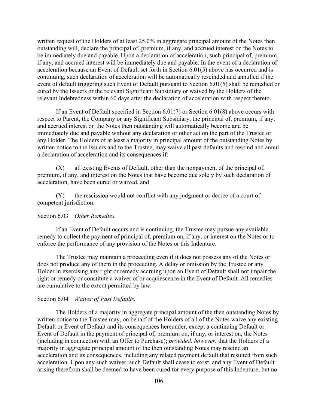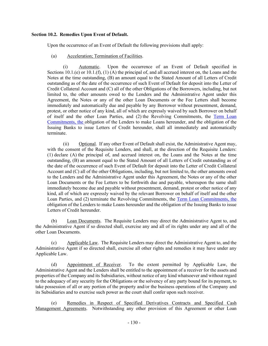 - 130 - Section 10.2. Remedies Upon Event of Default. Upon the occurrence of an Event of Default the following provisions shall apply: (a) Acceleration; Termination of Facilities. (i) Automatic. Upon the occurrence of an Event of Default specified in Sections 10.1.(e) or 10.1.(f), (1) (A) the principal of, and all accrued interest on, the Loans and the Notes at the time outstanding, (B) an amount equal to the Stated Amount of all Letters of Credit outstanding as of the date of the occurrence of such Event of Default for deposit into the Letter of Credit Collateral Account and (C) all of the other Obligations of the Borrowers, including, but not limited to, the other amounts owed to the Lenders and the Administrative Agent under this Agreement, the Notes or any of the other Loan Documents or the Fee Letters shall become immediately and automatically due and payable by any Borrower without presentment, demand, protest, or other notice of any kind, all of which are expressly waived by such Borrower on behalf of itself and the other Loan Parties, and (2) the Revolving Commitments, the Term Loan Commitments, the obligation of the Lenders to make Loans hereunder, and the obligation of the Issuing Banks to issue Letters of Credit hereunder, shall all immediately and automatically terminate. (ii) Optional. If any other Event of Default shall exist, the Administrative Agent may, with the consent of the Requisite Lenders, and shall, at the direction of the Requisite Lenders: (1) declare (A) the principal of, and accrued interest on, the Loans and the Notes at the time outstanding, (B) an amount equal to the Stated Amount of all Letters of Credit outstanding as of the date of the occurrence of such Event of Default for deposit into the Letter of Credit Collateral Account and (C) all of the other Obligations, including, but not limited to, the other amounts owed to the Lenders and the Administrative Agent under this Agreement, the Notes or any of the other Loan Documents or the Fee Letters to be forthwith due and payable, whereupon the same shall immediately become due and payable without presentment, demand, protest or other notice of any kind, all of which are expressly waived by the relevant Borrower on behalf of itself and the other Loan Parties, and (2) terminate the Revolving Commitments, the Term Loan Commitments, the obligation of the Lenders to make Loans hereunder and the obligation of the Issuing Banks to issue Letters of Credit hereunder. (b) Loan Documents. The Requisite Lenders may direct the Administrative Agent to, and the Administrative Agent if so directed shall, exercise any and all of its rights under any and all of the other Loan Documents. (c) Applicable Law. The Requisite Lenders may direct the Administrative Agent to, and the Administrative Agent if so directed shall, exercise all other rights and remedies it may have under any Applicable Law. (d) Appointment of Receiver. To the extent permitted by Applicable Law, the Administrative Agent and the Lenders shall be entitled to the appointment of a receiver for the assets and properties of the Company and its Subsidiaries, without notice of any kind whatsoever and without regard to the adequacy of any security for the Obligations or the solvency of any party bound for its payment, to take possession of all or any portion of the property and/or the business operations of the Company and its Subsidiaries and to exercise such power as the court shall confer upon such receiver. (e) Remedies in Respect of Specified Derivatives Contracts and Specified Cash Management Agreements. Notwithstanding any other provision of this Agreement or other Loan