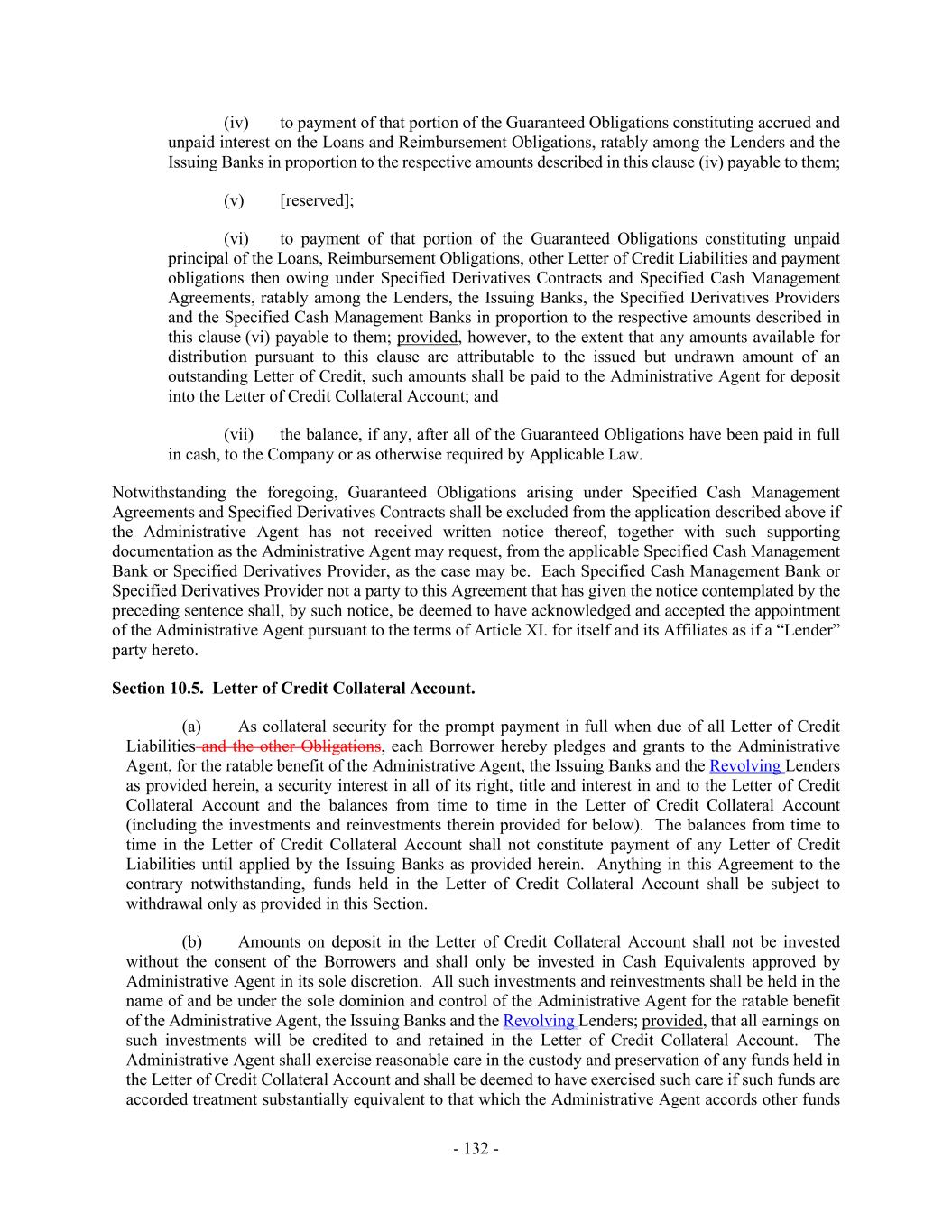 - 132 - (iv) to payment of that portion of the Guaranteed Obligations constituting accrued and unpaid interest on the Loans and Reimbursement Obligations, ratably among the Lenders and the Issuing Banks in proportion to the respective amounts described in this clause (iv) payable to them; (v) [reserved]; (vi) to payment of that portion of the Guaranteed Obligations constituting unpaid principal of the Loans, Reimbursement Obligations, other Letter of Credit Liabilities and payment obligations then owing under Specified Derivatives Contracts and Specified Cash Management Agreements, ratably among the Lenders, the Issuing Banks, the Specified Derivatives Providers and the Specified Cash Management Banks in proportion to the respective amounts described in this clause (vi) payable to them; provided, however, to the extent that any amounts available for distribution pursuant to this clause are attributable to the issued but undrawn amount of an outstanding Letter of Credit, such amounts shall be paid to the Administrative Agent for deposit into the Letter of Credit Collateral Account; and (vii) the balance, if any, after all of the Guaranteed Obligations have been paid in full in cash, to the Company or as otherwise required by Applicable Law. Notwithstanding the foregoing, Guaranteed Obligations arising under Specified Cash Management Agreements and Specified Derivatives Contracts shall be excluded from the application described above if the Administrative Agent has not received written notice thereof, together with such supporting documentation as the Administrative Agent may request, from the applicable Specified Cash Management Bank or Specified Derivatives Provider, as the case may be. Each Specified Cash Management Bank or Specified Derivatives Provider not a party to this Agreement that has given the notice contemplated by the preceding sentence shall, by such notice, be deemed to have acknowledged and accepted the appointment of the Administrative Agent pursuant to the terms of Article XI. for itself and its Affiliates as if a “Lender” party hereto. Section 10.5. Letter of Credit Collateral Account. (a) As collateral security for the prompt payment in full when due of all Letter of Credit Liabilities and the other Obligations, each Borrower hereby pledges and grants to the Administrative Agent, for the ratable benefit of the Administrative Agent, the Issuing Banks and the Revolving Lenders as provided herein, a security interest in all of its right, title and interest in and to the Letter of Credit Collateral Account and the balances from time to time in the Letter of Credit Collateral Account (including the investments and reinvestments therein provided for below). The balances from time to time in the Letter of Credit Collateral Account shall not constitute payment of any Letter of Credit Liabilities until applied by the Issuing Banks as provided herein. Anything in this Agreement to the contrary notwithstanding, funds held in the Letter of Credit Collateral Account shall be subject to withdrawal only as provided in this Section. (b) Amounts on deposit in the Letter of Credit Collateral Account shall not be invested without the consent of the Borrowers and shall only be invested in Cash Equivalents approved by Administrative Agent in its sole discretion. All such investments and reinvestments shall be held in the name of and be under the sole dominion and control of the Administrative Agent for the ratable benefit of the Administrative Agent, the Issuing Banks and the Revolving Lenders; provided, that all earnings on such investments will be credited to and retained in the Letter of Credit Collateral Account. The Administrative Agent shall exercise reasonable care in the custody and preservation of any funds held in the Letter of Credit Collateral Account and shall be deemed to have exercised such care if such funds are accorded treatment substantially equivalent to that which the Administrative Agent accords other funds