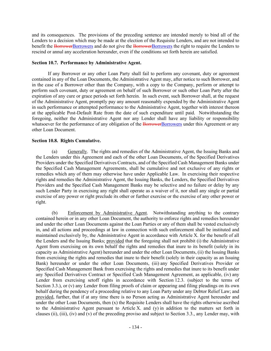 - 134 - and its consequences. The provisions of the preceding sentence are intended merely to bind all of the Lenders to a decision which may be made at the election of the Requisite Lenders, and are not intended to benefit the BorrowerBorrowers and do not give the BorrowerBorrowers the right to require the Lenders to rescind or annul any acceleration hereunder, even if the conditions set forth herein are satisfied. Section 10.7. Performance by Administrative Agent. If any Borrower or any other Loan Party shall fail to perform any covenant, duty or agreement contained in any of the Loan Documents, the Administrative Agent may, after notice to such Borrower, and in the case of a Borrower other than the Company, with a copy to the Company, perform or attempt to perform such covenant, duty or agreement on behalf of such Borrower or such other Loan Party after the expiration of any cure or grace periods set forth herein. In such event, such Borrower shall, at the request of the Administrative Agent, promptly pay any amount reasonably expended by the Administrative Agent in such performance or attempted performance to the Administrative Agent, together with interest thereon at the applicable Post-Default Rate from the date of such expenditure until paid. Notwithstanding the foregoing, neither the Administrative Agent nor any Lender shall have any liability or responsibility whatsoever for the performance of any obligation of the BorrowerBorrowers under this Agreement or any other Loan Document. Section 10.8. Rights Cumulative. (a) Generally. The rights and remedies of the Administrative Agent, the Issuing Banks and the Lenders under this Agreement and each of the other Loan Documents, of the Specified Derivatives Providers under the Specified Derivatives Contracts, and of the Specified Cash Management Banks under the Specified Cash Management Agreements, shall be cumulative and not exclusive of any rights or remedies which any of them may otherwise have under Applicable Law. In exercising their respective rights and remedies the Administrative Agent, the Issuing Banks, the Lenders, the Specified Derivatives Providers and the Specified Cash Management Banks may be selective and no failure or delay by any such Lender Party in exercising any right shall operate as a waiver of it, nor shall any single or partial exercise of any power or right preclude its other or further exercise or the exercise of any other power or right. (b) Enforcement by Administrative Agent. Notwithstanding anything to the contrary contained herein or in any other Loan Document, the authority to enforce rights and remedies hereunder and under the other Loan Documents against the Loan Parties or any of them shall be vested exclusively in, and all actions and proceedings at law in connection with such enforcement shall be instituted and maintained exclusively by, the Administrative Agent in accordance with Article X. for the benefit of all the Lenders and the Issuing Banks; provided that the foregoing shall not prohibit (i) the Administrative Agent from exercising on its own behalf the rights and remedies that inure to its benefit (solely in its capacity as Administrative Agent) hereunder and under the other Loan Documents, (ii) the Issuing Banks from exercising the rights and remedies that inure to their benefit (solely in their capacity as an Issuing Bank) hereunder or under the other Loan Documents, (iii) any Specified Derivatives Provider or Specified Cash Management Bank from exercising the rights and remedies that inure to its benefit under any Specified Derivatives Contract or Specified Cash Management Agreement, as applicable, (iv) any Lender from exercising setoff rights in accordance with Section 12.3. (subject to the terms of Section 3.3.), or (v) any Lender from filing proofs of claim or appearing and filing pleadings on its own behalf during the pendency of a proceeding relative to any Loan Party under any Debtor Relief Law; and provided, further, that if at any time there is no Person acting as Administrative Agent hereunder and under the other Loan Documents, then (x) the Requisite Lenders shall have the rights otherwise ascribed to the Administrative Agent pursuant to Article X. and (y) in addition to the matters set forth in clauses (ii), (iii), (iv) and (v) of the preceding proviso and subject to Section 3.3., any Lender may, with
