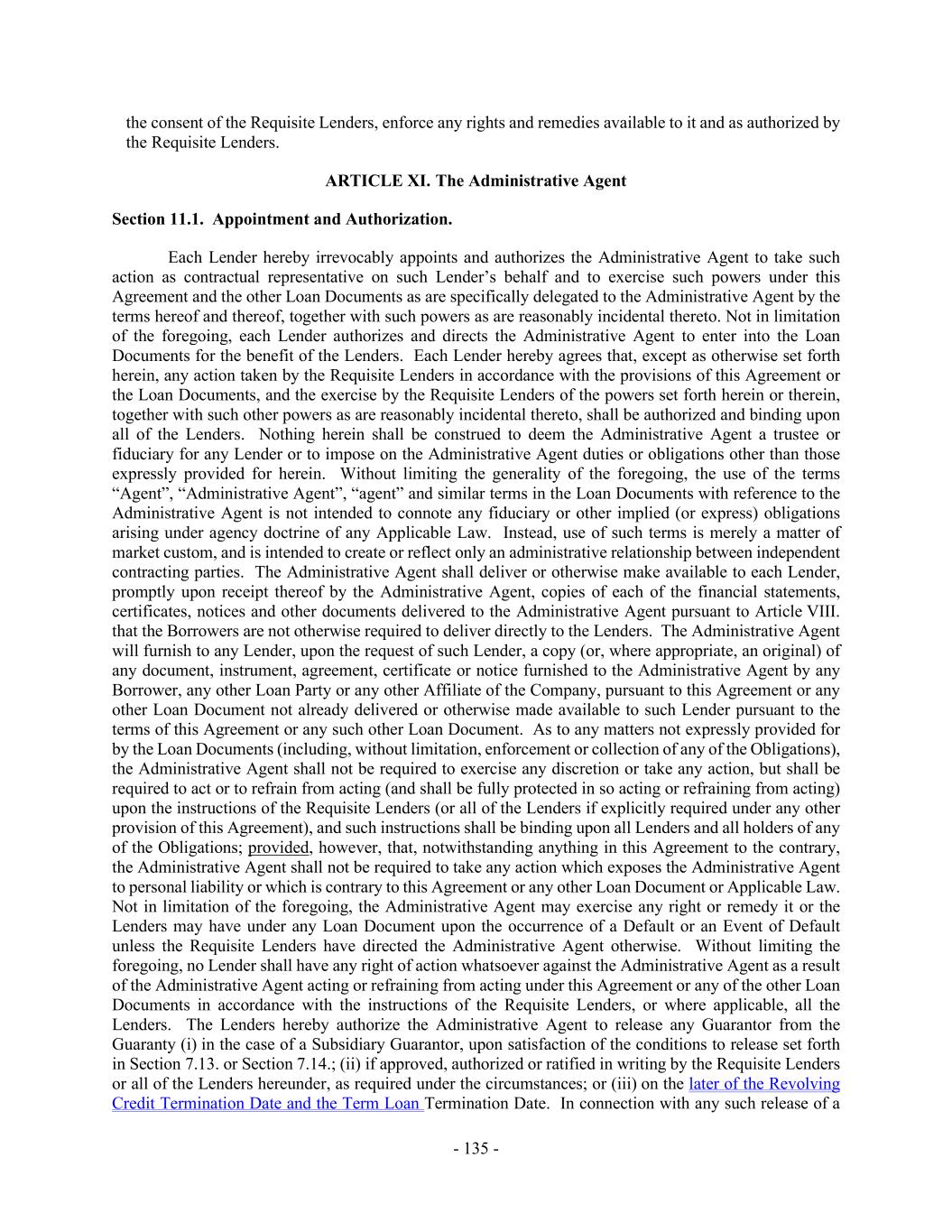 - 135 - the consent of the Requisite Lenders, enforce any rights and remedies available to it and as authorized by the Requisite Lenders. ARTICLE XI. The Administrative Agent Section 11.1. Appointment and Authorization. Each Lender hereby irrevocably appoints and authorizes the Administrative Agent to take such action as contractual representative on such Lender’s behalf and to exercise such powers under this Agreement and the other Loan Documents as are specifically delegated to the Administrative Agent by the terms hereof and thereof, together with such powers as are reasonably incidental thereto. Not in limitation of the foregoing, each Lender authorizes and directs the Administrative Agent to enter into the Loan Documents for the benefit of the Lenders. Each Lender hereby agrees that, except as otherwise set forth herein, any action taken by the Requisite Lenders in accordance with the provisions of this Agreement or the Loan Documents, and the exercise by the Requisite Lenders of the powers set forth herein or therein, together with such other powers as are reasonably incidental thereto, shall be authorized and binding upon all of the Lenders. Nothing herein shall be construed to deem the Administrative Agent a trustee or fiduciary for any Lender or to impose on the Administrative Agent duties or obligations other than those expressly provided for herein. Without limiting the generality of the foregoing, the use of the terms “Agent”, “Administrative Agent”, “agent” and similar terms in the Loan Documents with reference to the Administrative Agent is not intended to connote any fiduciary or other implied (or express) obligations arising under agency doctrine of any Applicable Law. Instead, use of such terms is merely a matter of market custom, and is intended to create or reflect only an administrative relationship between independent contracting parties. The Administrative Agent shall deliver or otherwise make available to each Lender, promptly upon receipt thereof by the Administrative Agent, copies of each of the financial statements, certificates, notices and other documents delivered to the Administrative Agent pursuant to Article VIII. that the Borrowers are not otherwise required to deliver directly to the Lenders. The Administrative Agent will furnish to any Lender, upon the request of such Lender, a copy (or, where appropriate, an original) of any document, instrument, agreement, certificate or notice furnished to the Administrative Agent by any Borrower, any other Loan Party or any other Affiliate of the Company, pursuant to this Agreement or any other Loan Document not already delivered or otherwise made available to such Lender pursuant to the terms of this Agreement or any such other Loan Document. As to any matters not expressly provided for by the Loan Documents (including, without limitation, enforcement or collection of any of the Obligations), the Administrative Agent shall not be required to exercise any discretion or take any action, but shall be required to act or to refrain from acting (and shall be fully protected in so acting or refraining from acting) upon the instructions of the Requisite Lenders (or all of the Lenders if explicitly required under any other provision of this Agreement), and such instructions shall be binding upon all Lenders and all holders of any of the Obligations; provided, however, that, notwithstanding anything in this Agreement to the contrary, the Administrative Agent shall not be required to take any action which exposes the Administrative Agent to personal liability or which is contrary to this Agreement or any other Loan Document or Applicable Law. Not in limitation of the foregoing, the Administrative Agent may exercise any right or remedy it or the Lenders may have under any Loan Document upon the occurrence of a Default or an Event of Default unless the Requisite Lenders have directed the Administrative Agent otherwise. Without limiting the foregoing, no Lender shall have any right of action whatsoever against the Administrative Agent as a result of the Administrative Agent acting or refraining from acting under this Agreement or any of the other Loan Documents in accordance with the instructions of the Requisite Lenders, or where applicable, all the Lenders. The Lenders hereby authorize the Administrative Agent to release any Guarantor from the Guaranty (i) in the case of a Subsidiary Guarantor, upon satisfaction of the conditions to release set forth in Section 7.13. or Section 7.14.; (ii) if approved, authorized or ratified in writing by the Requisite Lenders or all of the Lenders hereunder, as required under the circumstances; or (iii) on the later of the Revolving Credit Termination Date and the Term Loan Termination Date. In connection with any such release of a