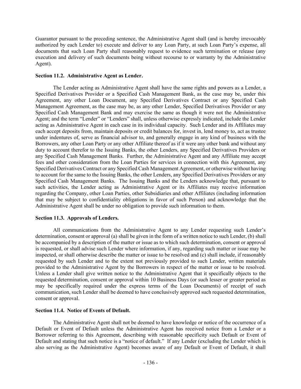 - 136 - Guarantor pursuant to the preceding sentence, the Administrative Agent shall (and is hereby irrevocably authorized by each Lender to) execute and deliver to any Loan Party, at such Loan Party’s expense, all documents that such Loan Party shall reasonably request to evidence such termination or release (any execution and delivery of such documents being without recourse to or warranty by the Administrative Agent). Section 11.2. Administrative Agent as Lender. The Lender acting as Administrative Agent shall have the same rights and powers as a Lender, a Specified Derivatives Provider or a Specified Cash Management Bank, as the case may be, under this Agreement, any other Loan Document, any Specified Derivatives Contract or any Specified Cash Management Agreement, as the case may be, as any other Lender, Specified Derivatives Provider or any Specified Cash Management Bank and may exercise the same as though it were not the Administrative Agent; and the term “Lender” or “Lenders” shall, unless otherwise expressly indicated, include the Lender acting as Administrative Agent in each case in its individual capacity. Such Lender and its Affiliates may each accept deposits from, maintain deposits or credit balances for, invest in, lend money to, act as trustee under indentures of, serve as financial advisor to, and generally engage in any kind of business with the Borrowers, any other Loan Party or any other Affiliate thereof as if it were any other bank and without any duty to account therefor to the Issuing Banks, the other Lenders, any Specified Derivatives Providers or any Specified Cash Management Banks. Further, the Administrative Agent and any Affiliate may accept fees and other consideration from the Loan Parties for services in connection with this Agreement, any Specified Derivatives Contract or any Specified Cash Management Agreement, or otherwise without having to account for the same to the Issuing Banks, the other Lenders, any Specified Derivatives Providers or any Specified Cash Management Banks. The Issuing Banks and the Lenders acknowledge that, pursuant to such activities, the Lender acting as Administrative Agent or its Affiliates may receive information regarding the Company, other Loan Parties, other Subsidiaries and other Affiliates (including information that may be subject to confidentiality obligations in favor of such Person) and acknowledge that the Administrative Agent shall be under no obligation to provide such information to them. Section 11.3. Approvals of Lenders. All communications from the Administrative Agent to any Lender requesting such Lender’s determination, consent or approval (a) shall be given in the form of a written notice to such Lender, (b) shall be accompanied by a description of the matter or issue as to which such determination, consent or approval is requested, or shall advise such Lender where information, if any, regarding such matter or issue may be inspected, or shall otherwise describe the matter or issue to be resolved and (c) shall include, if reasonably requested by such Lender and to the extent not previously provided to such Lender, written materials provided to the Administrative Agent by the Borrowers in respect of the matter or issue to be resolved. Unless a Lender shall give written notice to the Administrative Agent that it specifically objects to the requested determination, consent or approval within 10 Business Days (or such lesser or greater period as may be specifically required under the express terms of the Loan Documents) of receipt of such communication, such Lender shall be deemed to have conclusively approved such requested determination, consent or approval. Section 11.4. Notice of Events of Default. The Administrative Agent shall not be deemed to have knowledge or notice of the occurrence of a Default or Event of Default unless the Administrative Agent has received notice from a Lender or a Borrower referring to this Agreement, describing with reasonable specificity such Default or Event of Default and stating that such notice is a “notice of default.” If any Lender (excluding the Lender which is also serving as the Administrative Agent) becomes aware of any Default or Event of Default, it shall