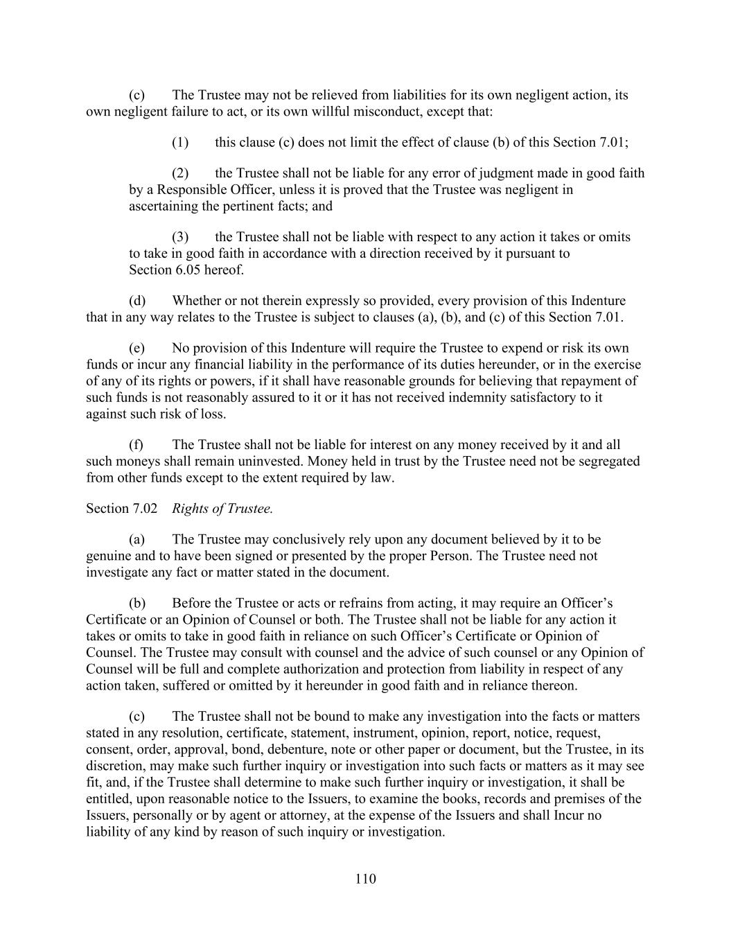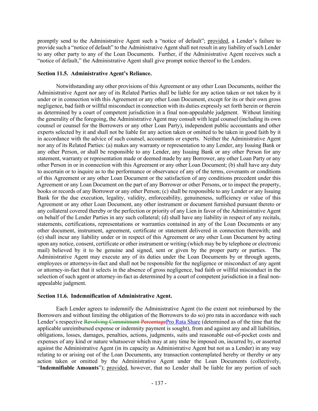 - 137 - promptly send to the Administrative Agent such a “notice of default”; provided, a Lender’s failure to provide such a “notice of default” to the Administrative Agent shall not result in any liability of such Lender to any other party to any of the Loan Documents. Further, if the Administrative Agent receives such a “notice of default,” the Administrative Agent shall give prompt notice thereof to the Lenders. Section 11.5. Administrative Agent’s Reliance. Notwithstanding any other provisions of this Agreement or any other Loan Documents, neither the Administrative Agent nor any of its Related Parties shall be liable for any action taken or not taken by it under or in connection with this Agreement or any other Loan Document, except for its or their own gross negligence, bad faith or willful misconduct in connection with its duties expressly set forth herein or therein as determined by a court of competent jurisdiction in a final non-appealable judgment. Without limiting the generality of the foregoing, the Administrative Agent may consult with legal counsel (including its own counsel or counsel for the Borrowers or any other Loan Party), independent public accountants and other experts selected by it and shall not be liable for any action taken or omitted to be taken in good faith by it in accordance with the advice of such counsel, accountants or experts. Neither the Administrative Agent nor any of its Related Parties: (a) makes any warranty or representation to any Lender, any Issuing Bank or any other Person, or shall be responsible to any Lender, any Issuing Bank or any other Person for any statement, warranty or representation made or deemed made by any Borrower, any other Loan Party or any other Person in or in connection with this Agreement or any other Loan Document; (b) shall have any duty to ascertain or to inquire as to the performance or observance of any of the terms, covenants or conditions of this Agreement or any other Loan Document or the satisfaction of any conditions precedent under this Agreement or any Loan Document on the part of any Borrower or other Persons, or to inspect the property, books or records of any Borrower or any other Person; (c) shall be responsible to any Lender or any Issuing Bank for the due execution, legality, validity, enforceability, genuineness, sufficiency or value of this Agreement or any other Loan Document, any other instrument or document furnished pursuant thereto or any collateral covered thereby or the perfection or priority of any Lien in favor of the Administrative Agent on behalf of the Lender Parties in any such collateral; (d) shall have any liability in respect of any recitals, statements, certifications, representations or warranties contained in any of the Loan Documents or any other document, instrument, agreement, certificate or statement delivered in connection therewith; and (e) shall incur any liability under or in respect of this Agreement or any other Loan Document by acting upon any notice, consent, certificate or other instrument or writing (which may be by telephone or electronic mail) believed by it to be genuine and signed, sent or given by the proper party or parties. The Administrative Agent may execute any of its duties under the Loan Documents by or through agents, employees or attorneys-in-fact and shall not be responsible for the negligence or misconduct of any agent or attorney-in-fact that it selects in the absence of gross negligence, bad faith or willful misconduct in the selection of such agent or attorney-in-fact as determined by a court of competent jurisdiction in a final non- appealable judgment. Section 11.6. Indemnification of Administrative Agent. Each Lender agrees to indemnify the Administrative Agent (to the extent not reimbursed by the Borrowers and without limiting the obligation of the Borrowers to do so) pro rata in accordance with such Lender’s respective Revolving Commitment PercentagePro Rata Share (determined as of the time that the applicable unreimbursed expense or indemnity payment is sought), from and against any and all liabilities, obligations, losses, damages, penalties, actions, judgments, suits and reasonable out-of-pocket costs and expenses of any kind or nature whatsoever which may at any time be imposed on, incurred by, or asserted against the Administrative Agent (in its capacity as Administrative Agent but not as a Lender) in any way relating to or arising out of the Loan Documents, any transaction contemplated hereby or thereby or any action taken or omitted by the Administrative Agent under the Loan Documents (collectively, “Indemnifiable Amounts”); provided, however, that no Lender shall be liable for any portion of such