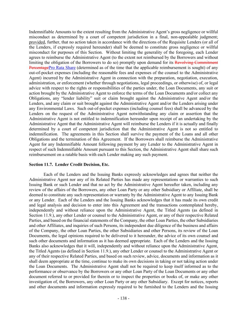 - 138 - Indemnifiable Amounts to the extent resulting from the Administrative Agent’s gross negligence or willful misconduct as determined by a court of competent jurisdiction in a final, non-appealable judgment; provided, further, that no action taken in accordance with the directions of the Requisite Lenders (or all of the Lenders, if expressly required hereunder) shall be deemed to constitute gross negligence or willful misconduct for purposes of this Section. Without limiting the generality of the foregoing, each Lender agrees to reimburse the Administrative Agent (to the extent not reimbursed by the Borrowers and without limiting the obligation of the Borrowers to do so) promptly upon demand for its Revolving Commitment PercentagePro Rata Share (determined as of the time that the applicable reimbursement is sought) of any out-of-pocket expenses (including the reasonable fees and expenses of the counsel to the Administrative Agent) incurred by the Administrative Agent in connection with the preparation, negotiation, execution, administration, or enforcement (whether through negotiations, legal proceedings, or otherwise) of, or legal advice with respect to the rights or responsibilities of the parties under, the Loan Documents, any suit or action brought by the Administrative Agent to enforce the terms of the Loan Documents and/or collect any Obligations, any “lender liability” suit or claim brought against the Administrative Agent and/or the Lenders, and any claim or suit brought against the Administrative Agent and/or the Lenders arising under any Environmental Laws. Such out-of-pocket expenses (including counsel fees) shall be advanced by the Lenders on the request of the Administrative Agent notwithstanding any claim or assertion that the Administrative Agent is not entitled to indemnification hereunder upon receipt of an undertaking by the Administrative Agent that the Administrative Agent will reimburse the Lenders if it is actually and finally determined by a court of competent jurisdiction that the Administrative Agent is not so entitled to indemnification. The agreements in this Section shall survive the payment of the Loans and all other Obligations and the termination of this Agreement. If the Borrowers shall reimburse the Administrative Agent for any Indemnifiable Amount following payment by any Lender to the Administrative Agent in respect of such Indemnifiable Amount pursuant to this Section, the Administrative Agent shall share such reimbursement on a ratable basis with each Lender making any such payment. Section 11.7. Lender Credit Decision, Etc. Each of the Lenders and the Issuing Banks expressly acknowledges and agrees that neither the Administrative Agent nor any of its Related Parties has made any representations or warranties to such Issuing Bank or such Lender and that no act by the Administrative Agent hereafter taken, including any review of the affairs of the Borrowers, any other Loan Party or any other Subsidiary or Affiliate, shall be deemed to constitute any such representation or warranty by the Administrative Agent to any Issuing Bank or any Lender. Each of the Lenders and the Issuing Banks acknowledges that it has made its own credit and legal analysis and decision to enter into this Agreement and the transactions contemplated hereby, independently and without reliance upon the Administrative Agent, the Titled Agents (as defined in Section 11.9.), any other Lender or counsel to the Administrative Agent, or any of their respective Related Parties, and based on the financial statements of the Company, the other Loan Parties, the other Subsidiaries and other Affiliates, and inquiries of such Persons, its independent due diligence of the business and affairs of the Company, the other Loan Parties, the other Subsidiaries and other Persons, its review of the Loan Documents, the legal opinions required to be delivered to it hereunder, the advice of its own counsel and such other documents and information as it has deemed appropriate. Each of the Lenders and the Issuing Banks also acknowledges that it will, independently and without reliance upon the Administrative Agent, the Titled Agents (as defined in Section 11.9.), any other Lender or counsel to the Administrative Agent or any of their respective Related Parties, and based on such review, advice, documents and information as it shall deem appropriate at the time, continue to make its own decisions in taking or not taking action under the Loan Documents. The Administrative Agent shall not be required to keep itself informed as to the performance or observance by the Borrowers or any other Loan Party of the Loan Documents or any other document referred to or provided for therein or to inspect the properties or books of, or make any other investigation of, the Borrowers, any other Loan Party or any other Subsidiary. Except for notices, reports and other documents and information expressly required to be furnished to the Lenders and the Issuing