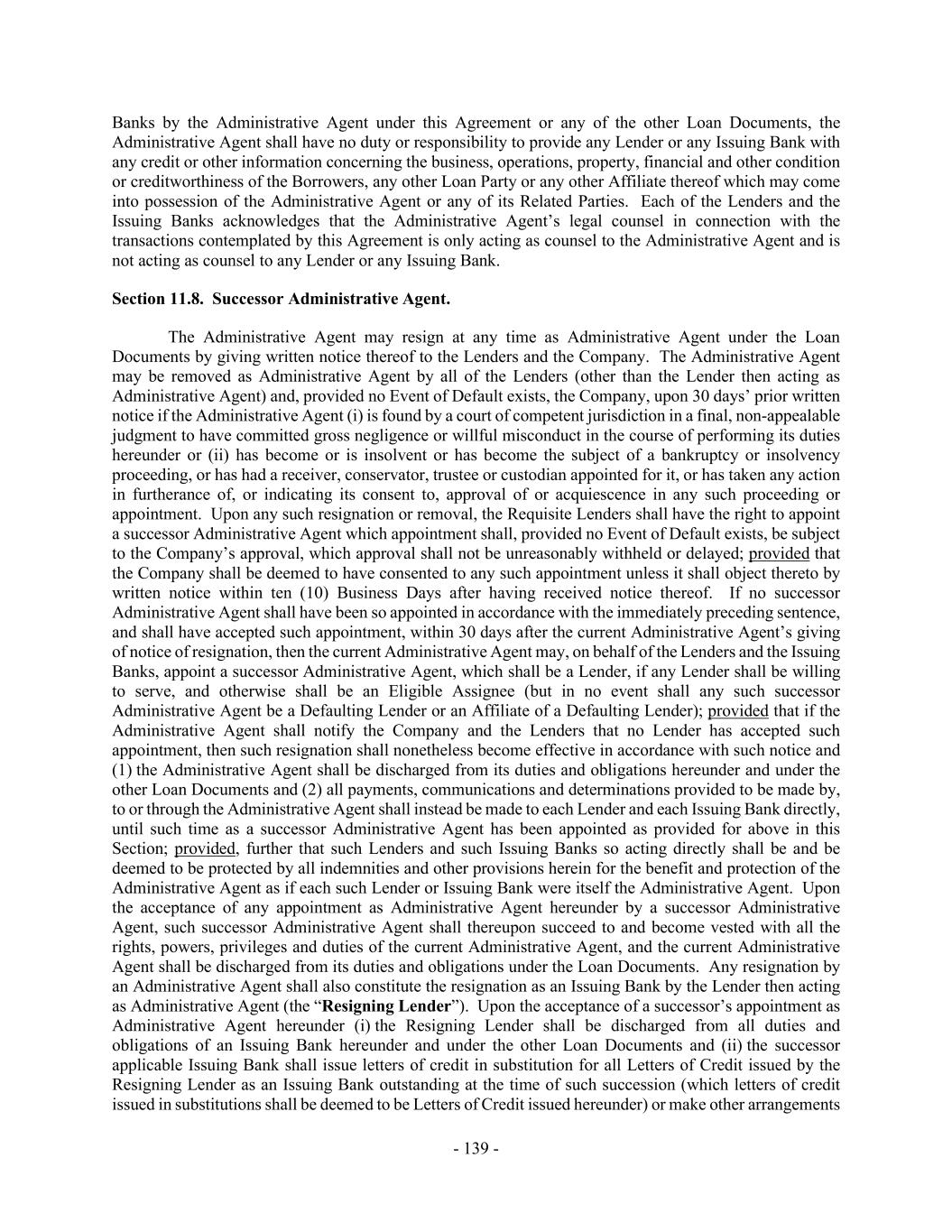 - 139 - Banks by the Administrative Agent under this Agreement or any of the other Loan Documents, the Administrative Agent shall have no duty or responsibility to provide any Lender or any Issuing Bank with any credit or other information concerning the business, operations, property, financial and other condition or creditworthiness of the Borrowers, any other Loan Party or any other Affiliate thereof which may come into possession of the Administrative Agent or any of its Related Parties. Each of the Lenders and the Issuing Banks acknowledges that the Administrative Agent’s legal counsel in connection with the transactions contemplated by this Agreement is only acting as counsel to the Administrative Agent and is not acting as counsel to any Lender or any Issuing Bank. Section 11.8. Successor Administrative Agent. The Administrative Agent may resign at any time as Administrative Agent under the Loan Documents by giving written notice thereof to the Lenders and the Company. The Administrative Agent may be removed as Administrative Agent by all of the Lenders (other than the Lender then acting as Administrative Agent) and, provided no Event of Default exists, the Company, upon 30 days’ prior written notice if the Administrative Agent (i) is found by a court of competent jurisdiction in a final, non-appealable judgment to have committed gross negligence or willful misconduct in the course of performing its duties hereunder or (ii) has become or is insolvent or has become the subject of a bankruptcy or insolvency proceeding, or has had a receiver, conservator, trustee or custodian appointed for it, or has taken any action in furtherance of, or indicating its consent to, approval of or acquiescence in any such proceeding or appointment. Upon any such resignation or removal, the Requisite Lenders shall have the right to appoint a successor Administrative Agent which appointment shall, provided no Event of Default exists, be subject to the Company’s approval, which approval shall not be unreasonably withheld or delayed; provided that the Company shall be deemed to have consented to any such appointment unless it shall object thereto by written notice within ten (10) Business Days after having received notice thereof. If no successor Administrative Agent shall have been so appointed in accordance with the immediately preceding sentence, and shall have accepted such appointment, within 30 days after the current Administrative Agent’s giving of notice of resignation, then the current Administrative Agent may, on behalf of the Lenders and the Issuing Banks, appoint a successor Administrative Agent, which shall be a Lender, if any Lender shall be willing to serve, and otherwise shall be an Eligible Assignee (but in no event shall any such successor Administrative Agent be a Defaulting Lender or an Affiliate of a Defaulting Lender); provided that if the Administrative Agent shall notify the Company and the Lenders that no Lender has accepted such appointment, then such resignation shall nonetheless become effective in accordance with such notice and (1) the Administrative Agent shall be discharged from its duties and obligations hereunder and under the other Loan Documents and (2) all payments, communications and determinations provided to be made by, to or through the Administrative Agent shall instead be made to each Lender and each Issuing Bank directly, until such time as a successor Administrative Agent has been appointed as provided for above in this Section; provided, further that such Lenders and such Issuing Banks so acting directly shall be and be deemed to be protected by all indemnities and other provisions herein for the benefit and protection of the Administrative Agent as if each such Lender or Issuing Bank were itself the Administrative Agent. Upon the acceptance of any appointment as Administrative Agent hereunder by a successor Administrative Agent, such successor Administrative Agent shall thereupon succeed to and become vested with all the rights, powers, privileges and duties of the current Administrative Agent, and the current Administrative Agent shall be discharged from its duties and obligations under the Loan Documents. Any resignation by an Administrative Agent shall also constitute the resignation as an Issuing Bank by the Lender then acting as Administrative Agent (the “Resigning Lender”). Upon the acceptance of a successor’s appointment as Administrative Agent hereunder (i) the Resigning Lender shall be discharged from all duties and obligations of an Issuing Bank hereunder and under the other Loan Documents and (ii) the successor applicable Issuing Bank shall issue letters of credit in substitution for all Letters of Credit issued by the Resigning Lender as an Issuing Bank outstanding at the time of such succession (which letters of credit issued in substitutions shall be deemed to be Letters of Credit issued hereunder) or make other arrangements