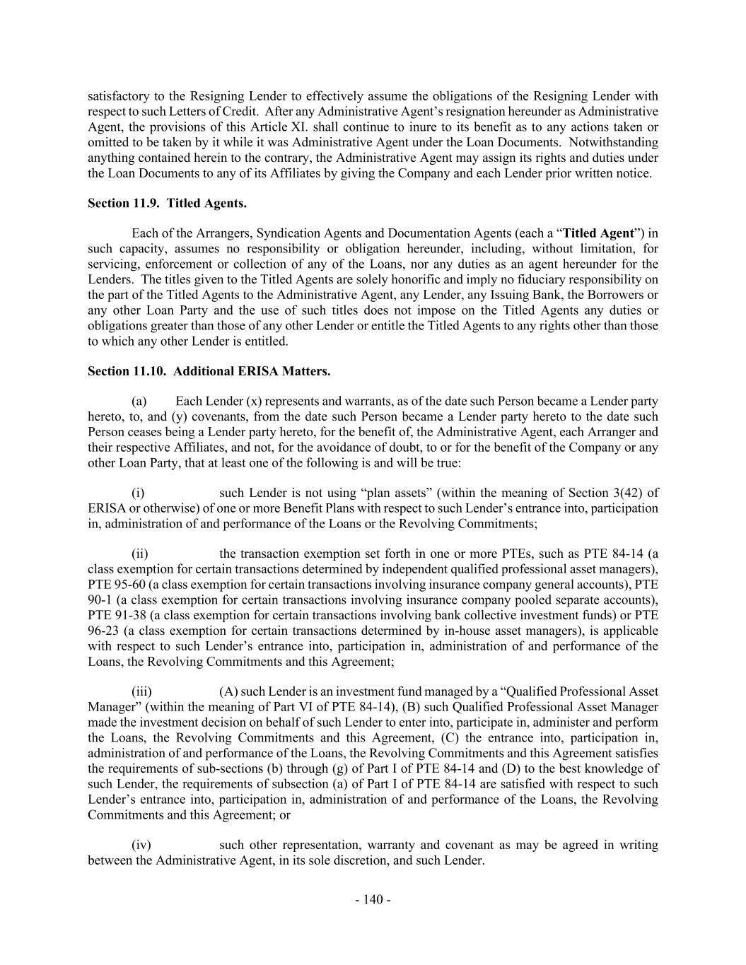 - 140 - satisfactory to the Resigning Lender to effectively assume the obligations of the Resigning Lender with respect to such Letters of Credit. After any Administrative Agent’s resignation hereunder as Administrative Agent, the provisions of this Article XI. shall continue to inure to its benefit as to any actions taken or omitted to be taken by it while it was Administrative Agent under the Loan Documents. Notwithstanding anything contained herein to the contrary, the Administrative Agent may assign its rights and duties under the Loan Documents to any of its Affiliates by giving the Company and each Lender prior written notice. Section 11.9. Titled Agents. Each of the Arrangers, Syndication Agents and Documentation Agents (each a “Titled Agent”) in such capacity, assumes no responsibility or obligation hereunder, including, without limitation, for servicing, enforcement or collection of any of the Loans, nor any duties as an agent hereunder for the Lenders. The titles given to the Titled Agents are solely honorific and imply no fiduciary responsibility on the part of the Titled Agents to the Administrative Agent, any Lender, any Issuing Bank, the Borrowers or any other Loan Party and the use of such titles does not impose on the Titled Agents any duties or obligations greater than those of any other Lender or entitle the Titled Agents to any rights other than those to which any other Lender is entitled. Section 11.10. Additional ERISA Matters. (a) Each Lender (x) represents and warrants, as of the date such Person became a Lender party hereto, to, and (y) covenants, from the date such Person became a Lender party hereto to the date such Person ceases being a Lender party hereto, for the benefit of, the Administrative Agent, each Arranger and their respective Affiliates, and not, for the avoidance of doubt, to or for the benefit of the Company or any other Loan Party, that at least one of the following is and will be true: (i) such Lender is not using “plan assets” (within the meaning of Section 3(42) of ERISA or otherwise) of one or more Benefit Plans with respect to such Lender’s entrance into, participation in, administration of and performance of the Loans or the Revolving Commitments; (ii) the transaction exemption set forth in one or more PTEs, such as PTE 84-14 (a class exemption for certain transactions determined by independent qualified professional asset managers), PTE 95-60 (a class exemption for certain transactions involving insurance company general accounts), PTE 90-1 (a class exemption for certain transactions involving insurance company pooled separate accounts), PTE 91-38 (a class exemption for certain transactions involving bank collective investment funds) or PTE 96-23 (a class exemption for certain transactions determined by in-house asset managers), is applicable with respect to such Lender’s entrance into, participation in, administration of and performance of the Loans, the Revolving Commitments and this Agreement; (iii) (A) such Lender is an investment fund managed by a “Qualified Professional Asset Manager” (within the meaning of Part VI of PTE 84-14), (B) such Qualified Professional Asset Manager made the investment decision on behalf of such Lender to enter into, participate in, administer and perform the Loans, the Revolving Commitments and this Agreement, (C) the entrance into, participation in, administration of and performance of the Loans, the Revolving Commitments and this Agreement satisfies the requirements of sub-sections (b) through (g) of Part I of PTE 84-14 and (D) to the best knowledge of such Lender, the requirements of subsection (a) of Part I of PTE 84-14 are satisfied with respect to such Lender’s entrance into, participation in, administration of and performance of the Loans, the Revolving Commitments and this Agreement; or (iv) such other representation, warranty and covenant as may be agreed in writing between the Administrative Agent, in its sole discretion, and such Lender.