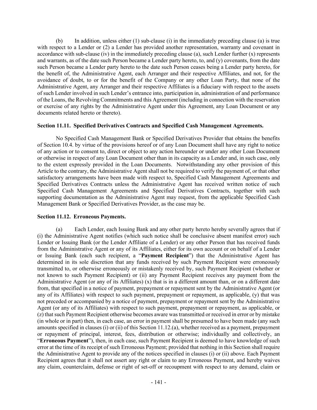 - 141 - (b) In addition, unless either (1) sub-clause (i) in the immediately preceding clause (a) is true with respect to a Lender or (2) a Lender has provided another representation, warranty and covenant in accordance with sub-clause (iv) in the immediately preceding clause (a), such Lender further (x) represents and warrants, as of the date such Person became a Lender party hereto, to, and (y) covenants, from the date such Person became a Lender party hereto to the date such Person ceases being a Lender party hereto, for the benefit of, the Administrative Agent, each Arranger and their respective Affiliates, and not, for the avoidance of doubt, to or for the benefit of the Company or any other Loan Party, that none of the Administrative Agent, any Arranger and their respective Affiliates is a fiduciary with respect to the assets of such Lender involved in such Lender’s entrance into, participation in, administration of and performance of the Loans, the Revolving Commitments and this Agreement (including in connection with the reservation or exercise of any rights by the Administrative Agent under this Agreement, any Loan Document or any documents related hereto or thereto). Section 11.11. Specified Derivatives Contracts and Specified Cash Management Agreements. No Specified Cash Management Bank or Specified Derivatives Provider that obtains the benefits of Section 10.4. by virtue of the provisions hereof or of any Loan Document shall have any right to notice of any action or to consent to, direct or object to any action hereunder or under any other Loan Document or otherwise in respect of any Loan Document other than in its capacity as a Lender and, in such case, only to the extent expressly provided in the Loan Documents. Notwithstanding any other provision of this Article to the contrary, the Administrative Agent shall not be required to verify the payment of, or that other satisfactory arrangements have been made with respect to, Specified Cash Management Agreements and Specified Derivatives Contracts unless the Administrative Agent has received written notice of such Specified Cash Management Agreements and Specified Derivatives Contracts, together with such supporting documentation as the Administrative Agent may request, from the applicable Specified Cash Management Bank or Specified Derivatives Provider, as the case may be. Section 11.12. Erroneous Payments. (a) Each Lender, each Issuing Bank and any other party hereto hereby severally agrees that if (i) the Administrative Agent notifies (which such notice shall be conclusive absent manifest error) such Lender or Issuing Bank (or the Lender Affiliate of a Lender) or any other Person that has received funds from the Administrative Agent or any of its Affiliates, either for its own account or on behalf of a Lender or Issuing Bank (each such recipient, a “Payment Recipient”) that the Administrative Agent has determined in its sole discretion that any funds received by such Payment Recipient were erroneously transmitted to, or otherwise erroneously or mistakenly received by, such Payment Recipient (whether or not known to such Payment Recipient) or (ii) any Payment Recipient receives any payment from the Administrative Agent (or any of its Affiliates) (x) that is in a different amount than, or on a different date from, that specified in a notice of payment, prepayment or repayment sent by the Administrative Agent (or any of its Affiliates) with respect to such payment, prepayment or repayment, as applicable, (y) that was not preceded or accompanied by a notice of payment, prepayment or repayment sent by the Administrative Agent (or any of its Affiliates) with respect to such payment, prepayment or repayment, as applicable, or (z) that such Payment Recipient otherwise becomes aware was transmitted or received in error or by mistake (in whole or in part) then, in each case, an error in payment shall be presumed to have been made (any such amounts specified in clauses (i) or (ii) of this Section 11.12.(a), whether received as a payment, prepayment or repayment of principal, interest, fees, distribution or otherwise; individually and collectively, an “Erroneous Payment”), then, in each case, such Payment Recipient is deemed to have knowledge of such error at the time of its receipt of such Erroneous Payment; provided that nothing in this Section shall require the Administrative Agent to provide any of the notices specified in clauses (i) or (ii) above. Each Payment Recipient agrees that it shall not assert any right or claim to any Erroneous Payment, and hereby waives any claim, counterclaim, defense or right of set-off or recoupment with respect to any demand, claim or