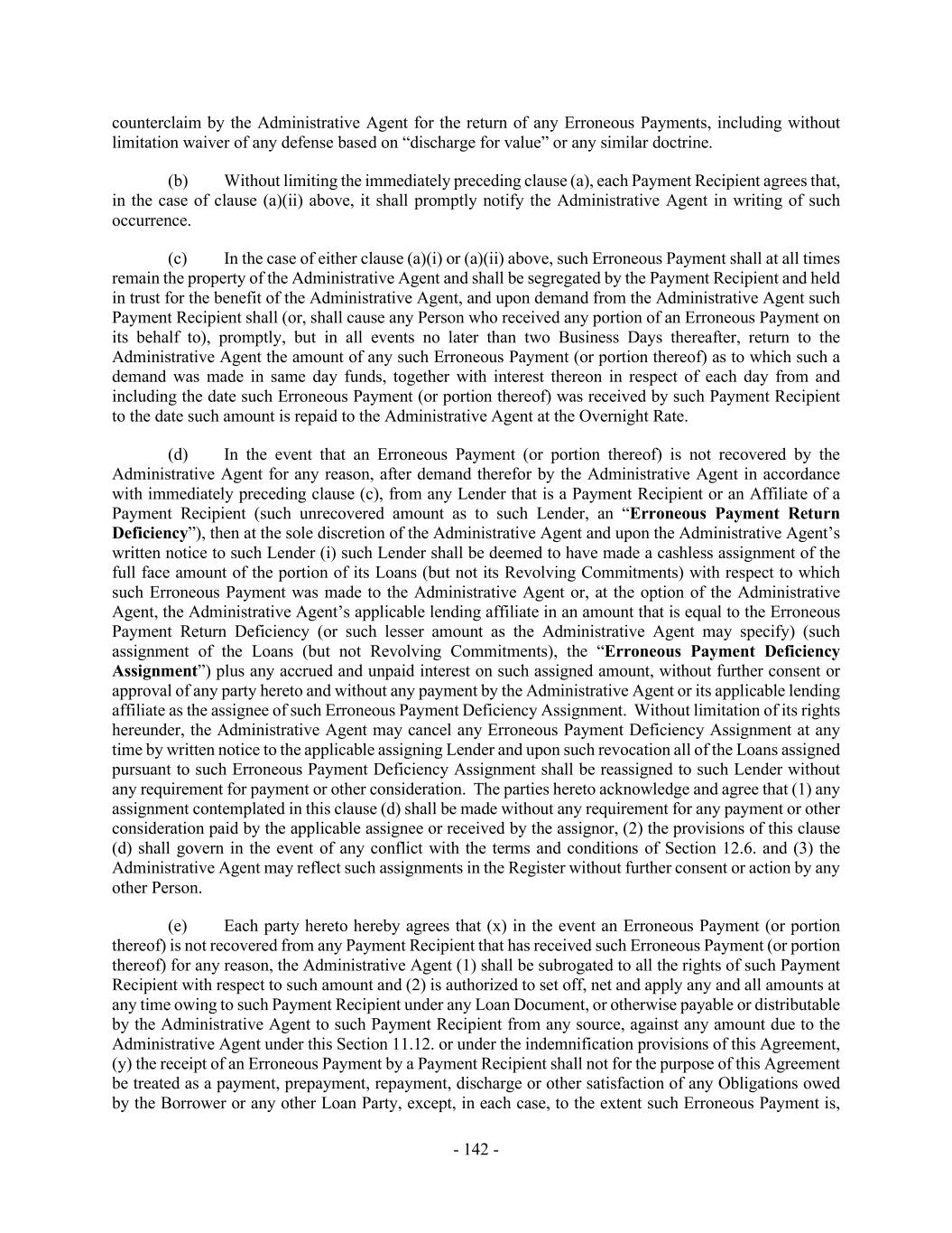 - 142 - counterclaim by the Administrative Agent for the return of any Erroneous Payments, including without limitation waiver of any defense based on “discharge for value” or any similar doctrine. (b) Without limiting the immediately preceding clause (a), each Payment Recipient agrees that, in the case of clause (a)(ii) above, it shall promptly notify the Administrative Agent in writing of such occurrence. (c) In the case of either clause (a)(i) or (a)(ii) above, such Erroneous Payment shall at all times remain the property of the Administrative Agent and shall be segregated by the Payment Recipient and held in trust for the benefit of the Administrative Agent, and upon demand from the Administrative Agent such Payment Recipient shall (or, shall cause any Person who received any portion of an Erroneous Payment on its behalf to), promptly, but in all events no later than two Business Days thereafter, return to the Administrative Agent the amount of any such Erroneous Payment (or portion thereof) as to which such a demand was made in same day funds, together with interest thereon in respect of each day from and including the date such Erroneous Payment (or portion thereof) was received by such Payment Recipient to the date such amount is repaid to the Administrative Agent at the Overnight Rate. (d) In the event that an Erroneous Payment (or portion thereof) is not recovered by the Administrative Agent for any reason, after demand therefor by the Administrative Agent in accordance with immediately preceding clause (c), from any Lender that is a Payment Recipient or an Affiliate of a Payment Recipient (such unrecovered amount as to such Lender, an “Erroneous Payment Return Deficiency”), then at the sole discretion of the Administrative Agent and upon the Administrative Agent’s written notice to such Lender (i) such Lender shall be deemed to have made a cashless assignment of the full face amount of the portion of its Loans (but not its Revolving Commitments) with respect to which such Erroneous Payment was made to the Administrative Agent or, at the option of the Administrative Agent, the Administrative Agent’s applicable lending affiliate in an amount that is equal to the Erroneous Payment Return Deficiency (or such lesser amount as the Administrative Agent may specify) (such assignment of the Loans (but not Revolving Commitments), the “Erroneous Payment Deficiency Assignment”) plus any accrued and unpaid interest on such assigned amount, without further consent or approval of any party hereto and without any payment by the Administrative Agent or its applicable lending affiliate as the assignee of such Erroneous Payment Deficiency Assignment. Without limitation of its rights hereunder, the Administrative Agent may cancel any Erroneous Payment Deficiency Assignment at any time by written notice to the applicable assigning Lender and upon such revocation all of the Loans assigned pursuant to such Erroneous Payment Deficiency Assignment shall be reassigned to such Lender without any requirement for payment or other consideration. The parties hereto acknowledge and agree that (1) any assignment contemplated in this clause (d) shall be made without any requirement for any payment or other consideration paid by the applicable assignee or received by the assignor, (2) the provisions of this clause (d) shall govern in the event of any conflict with the terms and conditions of Section 12.6. and (3) the Administrative Agent may reflect such assignments in the Register without further consent or action by any other Person. (e) Each party hereto hereby agrees that (x) in the event an Erroneous Payment (or portion thereof) is not recovered from any Payment Recipient that has received such Erroneous Payment (or portion thereof) for any reason, the Administrative Agent (1) shall be subrogated to all the rights of such Payment Recipient with respect to such amount and (2) is authorized to set off, net and apply any and all amounts at any time owing to such Payment Recipient under any Loan Document, or otherwise payable or distributable by the Administrative Agent to such Payment Recipient from any source, against any amount due to the Administrative Agent under this Section 11.12. or under the indemnification provisions of this Agreement, (y) the receipt of an Erroneous Payment by a Payment Recipient shall not for the purpose of this Agreement be treated as a payment, prepayment, repayment, discharge or other satisfaction of any Obligations owed by the Borrower or any other Loan Party, except, in each case, to the extent such Erroneous Payment is,
