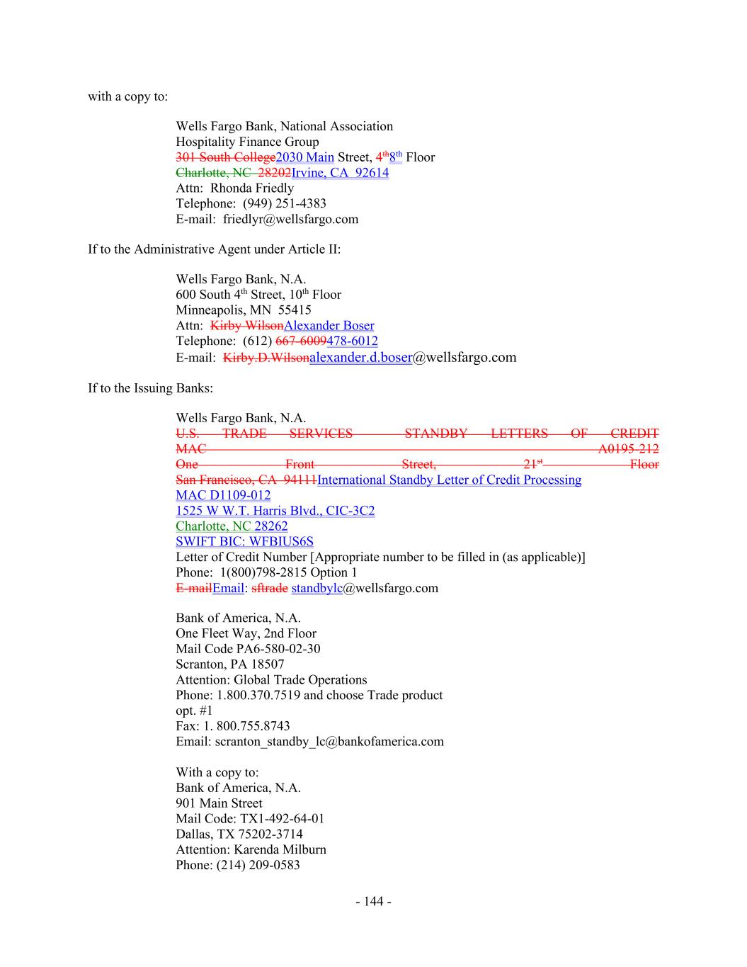 - 144 - with a copy to: Wells Fargo Bank, National Association Hospitality Finance Group 301 South College2030 Main Street, 4th8th Floor Charlotte, NC 28202Irvine, CA 92614 Attn: Rhonda Friedly Telephone: (949) 251-4383 E-mail: friedlyr@wellsfargo.com If to the Administrative Agent under Article II: Wells Fargo Bank, N.A. 600 South 4th Street, 10th Floor Minneapolis, MN 55415 Attn: Kirby WilsonAlexander Boser Telephone: (612) 667-6009478-6012 E-mail: Kirby.D.Wilsonalexander.d.boser@wellsfargo.com If to the Issuing Banks: Wells Fargo Bank, N.A. U.S. TRADE SERVICES – STANDBY LETTERS OF CREDIT MAC A0195-212 One Front Street, 21st Floor San Francisco, CA 94111International Standby Letter of Credit Processing MAC D1109-012 1525 W W.T. Harris Blvd., CIC-3C2 Charlotte, NC 28262 SWIFT BIC: WFBIUS6S Letter of Credit Number [Appropriate number to be filled in (as applicable)] Phone: 1(800)798-2815 Option 1 E-mailEmail: sftrade standbylc@wellsfargo.com Bank of America, N.A. One Fleet Way, 2nd Floor Mail Code PA6-580-02-30 Scranton, PA 18507 Attention: Global Trade Operations Phone: 1.800.370.7519 and choose Trade product opt. #1 Fax: 1. 800.755.8743 Email: scranton_standby_lc@bankofamerica.com With a copy to: Bank of America, N.A. 901 Main Street Mail Code: TX1-492-64-01 Dallas, TX 75202-3714 Attention: Karenda Milburn Phone: (214) 209-0583