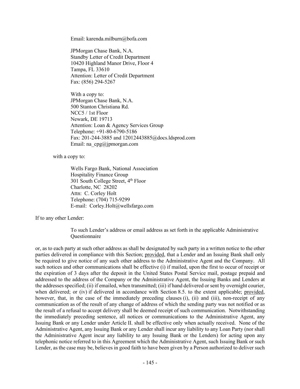 - 145 - Email: karenda.milburn@bofa.com JPMorgan Chase Bank, N.A. Standby Letter of Credit Department 10420 Highland Manor Drive, Floor 4 Tampa, FL 33610 Attention: Letter of Credit Department Fax: (856) 294-5267 With a copy to: JPMorgan Chase Bank, N.A. 500 Stanton Christiana Rd. NCC5 / 1st Floor Newark, DE 19713 Attention: Loan & Agency Services Group Telephone: +91-80-6790-5186 Fax: 201-244-3885 and 12012443885@docs.ldsprod.com Email: na_cpg@jpmorgan.com with a copy to: Wells Fargo Bank, National Association Hospitality Finance Group 301 South College Street, 4th Floor Charlotte, NC 28202 Attn: C. Corley Holt Telephone: (704) 715-9299 E-mail: Corley.Holt@wellsfargo.com If to any other Lender: To such Lender’s address or email address as set forth in the applicable Administrative Questionnaire or, as to each party at such other address as shall be designated by such party in a written notice to the other parties delivered in compliance with this Section; provided, that a Lender and an Issuing Bank shall only be required to give notice of any such other address to the Administrative Agent and the Company. All such notices and other communications shall be effective (i) if mailed, upon the first to occur of receipt or the expiration of 3 days after the deposit in the United States Postal Service mail, postage prepaid and addressed to the address of the Company or the Administrative Agent, the Issuing Banks and Lenders at the addresses specified; (ii) if emailed, when transmitted; (iii) if hand delivered or sent by overnight courier, when delivered; or (iv) if delivered in accordance with Section 8.5. to the extent applicable; provided, however, that, in the case of the immediately preceding clauses (i), (ii) and (iii), non-receipt of any communication as of the result of any change of address of which the sending party was not notified or as the result of a refusal to accept delivery shall be deemed receipt of such communication. Notwithstanding the immediately preceding sentence, all notices or communications to the Administrative Agent, any Issuing Bank or any Lender under Article II. shall be effective only when actually received. None of the Administrative Agent, any Issuing Bank or any Lender shall incur any liability to any Loan Party (nor shall the Administrative Agent incur any liability to any Issuing Bank or the Lenders) for acting upon any telephonic notice referred to in this Agreement which the Administrative Agent, such Issuing Bank or such Lender, as the case may be, believes in good faith to have been given by a Person authorized to deliver such