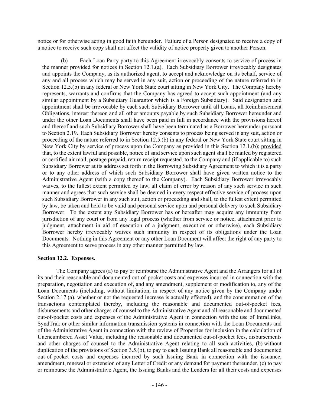 - 146 - notice or for otherwise acting in good faith hereunder. Failure of a Person designated to receive a copy of a notice to receive such copy shall not affect the validity of notice properly given to another Person. (b) Each Loan Party party to this Agreement irrevocably consents to service of process in the manner provided for notices in Section 12.1.(a). Each Subsidiary Borrower irrevocably designates and appoints the Company, as its authorized agent, to accept and acknowledge on its behalf, service of any and all process which may be served in any suit, action or proceeding of the nature referred to in Section 12.5.(b) in any federal or New York State court sitting in New York City. The Company hereby represents, warrants and confirms that the Company has agreed to accept such appointment (and any similar appointment by a Subsidiary Guarantor which is a Foreign Subsidiary). Said designation and appointment shall be irrevocable by each such Subsidiary Borrower until all Loans, all Reimbursement Obligations, interest thereon and all other amounts payable by such Subsidiary Borrower hereunder and under the other Loan Documents shall have been paid in full in accordance with the provisions hereof and thereof and such Subsidiary Borrower shall have been terminated as a Borrower hereunder pursuant to Section 2.19. Each Subsidiary Borrower hereby consents to process being served in any suit, action or proceeding of the nature referred to in Section 12.5.(b) in any federal or New York State court sitting in New York City by service of process upon the Company as provided in this Section 12.1.(b); provided that, to the extent lawful and possible, notice of said service upon such agent shall be mailed by registered or certified air mail, postage prepaid, return receipt requested, to the Company and (if applicable to) such Subsidiary Borrower at its address set forth in the Borrowing Subsidiary Agreement to which it is a party or to any other address of which such Subsidiary Borrower shall have given written notice to the Administrative Agent (with a copy thereof to the Company). Each Subsidiary Borrower irrevocably waives, to the fullest extent permitted by law, all claim of error by reason of any such service in such manner and agrees that such service shall be deemed in every respect effective service of process upon such Subsidiary Borrower in any such suit, action or proceeding and shall, to the fullest extent permitted by law, be taken and held to be valid and personal service upon and personal delivery to such Subsidiary Borrower. To the extent any Subsidiary Borrower has or hereafter may acquire any immunity from jurisdiction of any court or from any legal process (whether from service or notice, attachment prior to judgment, attachment in aid of execution of a judgment, execution or otherwise), each Subsidiary Borrower hereby irrevocably waives such immunity in respect of its obligations under the Loan Documents. Nothing in this Agreement or any other Loan Document will affect the right of any party to this Agreement to serve process in any other manner permitted by law. Section 12.2. Expenses. The Company agrees (a) to pay or reimburse the Administrative Agent and the Arrangers for all of its and their reasonable and documented out-of-pocket costs and expenses incurred in connection with the preparation, negotiation and execution of, and any amendment, supplement or modification to, any of the Loan Documents (including, without limitation, in respect of any notice given by the Company under Section 2.17.(a), whether or not the requested increase is actually effected), and the consummation of the transactions contemplated thereby, including the reasonable and documented out-of-pocket fees, disbursements and other charges of counsel to the Administrative Agent and all reasonable and documented out-of-pocket costs and expenses of the Administrative Agent in connection with the use of IntraLinks, SyndTrak or other similar information transmission systems in connection with the Loan Documents and of the Administrative Agent in connection with the review of Properties for inclusion in the calculation of Unencumbered Asset Value, including the reasonable and documented out-of-pocket fees, disbursements and other charges of counsel to the Administrative Agent relating to all such activities, (b) without duplication of the provisions of Section 3.5.(b), to pay to each Issuing Bank all reasonable and documented out-of-pocket costs and expenses incurred by such Issuing Bank in connection with the issuance, amendment, renewal or extension of any Letter of Credit or any demand for payment thereunder, (c) to pay or reimburse the Administrative Agent, the Issuing Banks and the Lenders for all their costs and expenses