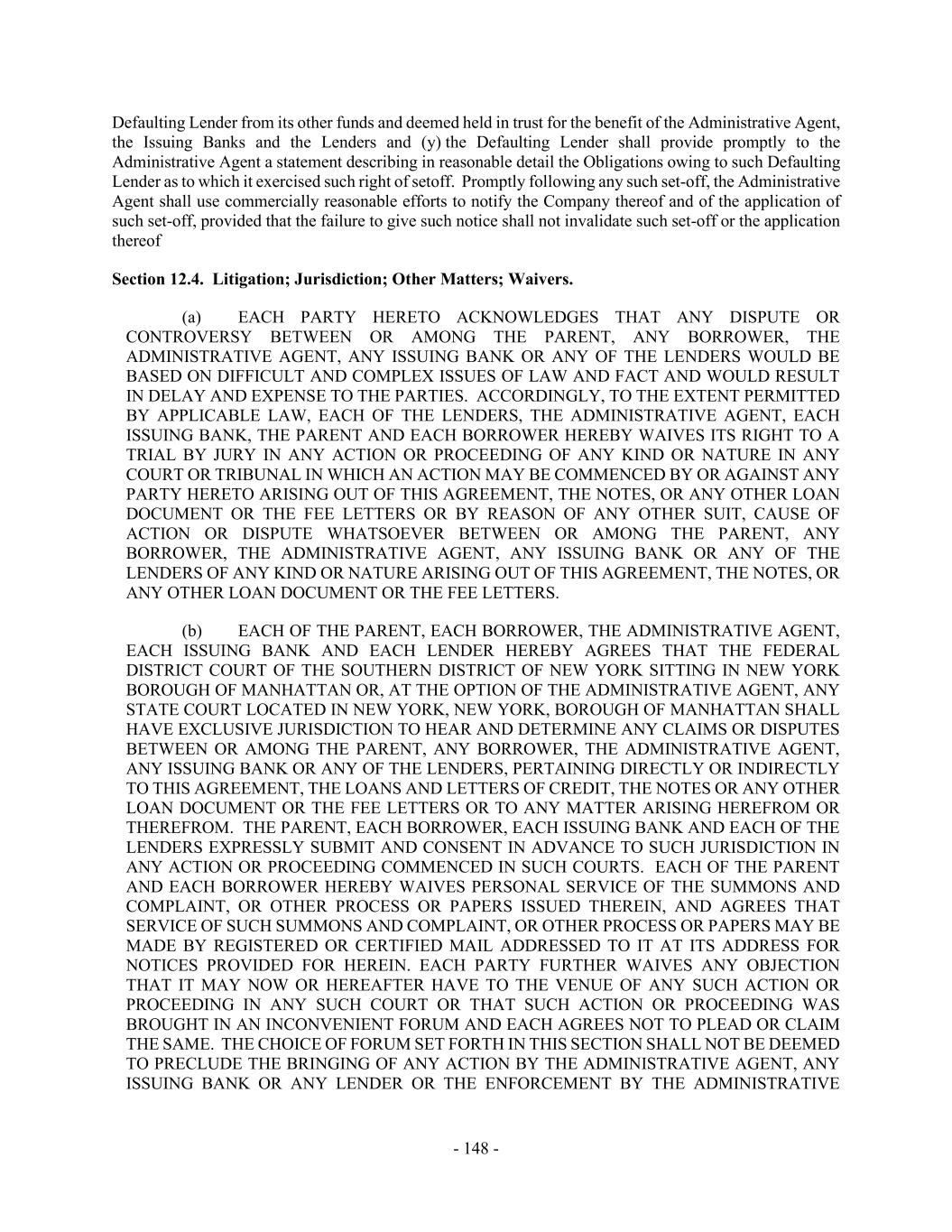 - 148 - Defaulting Lender from its other funds and deemed held in trust for the benefit of the Administrative Agent, the Issuing Banks and the Lenders and (y) the Defaulting Lender shall provide promptly to the Administrative Agent a statement describing in reasonable detail the Obligations owing to such Defaulting Lender as to which it exercised such right of setoff. Promptly following any such set-off, the Administrative Agent shall use commercially reasonable efforts to notify the Company thereof and of the application of such set-off, provided that the failure to give such notice shall not invalidate such set-off or the application thereof Section 12.4. Litigation; Jurisdiction; Other Matters; Waivers. (a) EACH PARTY HERETO ACKNOWLEDGES THAT ANY DISPUTE OR CONTROVERSY BETWEEN OR AMONG THE PARENT, ANY BORROWER, THE ADMINISTRATIVE AGENT, ANY ISSUING BANK OR ANY OF THE LENDERS WOULD BE BASED ON DIFFICULT AND COMPLEX ISSUES OF LAW AND FACT AND WOULD RESULT IN DELAY AND EXPENSE TO THE PARTIES. ACCORDINGLY, TO THE EXTENT PERMITTED BY APPLICABLE LAW, EACH OF THE LENDERS, THE ADMINISTRATIVE AGENT, EACH ISSUING BANK, THE PARENT AND EACH BORROWER HEREBY WAIVES ITS RIGHT TO A TRIAL BY JURY IN ANY ACTION OR PROCEEDING OF ANY KIND OR NATURE IN ANY COURT OR TRIBUNAL IN WHICH AN ACTION MAY BE COMMENCED BY OR AGAINST ANY PARTY HERETO ARISING OUT OF THIS AGREEMENT, THE NOTES, OR ANY OTHER LOAN DOCUMENT OR THE FEE LETTERS OR BY REASON OF ANY OTHER SUIT, CAUSE OF ACTION OR DISPUTE WHATSOEVER BETWEEN OR AMONG THE PARENT, ANY BORROWER, THE ADMINISTRATIVE AGENT, ANY ISSUING BANK OR ANY OF THE LENDERS OF ANY KIND OR NATURE ARISING OUT OF THIS AGREEMENT, THE NOTES, OR ANY OTHER LOAN DOCUMENT OR THE FEE LETTERS. (b) EACH OF THE PARENT, EACH BORROWER, THE ADMINISTRATIVE AGENT, EACH ISSUING BANK AND EACH LENDER HEREBY AGREES THAT THE FEDERAL DISTRICT COURT OF THE SOUTHERN DISTRICT OF NEW YORK SITTING IN NEW YORK BOROUGH OF MANHATTAN OR, AT THE OPTION OF THE ADMINISTRATIVE AGENT, ANY STATE COURT LOCATED IN NEW YORK, NEW YORK, BOROUGH OF MANHATTAN SHALL HAVE EXCLUSIVE JURISDICTION TO HEAR AND DETERMINE ANY CLAIMS OR DISPUTES BETWEEN OR AMONG THE PARENT, ANY BORROWER, THE ADMINISTRATIVE AGENT, ANY ISSUING BANK OR ANY OF THE LENDERS, PERTAINING DIRECTLY OR INDIRECTLY TO THIS AGREEMENT, THE LOANS AND LETTERS OF CREDIT, THE NOTES OR ANY OTHER LOAN DOCUMENT OR THE FEE LETTERS OR TO ANY MATTER ARISING HEREFROM OR THEREFROM. THE PARENT, EACH BORROWER, EACH ISSUING BANK AND EACH OF THE LENDERS EXPRESSLY SUBMIT AND CONSENT IN ADVANCE TO SUCH JURISDICTION IN ANY ACTION OR PROCEEDING COMMENCED IN SUCH COURTS. EACH OF THE PARENT AND EACH BORROWER HEREBY WAIVES PERSONAL SERVICE OF THE SUMMONS AND COMPLAINT, OR OTHER PROCESS OR PAPERS ISSUED THEREIN, AND AGREES THAT SERVICE OF SUCH SUMMONS AND COMPLAINT, OR OTHER PROCESS OR PAPERS MAY BE MADE BY REGISTERED OR CERTIFIED MAIL ADDRESSED TO IT AT ITS ADDRESS FOR NOTICES PROVIDED FOR HEREIN. EACH PARTY FURTHER WAIVES ANY OBJECTION THAT IT MAY NOW OR HEREAFTER HAVE TO THE VENUE OF ANY SUCH ACTION OR PROCEEDING IN ANY SUCH COURT OR THAT SUCH ACTION OR PROCEEDING WAS BROUGHT IN AN INCONVENIENT FORUM AND EACH AGREES NOT TO PLEAD OR CLAIM THE SAME. THE CHOICE OF FORUM SET FORTH IN THIS SECTION SHALL NOT BE DEEMED TO PRECLUDE THE BRINGING OF ANY ACTION BY THE ADMINISTRATIVE AGENT, ANY ISSUING BANK OR ANY LENDER OR THE ENFORCEMENT BY THE ADMINISTRATIVE
