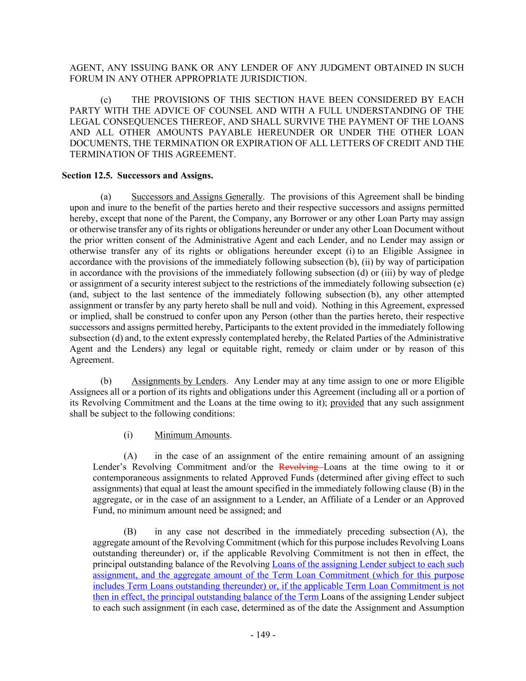 - 149 - AGENT, ANY ISSUING BANK OR ANY LENDER OF ANY JUDGMENT OBTAINED IN SUCH FORUM IN ANY OTHER APPROPRIATE JURISDICTION. (c) THE PROVISIONS OF THIS SECTION HAVE BEEN CONSIDERED BY EACH PARTY WITH THE ADVICE OF COUNSEL AND WITH A FULL UNDERSTANDING OF THE LEGAL CONSEQUENCES THEREOF, AND SHALL SURVIVE THE PAYMENT OF THE LOANS AND ALL OTHER AMOUNTS PAYABLE HEREUNDER OR UNDER THE OTHER LOAN DOCUMENTS, THE TERMINATION OR EXPIRATION OF ALL LETTERS OF CREDIT AND THE TERMINATION OF THIS AGREEMENT. Section 12.5. Successors and Assigns. (a) Successors and Assigns Generally. The provisions of this Agreement shall be binding upon and inure to the benefit of the parties hereto and their respective successors and assigns permitted hereby, except that none of the Parent, the Company, any Borrower or any other Loan Party may assign or otherwise transfer any of its rights or obligations hereunder or under any other Loan Document without the prior written consent of the Administrative Agent and each Lender, and no Lender may assign or otherwise transfer any of its rights or obligations hereunder except (i) to an Eligible Assignee in accordance with the provisions of the immediately following subsection (b), (ii) by way of participation in accordance with the provisions of the immediately following subsection (d) or (iii) by way of pledge or assignment of a security interest subject to the restrictions of the immediately following subsection (e) (and, subject to the last sentence of the immediately following subsection (b), any other attempted assignment or transfer by any party hereto shall be null and void). Nothing in this Agreement, expressed or implied, shall be construed to confer upon any Person (other than the parties hereto, their respective successors and assigns permitted hereby, Participants to the extent provided in the immediately following subsection (d) and, to the extent expressly contemplated hereby, the Related Parties of the Administrative Agent and the Lenders) any legal or equitable right, remedy or claim under or by reason of this Agreement. (b) Assignments by Lenders. Any Lender may at any time assign to one or more Eligible Assignees all or a portion of its rights and obligations under this Agreement (including all or a portion of its Revolving Commitment and the Loans at the time owing to it); provided that any such assignment shall be subject to the following conditions: (i) Minimum Amounts. (A) in the case of an assignment of the entire remaining amount of an assigning Lender’s Revolving Commitment and/or the Revolving Loans at the time owing to it or contemporaneous assignments to related Approved Funds (determined after giving effect to such assignments) that equal at least the amount specified in the immediately following clause (B) in the aggregate, or in the case of an assignment to a Lender, an Affiliate of a Lender or an Approved Fund, no minimum amount need be assigned; and (B) in any case not described in the immediately preceding subsection (A), the aggregate amount of the Revolving Commitment (which for this purpose includes Revolving Loans outstanding thereunder) or, if the applicable Revolving Commitment is not then in effect, the principal outstanding balance of the Revolving Loans of the assigning Lender subject to each such assignment, and the aggregate amount of the Term Loan Commitment (which for this purpose includes Term Loans outstanding thereunder) or, if the applicable Term Loan Commitment is not then in effect, the principal outstanding balance of the Term Loans of the assigning Lender subject to each such assignment (in each case, determined as of the date the Assignment and Assumption