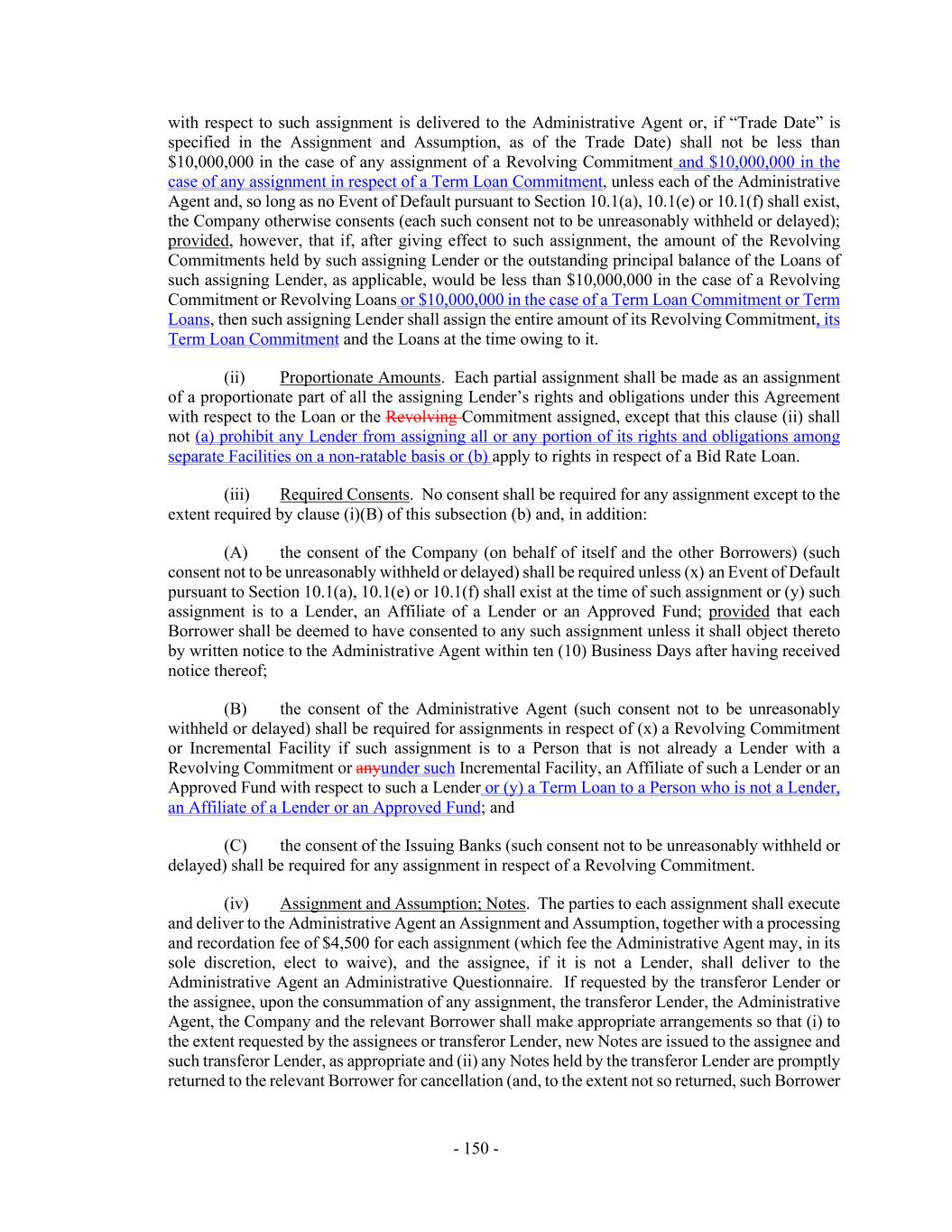 - 150 - with respect to such assignment is delivered to the Administrative Agent or, if “Trade Date” is specified in the Assignment and Assumption, as of the Trade Date) shall not be less than $10,000,000 in the case of any assignment of a Revolving Commitment and $10,000,000 in the case of any assignment in respect of a Term Loan Commitment, unless each of the Administrative Agent and, so long as no Event of Default pursuant to Section 10.1(a), 10.1(e) or 10.1(f) shall exist, the Company otherwise consents (each such consent not to be unreasonably withheld or delayed); provided, however, that if, after giving effect to such assignment, the amount of the Revolving Commitments held by such assigning Lender or the outstanding principal balance of the Loans of such assigning Lender, as applicable, would be less than $10,000,000 in the case of a Revolving Commitment or Revolving Loans or $10,000,000 in the case of a Term Loan Commitment or Term Loans, then such assigning Lender shall assign the entire amount of its Revolving Commitment, its Term Loan Commitment and the Loans at the time owing to it. (ii) Proportionate Amounts. Each partial assignment shall be made as an assignment of a proportionate part of all the assigning Lender’s rights and obligations under this Agreement with respect to the Loan or the Revolving Commitment assigned, except that this clause (ii) shall not (a) prohibit any Lender from assigning all or any portion of its rights and obligations among separate Facilities on a non-ratable basis or (b) apply to rights in respect of a Bid Rate Loan. (iii) Required Consents. No consent shall be required for any assignment except to the extent required by clause (i)(B) of this subsection (b) and, in addition: (A) the consent of the Company (on behalf of itself and the other Borrowers) (such consent not to be unreasonably withheld or delayed) shall be required unless (x) an Event of Default pursuant to Section 10.1(a), 10.1(e) or 10.1(f) shall exist at the time of such assignment or (y) such assignment is to a Lender, an Affiliate of a Lender or an Approved Fund; provided that each Borrower shall be deemed to have consented to any such assignment unless it shall object thereto by written notice to the Administrative Agent within ten (10) Business Days after having received notice thereof; (B) the consent of the Administrative Agent (such consent not to be unreasonably withheld or delayed) shall be required for assignments in respect of (x) a Revolving Commitment or Incremental Facility if such assignment is to a Person that is not already a Lender with a Revolving Commitment or anyunder such Incremental Facility, an Affiliate of such a Lender or an Approved Fund with respect to such a Lender or (y) a Term Loan to a Person who is not a Lender, an Affiliate of a Lender or an Approved Fund; and (C) the consent of the Issuing Banks (such consent not to be unreasonably withheld or delayed) shall be required for any assignment in respect of a Revolving Commitment. (iv) Assignment and Assumption; Notes. The parties to each assignment shall execute and deliver to the Administrative Agent an Assignment and Assumption, together with a processing and recordation fee of $4,500 for each assignment (which fee the Administrative Agent may, in its sole discretion, elect to waive), and the assignee, if it is not a Lender, shall deliver to the Administrative Agent an Administrative Questionnaire. If requested by the transferor Lender or the assignee, upon the consummation of any assignment, the transferor Lender, the Administrative Agent, the Company and the relevant Borrower shall make appropriate arrangements so that (i) to the extent requested by the assignees or transferor Lender, new Notes are issued to the assignee and such transferor Lender, as appropriate and (ii) any Notes held by the transferor Lender are promptly returned to the relevant Borrower for cancellation (and, to the extent not so returned, such Borrower