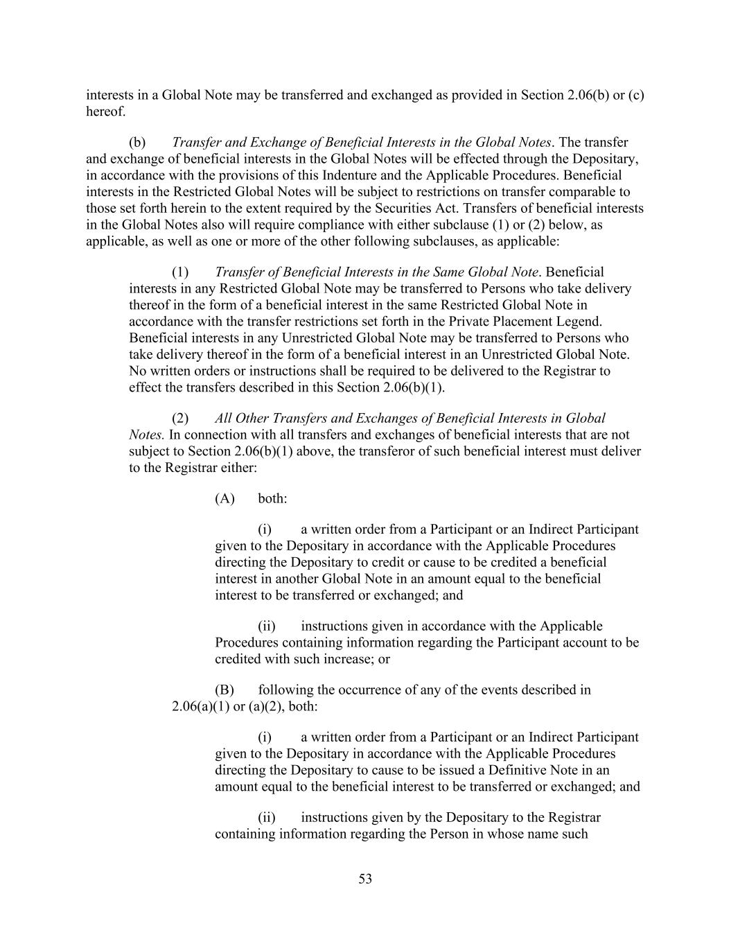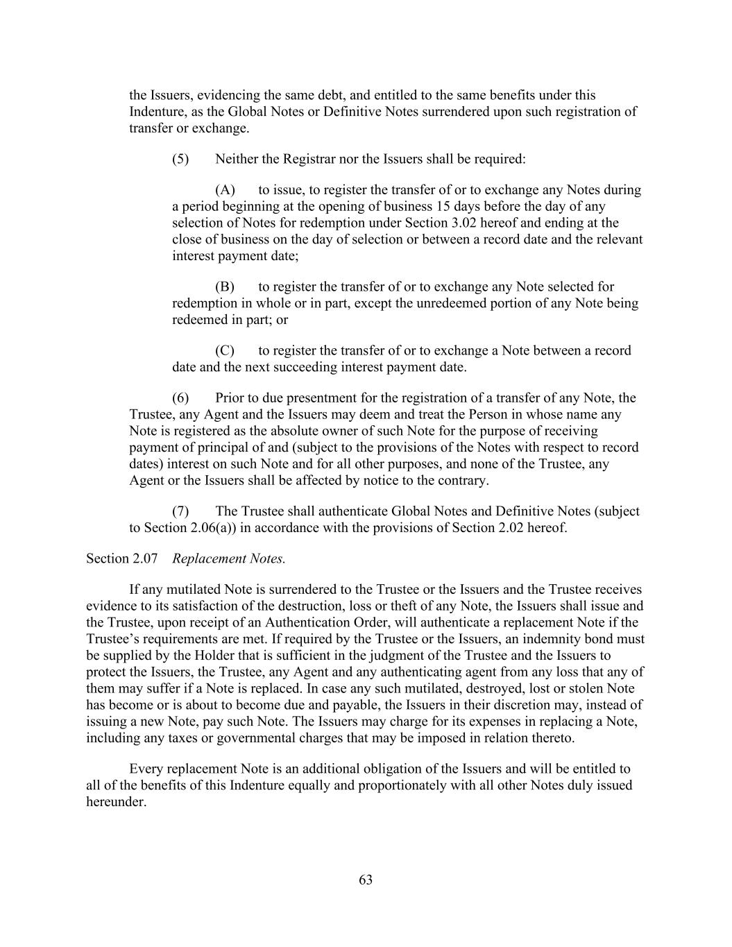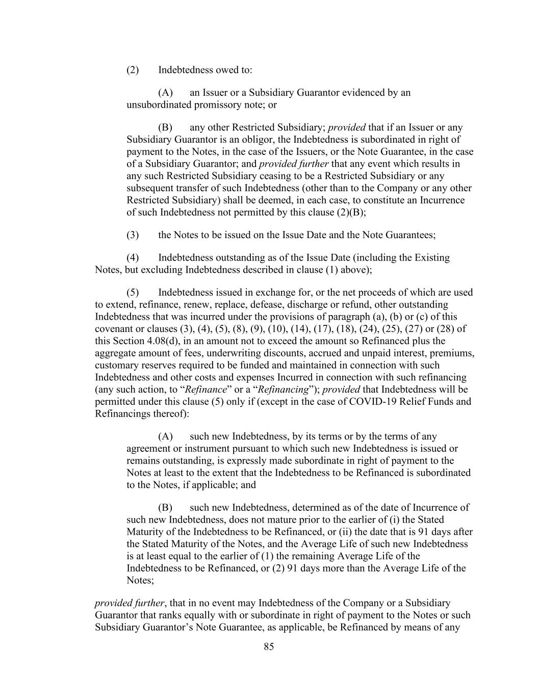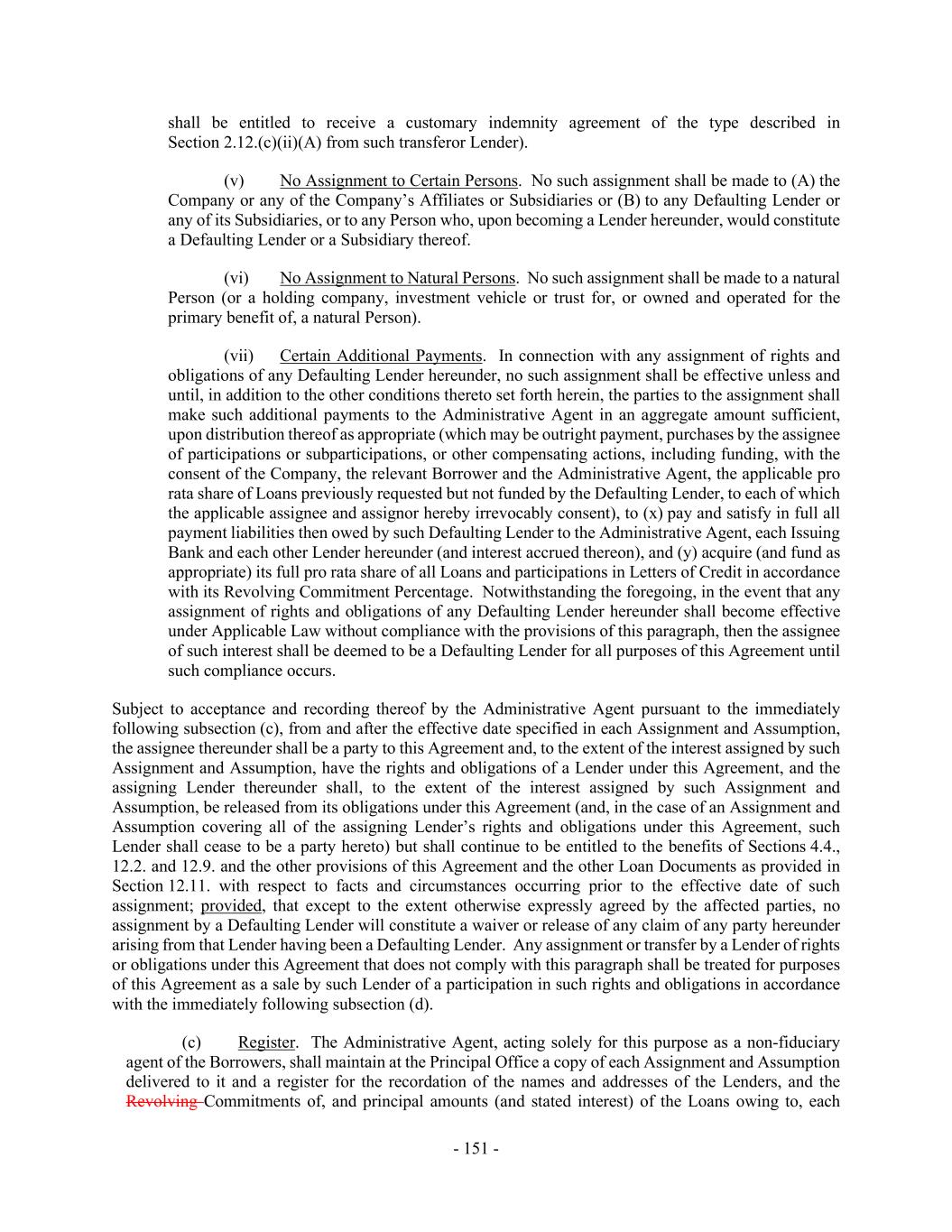 - 151 - shall be entitled to receive a customary indemnity agreement of the type described in Section 2.12.(c)(ii)(A) from such transferor Lender). (v) No Assignment to Certain Persons. No such assignment shall be made to (A) the Company or any of the Company’s Affiliates or Subsidiaries or (B) to any Defaulting Lender or any of its Subsidiaries, or to any Person who, upon becoming a Lender hereunder, would constitute a Defaulting Lender or a Subsidiary thereof. (vi) No Assignment to Natural Persons. No such assignment shall be made to a natural Person (or a holding company, investment vehicle or trust for, or owned and operated for the primary benefit of, a natural Person). (vii) Certain Additional Payments. In connection with any assignment of rights and obligations of any Defaulting Lender hereunder, no such assignment shall be effective unless and until, in addition to the other conditions thereto set forth herein, the parties to the assignment shall make such additional payments to the Administrative Agent in an aggregate amount sufficient, upon distribution thereof as appropriate (which may be outright payment, purchases by the assignee of participations or subparticipations, or other compensating actions, including funding, with the consent of the Company, the relevant Borrower and the Administrative Agent, the applicable pro rata share of Loans previously requested but not funded by the Defaulting Lender, to each of which the applicable assignee and assignor hereby irrevocably consent), to (x) pay and satisfy in full all payment liabilities then owed by such Defaulting Lender to the Administrative Agent, each Issuing Bank and each other Lender hereunder (and interest accrued thereon), and (y) acquire (and fund as appropriate) its full pro rata share of all Loans and participations in Letters of Credit in accordance with its Revolving Commitment Percentage. Notwithstanding the foregoing, in the event that any assignment of rights and obligations of any Defaulting Lender hereunder shall become effective under Applicable Law without compliance with the provisions of this paragraph, then the assignee of such interest shall be deemed to be a Defaulting Lender for all purposes of this Agreement until such compliance occurs. Subject to acceptance and recording thereof by the Administrative Agent pursuant to the immediately following subsection (c), from and after the effective date specified in each Assignment and Assumption, the assignee thereunder shall be a party to this Agreement and, to the extent of the interest assigned by such Assignment and Assumption, have the rights and obligations of a Lender under this Agreement, and the assigning Lender thereunder shall, to the extent of the interest assigned by such Assignment and Assumption, be released from its obligations under this Agreement (and, in the case of an Assignment and Assumption covering all of the assigning Lender’s rights and obligations under this Agreement, such Lender shall cease to be a party hereto) but shall continue to be entitled to the benefits of Sections 4.4., 12.2. and 12.9. and the other provisions of this Agreement and the other Loan Documents as provided in Section 12.11. with respect to facts and circumstances occurring prior to the effective date of such assignment; provided, that except to the extent otherwise expressly agreed by the affected parties, no assignment by a Defaulting Lender will constitute a waiver or release of any claim of any party hereunder arising from that Lender having been a Defaulting Lender. Any assignment or transfer by a Lender of rights or obligations under this Agreement that does not comply with this paragraph shall be treated for purposes of this Agreement as a sale by such Lender of a participation in such rights and obligations in accordance with the immediately following subsection (d). (c) Register. The Administrative Agent, acting solely for this purpose as a non-fiduciary agent of the Borrowers, shall maintain at the Principal Office a copy of each Assignment and Assumption delivered to it and a register for the recordation of the names and addresses of the Lenders, and the Revolving Commitments of, and principal amounts (and stated interest) of the Loans owing to, each