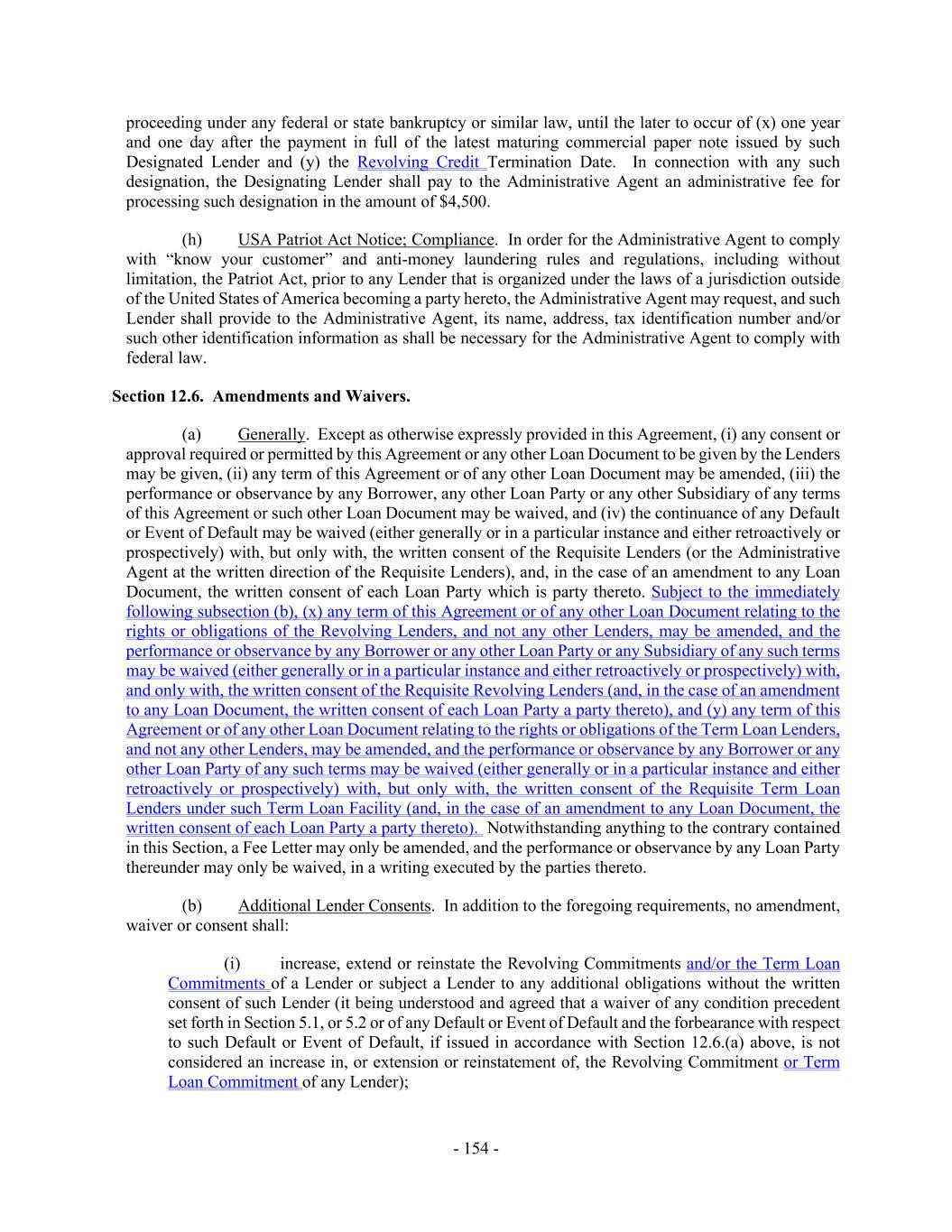 - 154 - proceeding under any federal or state bankruptcy or similar law, until the later to occur of (x) one year and one day after the payment in full of the latest maturing commercial paper note issued by such Designated Lender and (y) the Revolving Credit Termination Date. In connection with any such designation, the Designating Lender shall pay to the Administrative Agent an administrative fee for processing such designation in the amount of $4,500. (h) USA Patriot Act Notice; Compliance. In order for the Administrative Agent to comply with “know your customer” and anti-money laundering rules and regulations, including without limitation, the Patriot Act, prior to any Lender that is organized under the laws of a jurisdiction outside of the United States of America becoming a party hereto, the Administrative Agent may request, and such Lender shall provide to the Administrative Agent, its name, address, tax identification number and/or such other identification information as shall be necessary for the Administrative Agent to comply with federal law. Section 12.6. Amendments and Waivers. (a) Generally. Except as otherwise expressly provided in this Agreement, (i) any consent or approval required or permitted by this Agreement or any other Loan Document to be given by the Lenders may be given, (ii) any term of this Agreement or of any other Loan Document may be amended, (iii) the performance or observance by any Borrower, any other Loan Party or any other Subsidiary of any terms of this Agreement or such other Loan Document may be waived, and (iv) the continuance of any Default or Event of Default may be waived (either generally or in a particular instance and either retroactively or prospectively) with, but only with, the written consent of the Requisite Lenders (or the Administrative Agent at the written direction of the Requisite Lenders), and, in the case of an amendment to any Loan Document, the written consent of each Loan Party which is party thereto. Subject to the immediately following subsection (b), (x) any term of this Agreement or of any other Loan Document relating to the rights or obligations of the Revolving Lenders, and not any other Lenders, may be amended, and the performance or observance by any Borrower or any other Loan Party or any Subsidiary of any such terms may be waived (either generally or in a particular instance and either retroactively or prospectively) with, and only with, the written consent of the Requisite Revolving Lenders (and, in the case of an amendment to any Loan Document, the written consent of each Loan Party a party thereto), and (y) any term of this Agreement or of any other Loan Document relating to the rights or obligations of the Term Loan Lenders, and not any other Lenders, may be amended, and the performance or observance by any Borrower or any other Loan Party of any such terms may be waived (either generally or in a particular instance and either retroactively or prospectively) with, but only with, the written consent of the Requisite Term Loan Lenders under such Term Loan Facility (and, in the case of an amendment to any Loan Document, the written consent of each Loan Party a party thereto). Notwithstanding anything to the contrary contained in this Section, a Fee Letter may only be amended, and the performance or observance by any Loan Party thereunder may only be waived, in a writing executed by the parties thereto. (b) Additional Lender Consents. In addition to the foregoing requirements, no amendment, waiver or consent shall: (i) increase, extend or reinstate the Revolving Commitments and/or the Term Loan Commitments of a Lender or subject a Lender to any additional obligations without the written consent of such Lender (it being understood and agreed that a waiver of any condition precedent set forth in Section 5.1, or 5.2 or of any Default or Event of Default and the forbearance with respect to such Default or Event of Default, if issued in accordance with Section 12.6.(a) above, is not considered an increase in, or extension or reinstatement of, the Revolving Commitment or Term Loan Commitment of any Lender);