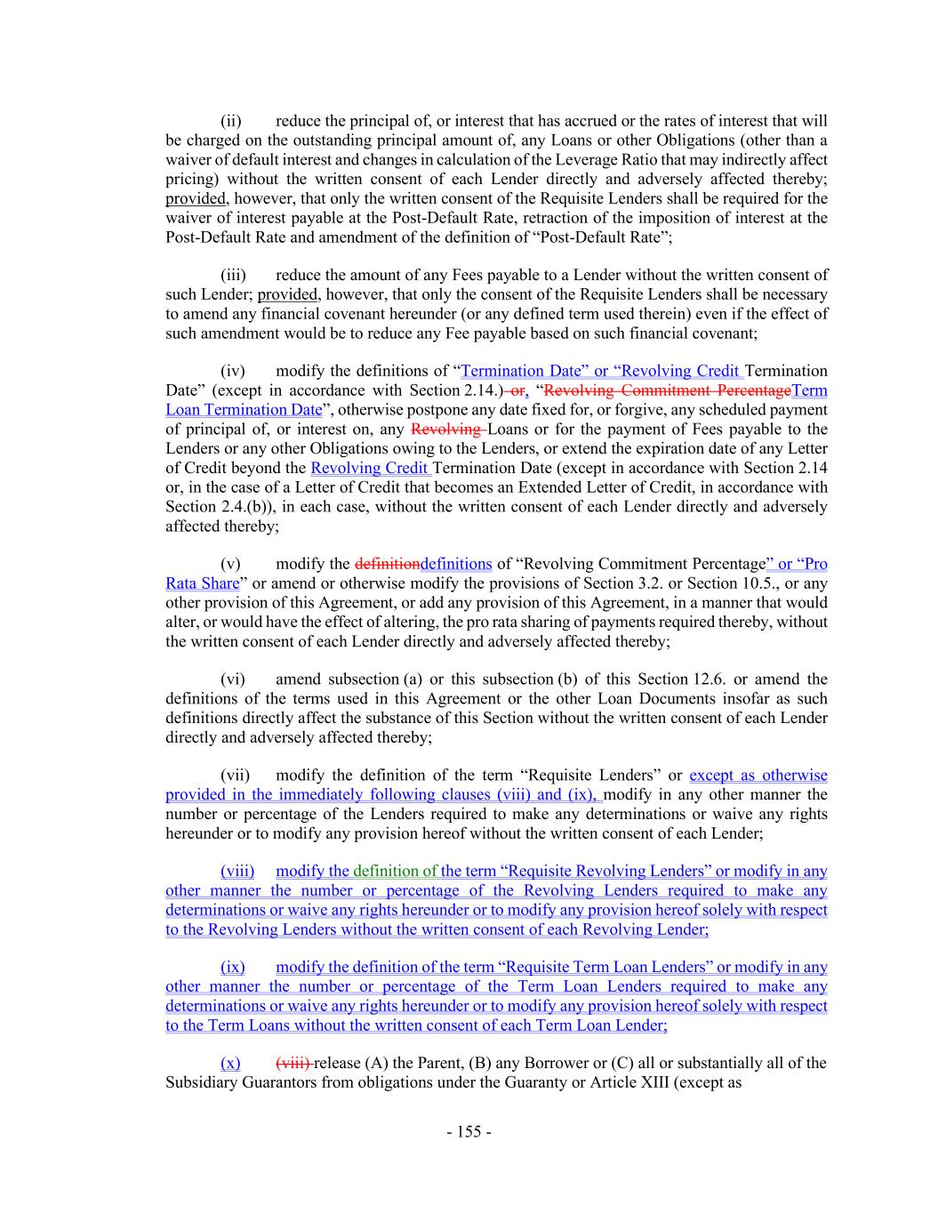 - 155 - (ii) reduce the principal of, or interest that has accrued or the rates of interest that will be charged on the outstanding principal amount of, any Loans or other Obligations (other than a waiver of default interest and changes in calculation of the Leverage Ratio that may indirectly affect pricing) without the written consent of each Lender directly and adversely affected thereby; provided, however, that only the written consent of the Requisite Lenders shall be required for the waiver of interest payable at the Post-Default Rate, retraction of the imposition of interest at the Post-Default Rate and amendment of the definition of “Post-Default Rate”; (iii) reduce the amount of any Fees payable to a Lender without the written consent of such Lender; provided, however, that only the consent of the Requisite Lenders shall be necessary to amend any financial covenant hereunder (or any defined term used therein) even if the effect of such amendment would be to reduce any Fee payable based on such financial covenant; (iv) modify the definitions of “Termination Date” or “Revolving Credit Termination Date” (except in accordance with Section 2.14.) or, “Revolving Commitment PercentageTerm Loan Termination Date”, otherwise postpone any date fixed for, or forgive, any scheduled payment of principal of, or interest on, any Revolving Loans or for the payment of Fees payable to the Lenders or any other Obligations owing to the Lenders, or extend the expiration date of any Letter of Credit beyond the Revolving Credit Termination Date (except in accordance with Section 2.14 or, in the case of a Letter of Credit that becomes an Extended Letter of Credit, in accordance with Section 2.4.(b)), in each case, without the written consent of each Lender directly and adversely affected thereby; (v) modify the definitiondefinitions of “Revolving Commitment Percentage” or “Pro Rata Share” or amend or otherwise modify the provisions of Section 3.2. or Section 10.5., or any other provision of this Agreement, or add any provision of this Agreement, in a manner that would alter, or would have the effect of altering, the pro rata sharing of payments required thereby, without the written consent of each Lender directly and adversely affected thereby; (vi) amend subsection (a) or this subsection (b) of this Section 12.6. or amend the definitions of the terms used in this Agreement or the other Loan Documents insofar as such definitions directly affect the substance of this Section without the written consent of each Lender directly and adversely affected thereby; (vii) modify the definition of the term “Requisite Lenders” or except as otherwise provided in the immediately following clauses (viii) and (ix), modify in any other manner the number or percentage of the Lenders required to make any determinations or waive any rights hereunder or to modify any provision hereof without the written consent of each Lender; (viii) modify the definition of the term “Requisite Revolving Lenders” or modify in any other manner the number or percentage of the Revolving Lenders required to make any determinations or waive any rights hereunder or to modify any provision hereof solely with respect to the Revolving Lenders without the written consent of each Revolving Lender; (ix) modify the definition of the term “Requisite Term Loan Lenders” or modify in any other manner the number or percentage of the Term Loan Lenders required to make any determinations or waive any rights hereunder or to modify any provision hereof solely with respect to the Term Loans without the written consent of each Term Loan Lender; (x) (viii) release (A) the Parent, (B) any Borrower or (C) all or substantially all of the Subsidiary Guarantors from obligations under the Guaranty or Article XIII (except as