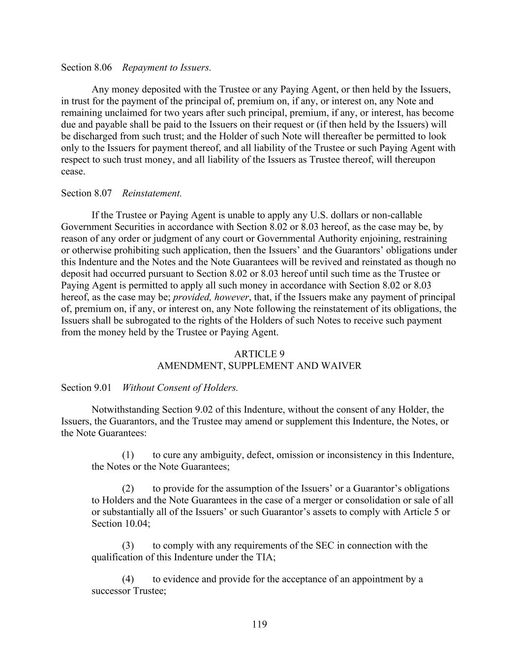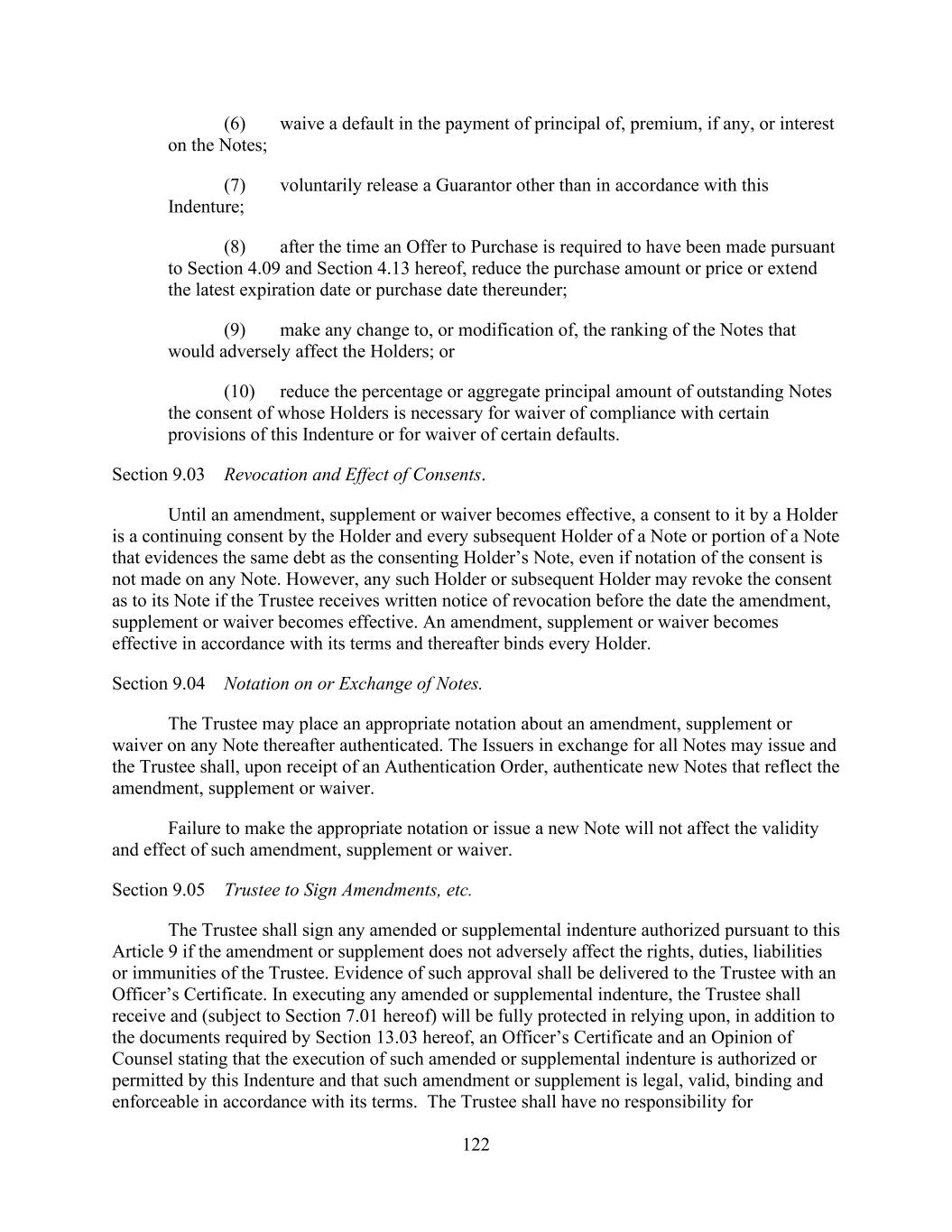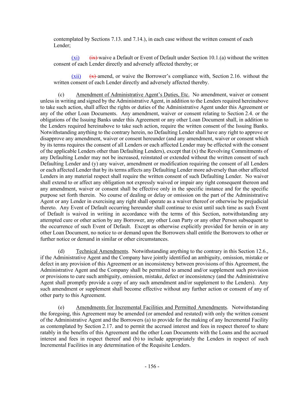 - 156 - contemplated by Sections 7.13. and 7.14.), in each case without the written consent of each Lender; (xi) (ix) waive a Default or Event of Default under Section 10.1.(a) without the written consent of each Lender directly and adversely affected thereby; or (xii) (x) amend, or waive the Borrower’s compliance with, Section 2.16. without the written consent of each Lender directly and adversely affected thereby. (c) Amendment of Administrative Agent’s Duties, Etc. No amendment, waiver or consent unless in writing and signed by the Administrative Agent, in addition to the Lenders required hereinabove to take such action, shall affect the rights or duties of the Administrative Agent under this Agreement or any of the other Loan Documents. Any amendment, waiver or consent relating to Section 2.4. or the obligations of the Issuing Banks under this Agreement or any other Loan Document shall, in addition to the Lenders required hereinabove to take such action, require the written consent of the Issuing Banks. Notwithstanding anything to the contrary herein, no Defaulting Lender shall have any right to approve or disapprove any amendment, waiver or consent hereunder (and any amendment, waiver or consent which by its terms requires the consent of all Lenders or each affected Lender may be effected with the consent of the applicable Lenders other than Defaulting Lenders), except that (x) the Revolving Commitments of any Defaulting Lender may not be increased, reinstated or extended without the written consent of such Defaulting Lender and (y) any waiver, amendment or modification requiring the consent of all Lenders or each affected Lender that by its terms affects any Defaulting Lender more adversely than other affected Lenders in any material respect shall require the written consent of such Defaulting Lender. No waiver shall extend to or affect any obligation not expressly waived or impair any right consequent thereon and any amendment, waiver or consent shall be effective only in the specific instance and for the specific purpose set forth therein. No course of dealing or delay or omission on the part of the Administrative Agent or any Lender in exercising any right shall operate as a waiver thereof or otherwise be prejudicial thereto. Any Event of Default occurring hereunder shall continue to exist until such time as such Event of Default is waived in writing in accordance with the terms of this Section, notwithstanding any attempted cure or other action by any Borrower, any other Loan Party or any other Person subsequent to the occurrence of such Event of Default. Except as otherwise explicitly provided for herein or in any other Loan Document, no notice to or demand upon the Borrowers shall entitle the Borrowers to other or further notice or demand in similar or other circumstances. (d) Technical Amendments. Notwithstanding anything to the contrary in this Section 12.6., if the Administrative Agent and the Company have jointly identified an ambiguity, omission, mistake or defect in any provision of this Agreement or an inconsistency between provisions of this Agreement, the Administrative Agent and the Company shall be permitted to amend and/or supplement such provision or provisions to cure such ambiguity, omission, mistake, defect or inconsistency (and the Administrative Agent shall promptly provide a copy of any such amendment and/or supplement to the Lenders). Any such amendment or supplement shall become effective without any further action or consent of any of other party to this Agreement. (e) Amendments for Incremental Facilities and Permitted Amendments. Notwithstanding the foregoing, this Agreement may be amended (or amended and restated) with only the written consent of the Administrative Agent and the Borrowers (a) to provide for the making of any Incremental Facility as contemplated by Section 2.17. and to permit the accrued interest and fees in respect thereof to share ratably in the benefits of this Agreement and the other Loan Documents with the Loans and the accrued interest and fees in respect thereof and (b) to include appropriately the Lenders in respect of such Incremental Facilities in any determination of the Requisite Lenders.
