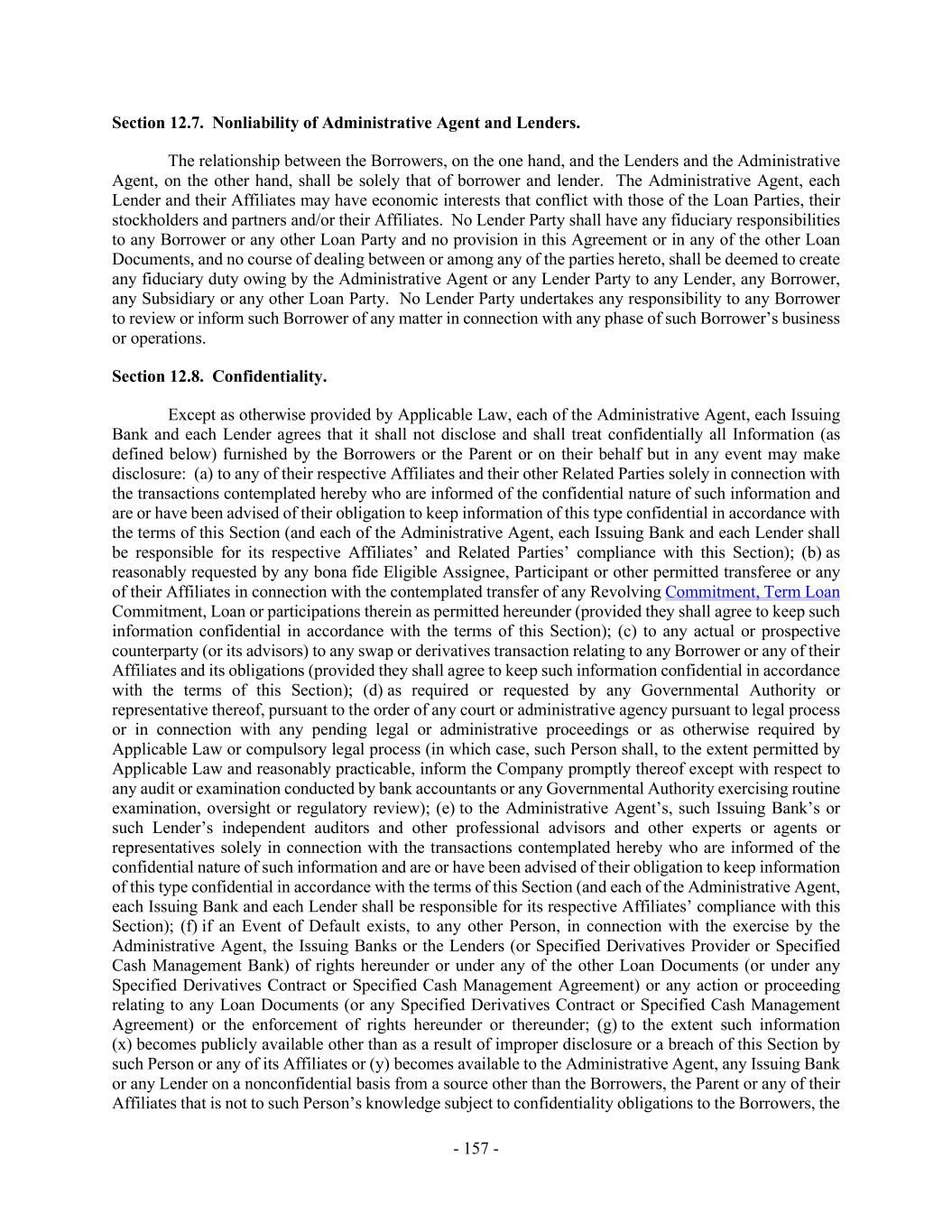 - 157 - Section 12.7. Nonliability of Administrative Agent and Lenders. The relationship between the Borrowers, on the one hand, and the Lenders and the Administrative Agent, on the other hand, shall be solely that of borrower and lender. The Administrative Agent, each Lender and their Affiliates may have economic interests that conflict with those of the Loan Parties, their stockholders and partners and/or their Affiliates. No Lender Party shall have any fiduciary responsibilities to any Borrower or any other Loan Party and no provision in this Agreement or in any of the other Loan Documents, and no course of dealing between or among any of the parties hereto, shall be deemed to create any fiduciary duty owing by the Administrative Agent or any Lender Party to any Lender, any Borrower, any Subsidiary or any other Loan Party. No Lender Party undertakes any responsibility to any Borrower to review or inform such Borrower of any matter in connection with any phase of such Borrower’s business or operations. Section 12.8. Confidentiality. Except as otherwise provided by Applicable Law, each of the Administrative Agent, each Issuing Bank and each Lender agrees that it shall not disclose and shall treat confidentially all Information (as defined below) furnished by the Borrowers or the Parent or on their behalf but in any event may make disclosure: (a) to any of their respective Affiliates and their other Related Parties solely in connection with the transactions contemplated hereby who are informed of the confidential nature of such information and are or have been advised of their obligation to keep information of this type confidential in accordance with the terms of this Section (and each of the Administrative Agent, each Issuing Bank and each Lender shall be responsible for its respective Affiliates’ and Related Parties’ compliance with this Section); (b) as reasonably requested by any bona fide Eligible Assignee, Participant or other permitted transferee or any of their Affiliates in connection with the contemplated transfer of any Revolving Commitment, Term Loan Commitment, Loan or participations therein as permitted hereunder (provided they shall agree to keep such information confidential in accordance with the terms of this Section); (c) to any actual or prospective counterparty (or its advisors) to any swap or derivatives transaction relating to any Borrower or any of their Affiliates and its obligations (provided they shall agree to keep such information confidential in accordance with the terms of this Section); (d) as required or requested by any Governmental Authority or representative thereof, pursuant to the order of any court or administrative agency pursuant to legal process or in connection with any pending legal or administrative proceedings or as otherwise required by Applicable Law or compulsory legal process (in which case, such Person shall, to the extent permitted by Applicable Law and reasonably practicable, inform the Company promptly thereof except with respect to any audit or examination conducted by bank accountants or any Governmental Authority exercising routine examination, oversight or regulatory review); (e) to the Administrative Agent’s, such Issuing Bank’s or such Lender’s independent auditors and other professional advisors and other experts or agents or representatives solely in connection with the transactions contemplated hereby who are informed of the confidential nature of such information and are or have been advised of their obligation to keep information of this type confidential in accordance with the terms of this Section (and each of the Administrative Agent, each Issuing Bank and each Lender shall be responsible for its respective Affiliates’ compliance with this Section); (f) if an Event of Default exists, to any other Person, in connection with the exercise by the Administrative Agent, the Issuing Banks or the Lenders (or Specified Derivatives Provider or Specified Cash Management Bank) of rights hereunder or under any of the other Loan Documents (or under any Specified Derivatives Contract or Specified Cash Management Agreement) or any action or proceeding relating to any Loan Documents (or any Specified Derivatives Contract or Specified Cash Management Agreement) or the enforcement of rights hereunder or thereunder; (g) to the extent such information (x) becomes publicly available other than as a result of improper disclosure or a breach of this Section by such Person or any of its Affiliates or (y) becomes available to the Administrative Agent, any Issuing Bank or any Lender on a nonconfidential basis from a source other than the Borrowers, the Parent or any of their Affiliates that is not to such Person’s knowledge subject to confidentiality obligations to the Borrowers, the