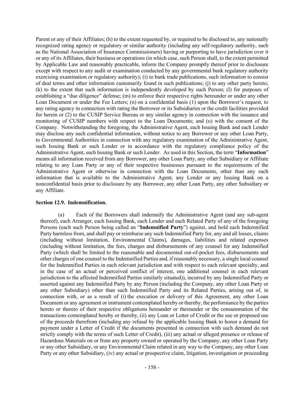 - 158 - Parent or any of their Affiliates; (h) to the extent requested by, or required to be disclosed to, any nationally recognized rating agency or regulatory or similar authority (including any self-regulatory authority, such as the National Association of Insurance Commissioners) having or purporting to have jurisdiction over it or any of its Affiliates, their business or operations (in which case, such Person shall, to the extent permitted by Applicable Law and reasonably practicable, inform the Company promptly thereof prior to disclosure except with respect to any audit or examination conducted by any governmental bank regulatory authority exercising examination or regulatory authority); (i) to bank trade publications, such information to consist of deal terms and other information customarily found in such publications; (j) to any other party hereto; (k) to the extent that such information is independently developed by such Person; (l) for purposes of establishing a “due diligence” defense; (m) to enforce their respective rights hereunder or under any other Loan Document or under the Fee Letters; (n) on a confidential basis (1) upon the Borrower’s request, to any rating agency in connection with rating the Borrower or its Subsidiaries or the credit facilities provided for herein or (2) to the CUSIP Service Bureau or any similar agency in connection with the issuance and monitoring of CUSIP numbers with respect to the Loan Documents; and (o) with the consent of the Company. Notwithstanding the foregoing, the Administrative Agent, each Issuing Bank and each Lender may disclose any such confidential information, without notice to any Borrower or any other Loan Party, to Governmental Authorities in connection with any regulatory examination of the Administrative Agent, such Issuing Bank or such Lender or in accordance with the regulatory compliance policy of the Administrative Agent, such Issuing Bank or such Lender. As used in this Section, the term “Information” means all information received from any Borrower, any other Loan Party, any other Subsidiary or Affiliate relating to any Loan Party or any of their respective businesses pursuant to the requirements of the Administrative Agent or otherwise in connection with the Loan Documents, other than any such information that is available to the Administrative Agent, any Lender or any Issuing Bank on a nonconfidential basis prior to disclosure by any Borrower, any other Loan Party, any other Subsidiary or any Affiliate. Section 12.9. Indemnification. (a) Each of the Borrowers shall indemnify the Administrative Agent (and any sub-agent thereof), each Arranger, each Issuing Bank, each Lender and each Related Party of any of the foregoing Persons (each such Person being called an “Indemnified Party”) against, and hold each Indemnified Party harmless from, and shall pay or reimburse any such Indemnified Party for, any and all losses, claims (including without limitation, Environmental Claims), damages, liabilities and related expenses (including without limitation, the fees, charges and disbursements of any counsel for any Indemnified Party (which shall be limited to the reasonable and documented out-of-pocket fees, disbursements and other charges of one counsel to the Indemnified Parties and, if reasonably necessary, a single local counsel for the Indemnified Parties in each relevant jurisdiction and with respect to each relevant specialty, and in the case of an actual or perceived conflict of interest, one additional counsel in each relevant jurisdiction to the affected Indemnified Parties similarly situated)), incurred by any Indemnified Party or asserted against any Indemnified Party by any Person (including the Company, any other Loan Party or any other Subsidiary) other than such Indemnified Party and its Related Parties, arising out of, in connection with, or as a result of (i) the execution or delivery of this Agreement, any other Loan Document or any agreement or instrument contemplated hereby or thereby, the performance by the parties hereto or thereto of their respective obligations hereunder or thereunder or the consummation of the transactions contemplated hereby or thereby, (ii) any Loan or Letter of Credit or the use or proposed use of the proceeds therefrom (including any refusal by the applicable Issuing Bank to honor a demand for payment under a Letter of Credit if the documents presented in connection with such demand do not strictly comply with the terms of such Letter of Credit), (iii) any actual or alleged presence or release of Hazardous Materials on or from any property owned or operated by the Company, any other Loan Party or any other Subsidiary, or any Environmental Claim related in any way to the Company, any other Loan Party or any other Subsidiary, (iv) any actual or prospective claim, litigation, investigation or proceeding