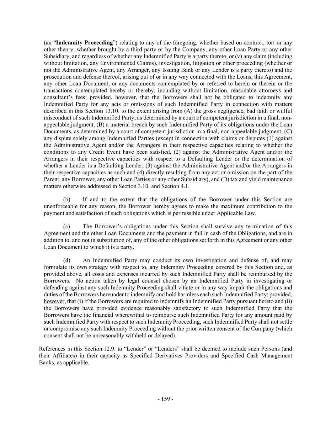 - 159 - (an “Indemnity Proceeding”) relating to any of the foregoing, whether based on contract, tort or any other theory, whether brought by a third party or by the Company, any other Loan Party or any other Subsidiary, and regardless of whether any Indemnified Party is a party thereto, or (v) any claim (including without limitation, any Environmental Claims), investigation, litigation or other proceeding (whether or not the Administrative Agent, any Arranger, any Issuing Bank or any Lender is a party thereto) and the prosecution and defense thereof, arising out of or in any way connected with the Loans, this Agreement, any other Loan Document, or any documents contemplated by or referred to herein or therein or the transactions contemplated hereby or thereby, including without limitation, reasonable attorneys and consultant’s fees; provided, however, that the Borrowers shall not be obligated to indemnify any Indemnified Party for any acts or omissions of such Indemnified Party in connection with matters described in this Section 13.10. to the extent arising from (A) the gross negligence, bad faith or willful misconduct of such Indemnified Party, as determined by a court of competent jurisdiction in a final, non- appealable judgment, (B) a material breach by such Indemnified Party of its obligations under the Loan Documents, as determined by a court of competent jurisdiction in a final, non-appealable judgment, (C) any dispute solely among Indemnified Parties (except in connection with claims or disputes (1) against the Administrative Agent and/or the Arrangers in their respective capacities relating to whether the conditions to any Credit Event have been satisfied, (2) against the Administrative Agent and/or the Arrangers in their respective capacities with respect to a Defaulting Lender or the determination of whether a Lender is a Defaulting Lender, (3) against the Administrative Agent and/or the Arrangers in their respective capacities as such and (4) directly resulting from any act or omission on the part of the Parent, any Borrower, any other Loan Parties or any other Subsidiary), and (D) tax and yield maintenance matters otherwise addressed in Section 3.10. and Section 4.1. (b) If and to the extent that the obligations of the Borrower under this Section are unenforceable for any reason, the Borrower hereby agrees to make the maximum contribution to the payment and satisfaction of such obligations which is permissible under Applicable Law. (c) The Borrower’s obligations under this Section shall survive any termination of this Agreement and the other Loan Documents and the payment in full in cash of the Obligations, and are in addition to, and not in substitution of, any of the other obligations set forth in this Agreement or any other Loan Document to which it is a party. (d) An Indemnified Party may conduct its own investigation and defense of, and may formulate its own strategy with respect to, any Indemnity Proceeding covered by this Section and, as provided above, all costs and expenses incurred by such Indemnified Party shall be reimbursed by the Borrowers. No action taken by legal counsel chosen by an Indemnified Party in investigating or defending against any such Indemnity Proceeding shall vitiate or in any way impair the obligations and duties of the Borrowers hereunder to indemnify and hold harmless each such Indemnified Party; provided, however, that (i) if the Borrowers are required to indemnify an Indemnified Party pursuant hereto and (ii) the Borrowers have provided evidence reasonably satisfactory to such Indemnified Party that the Borrowers have the financial wherewithal to reimburse such Indemnified Party for any amount paid by such Indemnified Party with respect to such Indemnity Proceeding, such Indemnified Party shall not settle or compromise any such Indemnity Proceeding without the prior written consent of the Company (which consent shall not be unreasonably withheld or delayed). References in this Section 12.9. to “Lender” or “Lenders” shall be deemed to include such Persons (and their Affiliates) in their capacity as Specified Derivatives Providers and Specified Cash Management Banks, as applicable.