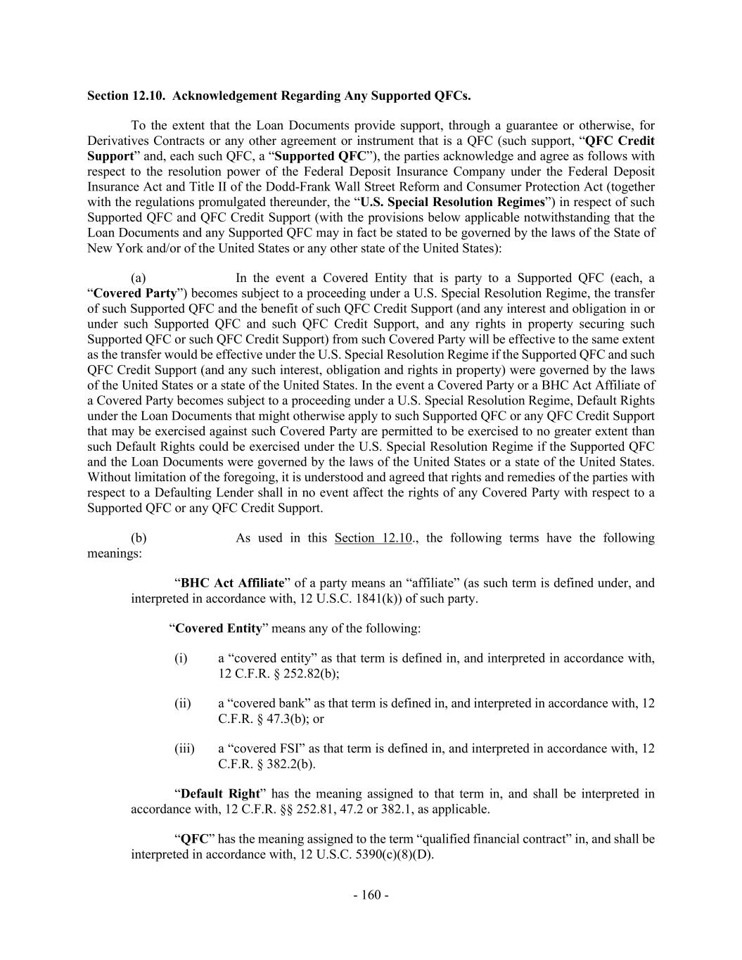 - 160 - Section 12.10. Acknowledgement Regarding Any Supported QFCs. To the extent that the Loan Documents provide support, through a guarantee or otherwise, for Derivatives Contracts or any other agreement or instrument that is a QFC (such support, “QFC Credit Support” and, each such QFC, a “Supported QFC”), the parties acknowledge and agree as follows with respect to the resolution power of the Federal Deposit Insurance Company under the Federal Deposit Insurance Act and Title II of the Dodd-Frank Wall Street Reform and Consumer Protection Act (together with the regulations promulgated thereunder, the “U.S. Special Resolution Regimes”) in respect of such Supported QFC and QFC Credit Support (with the provisions below applicable notwithstanding that the Loan Documents and any Supported QFC may in fact be stated to be governed by the laws of the State of New York and/or of the United States or any other state of the United States): (a) In the event a Covered Entity that is party to a Supported QFC (each, a “Covered Party”) becomes subject to a proceeding under a U.S. Special Resolution Regime, the transfer of such Supported QFC and the benefit of such QFC Credit Support (and any interest and obligation in or under such Supported QFC and such QFC Credit Support, and any rights in property securing such Supported QFC or such QFC Credit Support) from such Covered Party will be effective to the same extent as the transfer would be effective under the U.S. Special Resolution Regime if the Supported QFC and such QFC Credit Support (and any such interest, obligation and rights in property) were governed by the laws of the United States or a state of the United States. In the event a Covered Party or a BHC Act Affiliate of a Covered Party becomes subject to a proceeding under a U.S. Special Resolution Regime, Default Rights under the Loan Documents that might otherwise apply to such Supported QFC or any QFC Credit Support that may be exercised against such Covered Party are permitted to be exercised to no greater extent than such Default Rights could be exercised under the U.S. Special Resolution Regime if the Supported QFC and the Loan Documents were governed by the laws of the United States or a state of the United States. Without limitation of the foregoing, it is understood and agreed that rights and remedies of the parties with respect to a Defaulting Lender shall in no event affect the rights of any Covered Party with respect to a Supported QFC or any QFC Credit Support. (b) As used in this Section 12.10., the following terms have the following meanings: “BHC Act Affiliate” of a party means an “affiliate” (as such term is defined under, and interpreted in accordance with, 12 U.S.C. 1841(k)) of such party. “Covered Entity” means any of the following: (i) a “covered entity” as that term is defined in, and interpreted in accordance with, 12 C.F.R. § 252.82(b); (ii) a “covered bank” as that term is defined in, and interpreted in accordance with, 12 C.F.R. § 47.3(b); or (iii) a “covered FSI” as that term is defined in, and interpreted in accordance with, 12 C.F.R. § 382.2(b). “Default Right” has the meaning assigned to that term in, and shall be interpreted in accordance with, 12 C.F.R. §§ 252.81, 47.2 or 382.1, as applicable. “QFC” has the meaning assigned to the term “qualified financial contract” in, and shall be interpreted in accordance with, 12 U.S.C. 5390(c)(8)(D).