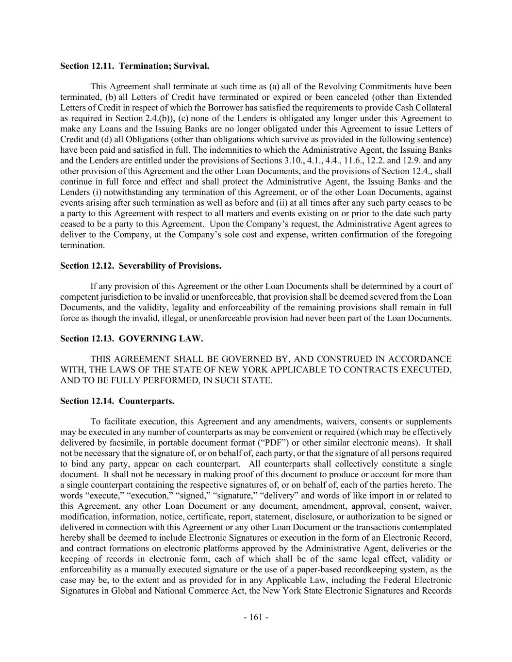 - 161 - Section 12.11. Termination; Survival. This Agreement shall terminate at such time as (a) all of the Revolving Commitments have been terminated, (b) all Letters of Credit have terminated or expired or been canceled (other than Extended Letters of Credit in respect of which the Borrower has satisfied the requirements to provide Cash Collateral as required in Section 2.4.(b)), (c) none of the Lenders is obligated any longer under this Agreement to make any Loans and the Issuing Banks are no longer obligated under this Agreement to issue Letters of Credit and (d) all Obligations (other than obligations which survive as provided in the following sentence) have been paid and satisfied in full. The indemnities to which the Administrative Agent, the Issuing Banks and the Lenders are entitled under the provisions of Sections 3.10., 4.1., 4.4., 11.6., 12.2. and 12.9. and any other provision of this Agreement and the other Loan Documents, and the provisions of Section 12.4., shall continue in full force and effect and shall protect the Administrative Agent, the Issuing Banks and the Lenders (i) notwithstanding any termination of this Agreement, or of the other Loan Documents, against events arising after such termination as well as before and (ii) at all times after any such party ceases to be a party to this Agreement with respect to all matters and events existing on or prior to the date such party ceased to be a party to this Agreement. Upon the Company’s request, the Administrative Agent agrees to deliver to the Company, at the Company’s sole cost and expense, written confirmation of the foregoing termination. Section 12.12. Severability of Provisions. If any provision of this Agreement or the other Loan Documents shall be determined by a court of competent jurisdiction to be invalid or unenforceable, that provision shall be deemed severed from the Loan Documents, and the validity, legality and enforceability of the remaining provisions shall remain in full force as though the invalid, illegal, or unenforceable provision had never been part of the Loan Documents. Section 12.13. GOVERNING LAW. THIS AGREEMENT SHALL BE GOVERNED BY, AND CONSTRUED IN ACCORDANCE WITH, THE LAWS OF THE STATE OF NEW YORK APPLICABLE TO CONTRACTS EXECUTED, AND TO BE FULLY PERFORMED, IN SUCH STATE. Section 12.14. Counterparts. To facilitate execution, this Agreement and any amendments, waivers, consents or supplements may be executed in any number of counterparts as may be convenient or required (which may be effectively delivered by facsimile, in portable document format (“PDF”) or other similar electronic means). It shall not be necessary that the signature of, or on behalf of, each party, or that the signature of all persons required to bind any party, appear on each counterpart. All counterparts shall collectively constitute a single document. It shall not be necessary in making proof of this document to produce or account for more than a single counterpart containing the respective signatures of, or on behalf of, each of the parties hereto. The words “execute,” “execution,” “signed,” “signature,” “delivery” and words of like import in or related to this Agreement, any other Loan Document or any document, amendment, approval, consent, waiver, modification, information, notice, certificate, report, statement, disclosure, or authorization to be signed or delivered in connection with this Agreement or any other Loan Document or the transactions contemplated hereby shall be deemed to include Electronic Signatures or execution in the form of an Electronic Record, and contract formations on electronic platforms approved by the Administrative Agent, deliveries or the keeping of records in electronic form, each of which shall be of the same legal effect, validity or enforceability as a manually executed signature or the use of a paper-based recordkeeping system, as the case may be, to the extent and as provided for in any Applicable Law, including the Federal Electronic Signatures in Global and National Commerce Act, the New York State Electronic Signatures and Records