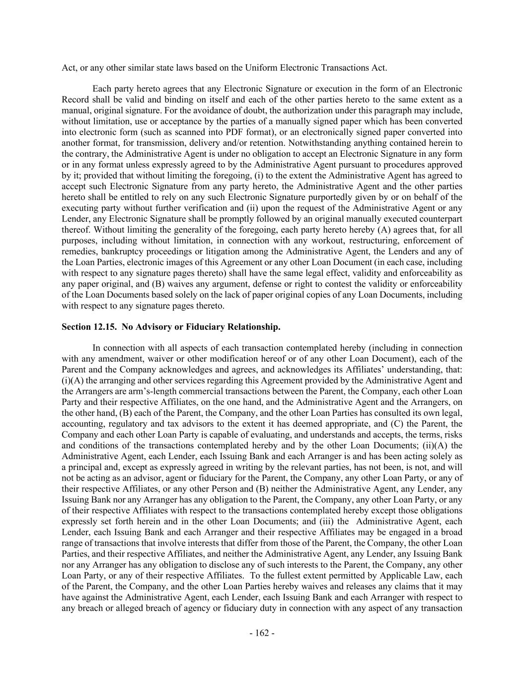 - 162 - Act, or any other similar state laws based on the Uniform Electronic Transactions Act. Each party hereto agrees that any Electronic Signature or execution in the form of an Electronic Record shall be valid and binding on itself and each of the other parties hereto to the same extent as a manual, original signature. For the avoidance of doubt, the authorization under this paragraph may include, without limitation, use or acceptance by the parties of a manually signed paper which has been converted into electronic form (such as scanned into PDF format), or an electronically signed paper converted into another format, for transmission, delivery and/or retention. Notwithstanding anything contained herein to the contrary, the Administrative Agent is under no obligation to accept an Electronic Signature in any form or in any format unless expressly agreed to by the Administrative Agent pursuant to procedures approved by it; provided that without limiting the foregoing, (i) to the extent the Administrative Agent has agreed to accept such Electronic Signature from any party hereto, the Administrative Agent and the other parties hereto shall be entitled to rely on any such Electronic Signature purportedly given by or on behalf of the executing party without further verification and (ii) upon the request of the Administrative Agent or any Lender, any Electronic Signature shall be promptly followed by an original manually executed counterpart thereof. Without limiting the generality of the foregoing, each party hereto hereby (A) agrees that, for all purposes, including without limitation, in connection with any workout, restructuring, enforcement of remedies, bankruptcy proceedings or litigation among the Administrative Agent, the Lenders and any of the Loan Parties, electronic images of this Agreement or any other Loan Document (in each case, including with respect to any signature pages thereto) shall have the same legal effect, validity and enforceability as any paper original, and (B) waives any argument, defense or right to contest the validity or enforceability of the Loan Documents based solely on the lack of paper original copies of any Loan Documents, including with respect to any signature pages thereto. Section 12.15. No Advisory or Fiduciary Relationship. In connection with all aspects of each transaction contemplated hereby (including in connection with any amendment, waiver or other modification hereof or of any other Loan Document), each of the Parent and the Company acknowledges and agrees, and acknowledges its Affiliates’ understanding, that: (i)(A) the arranging and other services regarding this Agreement provided by the Administrative Agent and the Arrangers are arm’s-length commercial transactions between the Parent, the Company, each other Loan Party and their respective Affiliates, on the one hand, and the Administrative Agent and the Arrangers, on the other hand, (B) each of the Parent, the Company, and the other Loan Parties has consulted its own legal, accounting, regulatory and tax advisors to the extent it has deemed appropriate, and (C) the Parent, the Company and each other Loan Party is capable of evaluating, and understands and accepts, the terms, risks and conditions of the transactions contemplated hereby and by the other Loan Documents; (ii)(A) the Administrative Agent, each Lender, each Issuing Bank and each Arranger is and has been acting solely as a principal and, except as expressly agreed in writing by the relevant parties, has not been, is not, and will not be acting as an advisor, agent or fiduciary for the Parent, the Company, any other Loan Party, or any of their respective Affiliates, or any other Person and (B) neither the Administrative Agent, any Lender, any Issuing Bank nor any Arranger has any obligation to the Parent, the Company, any other Loan Party, or any of their respective Affiliates with respect to the transactions contemplated hereby except those obligations expressly set forth herein and in the other Loan Documents; and (iii) the Administrative Agent, each Lender, each Issuing Bank and each Arranger and their respective Affiliates may be engaged in a broad range of transactions that involve interests that differ from those of the Parent, the Company, the other Loan Parties, and their respective Affiliates, and neither the Administrative Agent, any Lender, any Issuing Bank nor any Arranger has any obligation to disclose any of such interests to the Parent, the Company, any other Loan Party, or any of their respective Affiliates. To the fullest extent permitted by Applicable Law, each of the Parent, the Company, and the other Loan Parties hereby waives and releases any claims that it may have against the Administrative Agent, each Lender, each Issuing Bank and each Arranger with respect to any breach or alleged breach of agency or fiduciary duty in connection with any aspect of any transaction