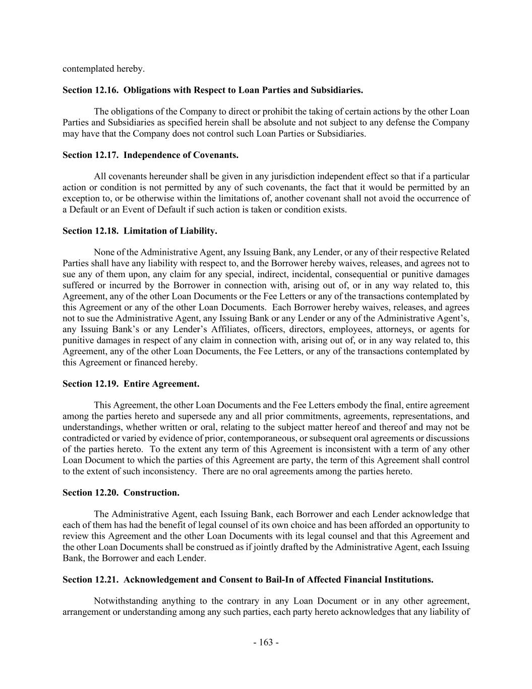 - 163 - contemplated hereby. Section 12.16. Obligations with Respect to Loan Parties and Subsidiaries. The obligations of the Company to direct or prohibit the taking of certain actions by the other Loan Parties and Subsidiaries as specified herein shall be absolute and not subject to any defense the Company may have that the Company does not control such Loan Parties or Subsidiaries. Section 12.17. Independence of Covenants. All covenants hereunder shall be given in any jurisdiction independent effect so that if a particular action or condition is not permitted by any of such covenants, the fact that it would be permitted by an exception to, or be otherwise within the limitations of, another covenant shall not avoid the occurrence of a Default or an Event of Default if such action is taken or condition exists. Section 12.18. Limitation of Liability. None of the Administrative Agent, any Issuing Bank, any Lender, or any of their respective Related Parties shall have any liability with respect to, and the Borrower hereby waives, releases, and agrees not to sue any of them upon, any claim for any special, indirect, incidental, consequential or punitive damages suffered or incurred by the Borrower in connection with, arising out of, or in any way related to, this Agreement, any of the other Loan Documents or the Fee Letters or any of the transactions contemplated by this Agreement or any of the other Loan Documents. Each Borrower hereby waives, releases, and agrees not to sue the Administrative Agent, any Issuing Bank or any Lender or any of the Administrative Agent’s, any Issuing Bank’s or any Lender’s Affiliates, officers, directors, employees, attorneys, or agents for punitive damages in respect of any claim in connection with, arising out of, or in any way related to, this Agreement, any of the other Loan Documents, the Fee Letters, or any of the transactions contemplated by this Agreement or financed hereby. Section 12.19. Entire Agreement. This Agreement, the other Loan Documents and the Fee Letters embody the final, entire agreement among the parties hereto and supersede any and all prior commitments, agreements, representations, and understandings, whether written or oral, relating to the subject matter hereof and thereof and may not be contradicted or varied by evidence of prior, contemporaneous, or subsequent oral agreements or discussions of the parties hereto. To the extent any term of this Agreement is inconsistent with a term of any other Loan Document to which the parties of this Agreement are party, the term of this Agreement shall control to the extent of such inconsistency. There are no oral agreements among the parties hereto. Section 12.20. Construction. The Administrative Agent, each Issuing Bank, each Borrower and each Lender acknowledge that each of them has had the benefit of legal counsel of its own choice and has been afforded an opportunity to review this Agreement and the other Loan Documents with its legal counsel and that this Agreement and the other Loan Documents shall be construed as if jointly drafted by the Administrative Agent, each Issuing Bank, the Borrower and each Lender. Section 12.21. Acknowledgement and Consent to Bail-In of Affected Financial Institutions. Notwithstanding anything to the contrary in any Loan Document or in any other agreement, arrangement or understanding among any such parties, each party hereto acknowledges that any liability of