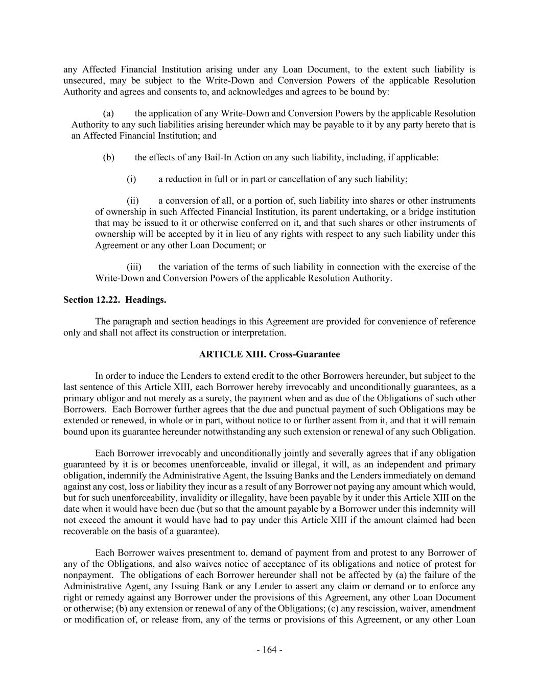 - 164 - any Affected Financial Institution arising under any Loan Document, to the extent such liability is unsecured, may be subject to the Write-Down and Conversion Powers of the applicable Resolution Authority and agrees and consents to, and acknowledges and agrees to be bound by: (a) the application of any Write-Down and Conversion Powers by the applicable Resolution Authority to any such liabilities arising hereunder which may be payable to it by any party hereto that is an Affected Financial Institution; and (b) the effects of any Bail-In Action on any such liability, including, if applicable: (i) a reduction in full or in part or cancellation of any such liability; (ii) a conversion of all, or a portion of, such liability into shares or other instruments of ownership in such Affected Financial Institution, its parent undertaking, or a bridge institution that may be issued to it or otherwise conferred on it, and that such shares or other instruments of ownership will be accepted by it in lieu of any rights with respect to any such liability under this Agreement or any other Loan Document; or (iii) the variation of the terms of such liability in connection with the exercise of the Write-Down and Conversion Powers of the applicable Resolution Authority. Section 12.22. Headings. The paragraph and section headings in this Agreement are provided for convenience of reference only and shall not affect its construction or interpretation. ARTICLE XIII. Cross-Guarantee In order to induce the Lenders to extend credit to the other Borrowers hereunder, but subject to the last sentence of this Article XIII, each Borrower hereby irrevocably and unconditionally guarantees, as a primary obligor and not merely as a surety, the payment when and as due of the Obligations of such other Borrowers. Each Borrower further agrees that the due and punctual payment of such Obligations may be extended or renewed, in whole or in part, without notice to or further assent from it, and that it will remain bound upon its guarantee hereunder notwithstanding any such extension or renewal of any such Obligation. Each Borrower irrevocably and unconditionally jointly and severally agrees that if any obligation guaranteed by it is or becomes unenforceable, invalid or illegal, it will, as an independent and primary obligation, indemnify the Administrative Agent, the Issuing Banks and the Lenders immediately on demand against any cost, loss or liability they incur as a result of any Borrower not paying any amount which would, but for such unenforceability, invalidity or illegality, have been payable by it under this Article XIII on the date when it would have been due (but so that the amount payable by a Borrower under this indemnity will not exceed the amount it would have had to pay under this Article XIII if the amount claimed had been recoverable on the basis of a guarantee). Each Borrower waives presentment to, demand of payment from and protest to any Borrower of any of the Obligations, and also waives notice of acceptance of its obligations and notice of protest for nonpayment. The obligations of each Borrower hereunder shall not be affected by (a) the failure of the Administrative Agent, any Issuing Bank or any Lender to assert any claim or demand or to enforce any right or remedy against any Borrower under the provisions of this Agreement, any other Loan Document or otherwise; (b) any extension or renewal of any of the Obligations; (c) any rescission, waiver, amendment or modification of, or release from, any of the terms or provisions of this Agreement, or any other Loan