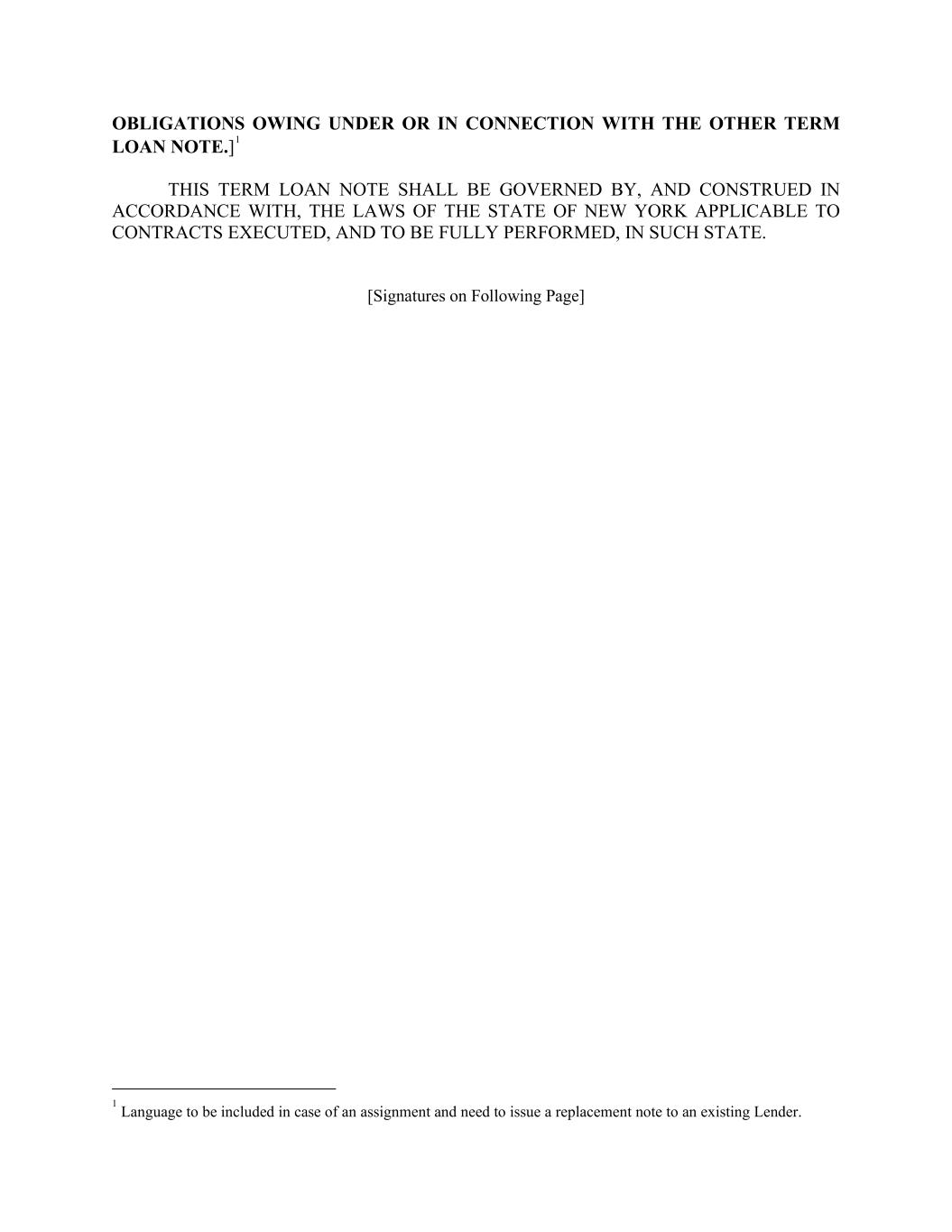 OBLIGATIONS OWING UNDER OR IN CONNECTION WITH THE OTHER TERM LOAN NOTE.]1 THIS TERM LOAN NOTE SHALL BE GOVERNED BY, AND CONSTRUED IN ACCORDANCE WITH, THE LAWS OF THE STATE OF NEW YORK APPLICABLE TO CONTRACTS EXECUTED, AND TO BE FULLY PERFORMED, IN SUCH STATE. [Signatures on Following Page] 1 Language to be included in case of an assignment and need to issue a replacement note to an existing Lender.