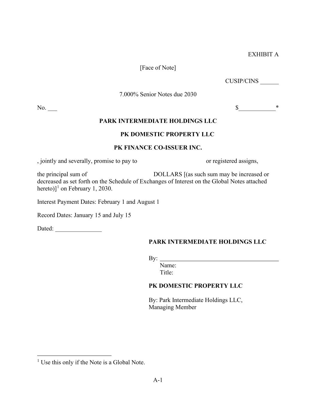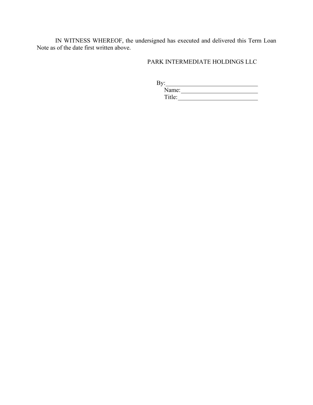 IN WITNESS WHEREOF, the undersigned has executed and delivered this Term Loan Note as of the date first written above. PARK INTERMEDIATE HOLDINGS LLC By: ______________________________ Name: _________________________ Title: __________________________