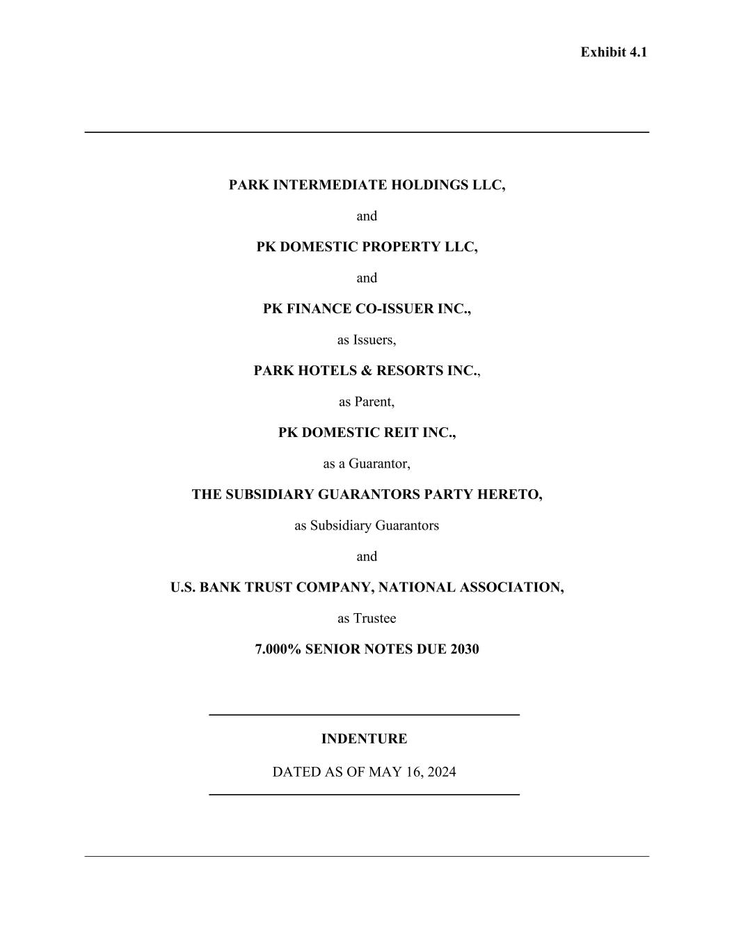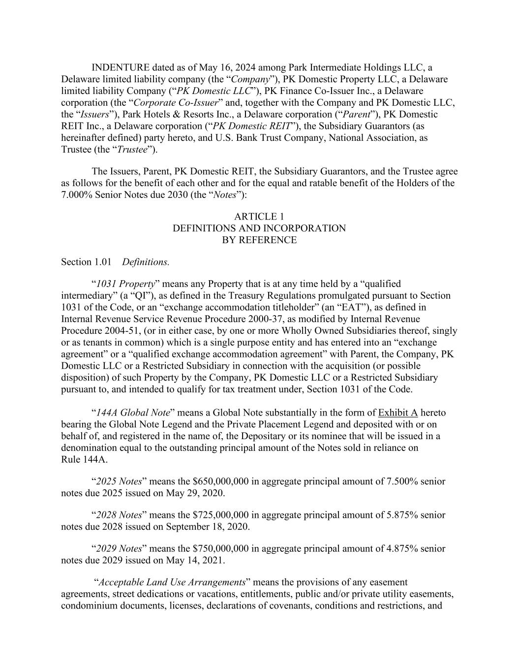 2ACTIVE 220547989 THIS AMENDED AND RESTATED CREDIT AGREEMENT (as amended, restated, supplemented or otherwise modified from time to time, this “Agreement”) dated as of December 1, 2022 by and among PARK INTERMEDIATE HOLDINGS LLC, a Delaware limited liability company (the “Company”), PARK HOTELS & RESORTS INC., a Delaware corporation (the “Parent”), PK DOMESTIC PROPERTY LLC, a Delaware limited liability company (“PK Domestic LLC”), and the other Subsidiaries of the Company from time to time party hereto as Subsidiary Borrowers, each of the financial institutions initially a signatory hereto together with their successors and assignees under Section 12.5. (the “Lenders”), and WELLS FARGO BANK, NATIONAL ASSOCIATION, as Administrative Agent (the “Administrative Agent”). WHEREAS, the Company, the Parent, PK Domestic LLC, the lenders party thereto and the Administrative Agent are currently party to a Credit Agreement, dated as of December 28, 2016 (as amended, restated, supplemented or otherwise modified prior to the date hereof, the “Existing Credit Agreement”). WHEREAS, the parties hereto have agreed to enter into this Agreement in order to (i) amend and restate the Existing Credit Agreement in its entirety; (ii) re-evidence the “Obligations” under, and as defined in, the Existing Credit Agreement, which shall be repayable in accordance with the terms of this Agreement; (iii) set forth the terms and conditions under which the Lenders will, from time to time, make loans to or for the benefit of the Borrowers; and (iv) cause each Departing Lenders (as defined below) to cease to be a party to the Existing Credit Agreement as evidenced by its execution and delivery of its Departing Lender Signature Page. WHEREAS, it is the intent of the parties hereto that this Agreement not constitute a novation of the obligations and liabilities of the parties under the Existing Credit Agreement or be deemed to evidence or constitute full repayment of such obligations and liabilities, but that this Agreement amend and restate in its entirety the Existing Credit Agreement and re-evidence the obligations and liabilities of the Loan Parties outstanding thereunder, which shall be payable in accordance with the terms hereof. WHEREAS, it is also the intent of the Loan Parties to confirm that all obligations under the applicable “Loan Documents” (as referred to and defined in the Existing Credit Agreement) shall, except to the extent expressly provided in Section 5.1., continue in full force and effect as modified or restated by the Loan Documents (as referred to and defined herein) and that, from and after the Effective Date, all references to the “Credit Agreement” contained in any such existing “Loan Documents” shall be deemed to refer to this Agreement. NOW, THEREFORE, for good and valuable consideration, the receipt and sufficiency of which are hereby acknowledged by the parties hereto, the parties hereto agree as follows: ARTICLE I. Definitions Section 1.1. Definitions. In addition to terms defined elsewhere herein, the following terms shall have the following meanings for the purposes of this Agreement: “1031 Property” means any Property or interests (including Equity Interests) in Property that is at any time held by a “qualified intermediary” (a “QI”), as defined in the Treasury Regulations promulgated pursuant to Section 1031 of the Internal Revenue Code, or an “exchange accommodation titleholder” (an “EAT”), as defined in Internal Revenue Service Revenue Procedure 2000-37, as modified by Internal Revenue Procedure 2004-51, (or in either case, by one or more Wholly Owned Subsidiaries thereof, singly