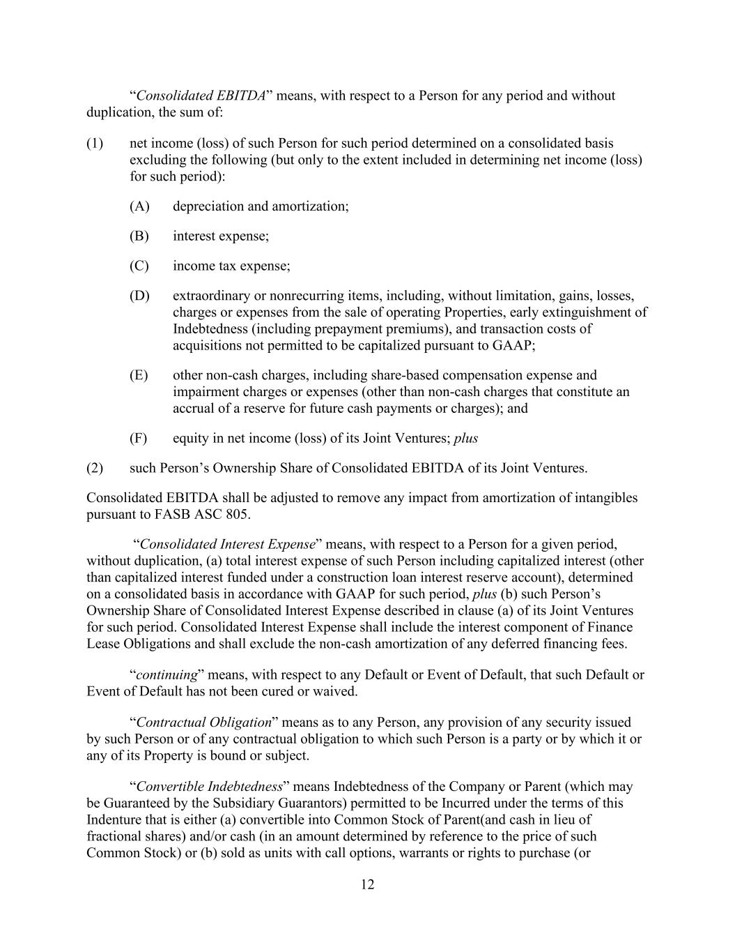 - 11 - (v) other non-cash charges, including share-based compensation expense and impairment charges or expenses (other than non-cash charges that constitute an accrual of a reserve for future cash payments or charges); and (vi) equity in net income (loss) of its Unconsolidated Affiliates; plus (b) such Person’s Ownership Share of Consolidated EBITDA of its Unconsolidated Affiliates. “Consolidated Fixed Charges” means, with respect to a Person and for a given period, the sum of (a) the Consolidated Interest Expense of such Person for such period, plus (b) the aggregate of all regularly scheduled principal payments on Indebtedness payable by such Person during such period (excluding balloon, bullet or similar payments of principal due upon the stated maturity of Indebtedness), plus (c) the aggregate amount of all Preferred Dividends paid by such Person during such period. The Parent’s Ownership Share of the Consolidated Fixed Charges of its Unconsolidated Affiliates will be included when determining the Consolidated Fixed Charges of the Parent. “Consolidated Interest Expense” means, with respect to a Person for a given period, without duplication, (a) total interest expense of such Person including capitalized interest (other than capitalized interest funded under a construction loan interest reserve account), determined on a consolidated basis in accordance with GAAP for such period, plus (b) such Person’s Ownership Share of Consolidated Interest Expense described in clause (a) of its Unconsolidated Affiliates for such period. Consolidated Interest Expense shall include the interest component of Capitalized Lease Obligations and shall exclude the non- cash amortization of any deferred financing fees. “Consolidated Reserve Adjusted EBITDA” means, for any given period, (a) the Consolidated EBITDA of the Parent minus (b) the sum of (i) FF&E Reserves for all Hotel Properties of the Parent and its Subsidiaries for such period and (ii) the Parent’s and its Subsidiaries’ Ownership Share of the FF&E Reserves for all Hotel Properties of their Unconsolidated Affiliates for such period. “Continue”, “Continuation” and “Continued” each refers to the continuation of a Term SOFR Loan from one Interest Period to another Interest Period pursuant to Section 2.10. “Control” means the possession, directly or indirectly, of the power to direct or cause the direction of the management or policies of a Person, whether through the ability to exercise voting power, by contract or otherwise. “Controlling” and “Controlled” have meanings correlative thereto. “Convert”, “Conversion” and “Converted” each refers to the conversion of a Loan of one Type into a Loan of another Type pursuant to Section 2.11. “Core Hotel Property” means, with respect to any Hotel Property, the parcel (or combinations of parcels) upon which is situated the building or buildings comprising all of the guest rooms and meeting and banquet space and with necessary public access and lobby facilities (but excluding any space for restaurants, retail, spa, sports, convention hall, exhibit hall, parking or other ancillary facilities for any Core Hotel Property); provided that with respect to any Core Hotel Property in existence or acquired after the Effective Date, such Core Hotel Property may include such exceptions to the foregoing requirements as the Administrative Agent may determine to be immaterial and approve in its sole discretion. “Covered Entity” has the meaning given that term in Section 12.10.(b). “Covered Party” has the meaning given that term in Section 12.10.(a).