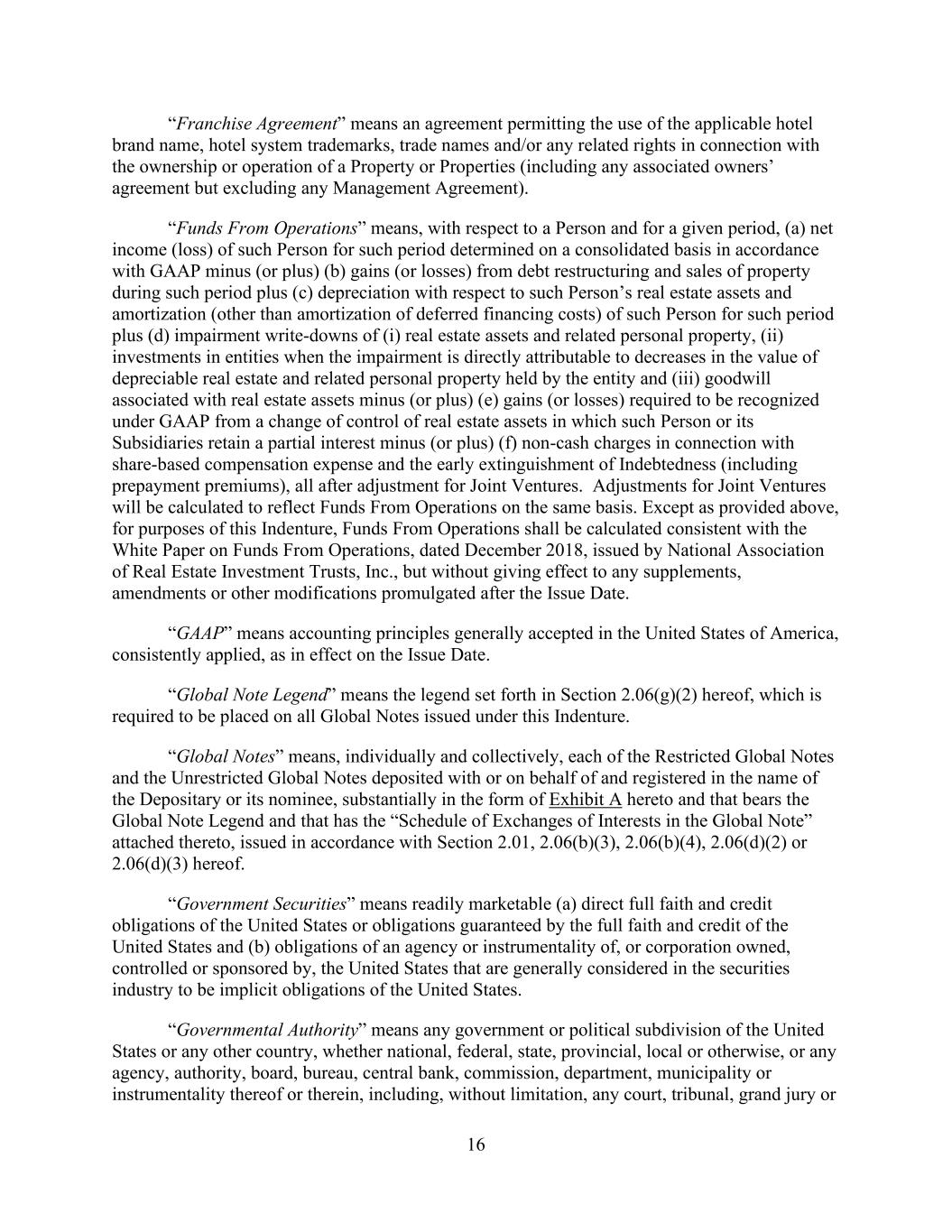 - 22 - Liabilities as to which such Defaulting Lender’s participation obligation has been reallocated to other Lenders or Cash Collateralized in accordance with the terms hereof. “Fund” means any Person (other than a natural person) that is (or will be) engaged in making, purchasing, holding or otherwise investing in commercial loans, bonds and similar extensions of credit in the ordinary course of its activities. “Funds From Operations” means, with respect to a Person and for a given period, (a) net income (loss) of such Person for such period determined on a consolidated basis in accordance with GAAP minus (or plus) (b) gains (or losses) from debt restructuring and sales of property during such period plus (c) depreciation with respect to such Person’s real estate assets and amortization (other than amortization of deferred financing costs) of such Person for such period, all after adjustment for Unconsolidated Affiliates. Adjustments for Unconsolidated Affiliates will be calculated to reflect Funds From Operations on the same basis. For purposes of this Agreement, Funds From Operations shall be calculated consistent with the White Paper on Funds From Operations dated December 2018 issued by National Association of Real Estate Investment Trusts, Inc., but without giving effect to any supplements, amendments or other modifications promulgated after the Effective Date. “GAAP” means generally accepted accounting principles in the United States of America set forth in the opinions and pronouncements of the Accounting Principles Board of the American Institute of Certified Public Accountants and statements and pronouncements of the Financial Accounting Standards Board (including Statement of Financial Accounting Standards No. 168, “The FASB Accounting Standards Codification”) or in such other statements by such other entity as may be approved by a significant segment of the accounting profession in the United States of America, which are applicable to the circumstances as of the date of determination. “Governmental Approvals” means all authorizations, consents, approvals, licenses and exemptions of, registrations and filings with, and reports to, all Governmental Authorities. “Governmental Authority” means any national, state or local government (whether domestic or foreign), any political subdivision thereof or any other governmental, quasi-governmental, judicial, administrative, public or statutory instrumentality, authority, body, agency, bureau, commission, board, department or other entity (including, without limitation, the Federal Deposit Insurance Corporation, the Comptroller of the Currency or the Federal Reserve Board, any central bank or any comparable authority) exercising executive, legislative, judicial, taxing, regulatory or administrative powers or functions of or pertaining to government (including any supra-national bodies such as the European Union or the European Central Bank), or any arbitrator with authority to bind a party at law. “Gross Operating Expenses” means, for any period of time for any Hotel Property, all costs and expenses of maintaining, conducting and supervising the operation of such Hotel Property which are properly attributable to the period under consideration under the Company’s system of accounting, including without limitation (but without duplication): (i) the cost of all food and beverages and Inventory sold or consumed; (ii) salaries and wages of personnel employed at such Hotel Property, including costs of payroll taxes and employee benefits and all other expenses not otherwise specifically referred to in this paragraph which are referred to as “Administrative and General Expenses” in the Uniform System; (iii) the cost of all other goods and services obtained by Manager in connection with its operation of such Hotel Property including, without limitation, heat and utilities, office supplies and all services performed by third parties, including leasing expenses in connection with telephone and data processing equipment; (iv) the cost of repairs to and maintenance of such Hotel Property (excluding capital expenditures); (v) insurance premiums for all insurance maintained with respect to such Hotel Property, including, without limitation, property damage insurance, public liability insurance, and such business interruption or other insurance as