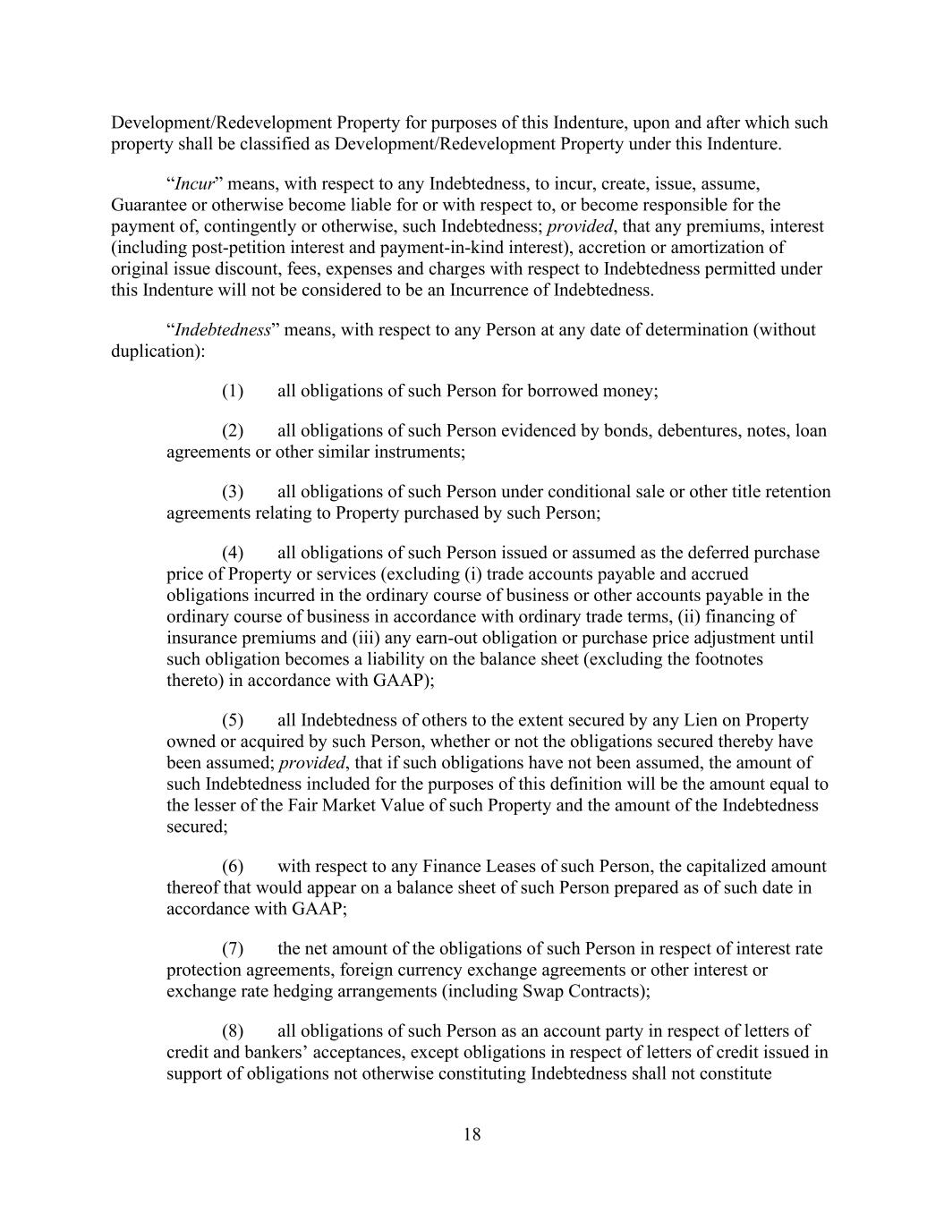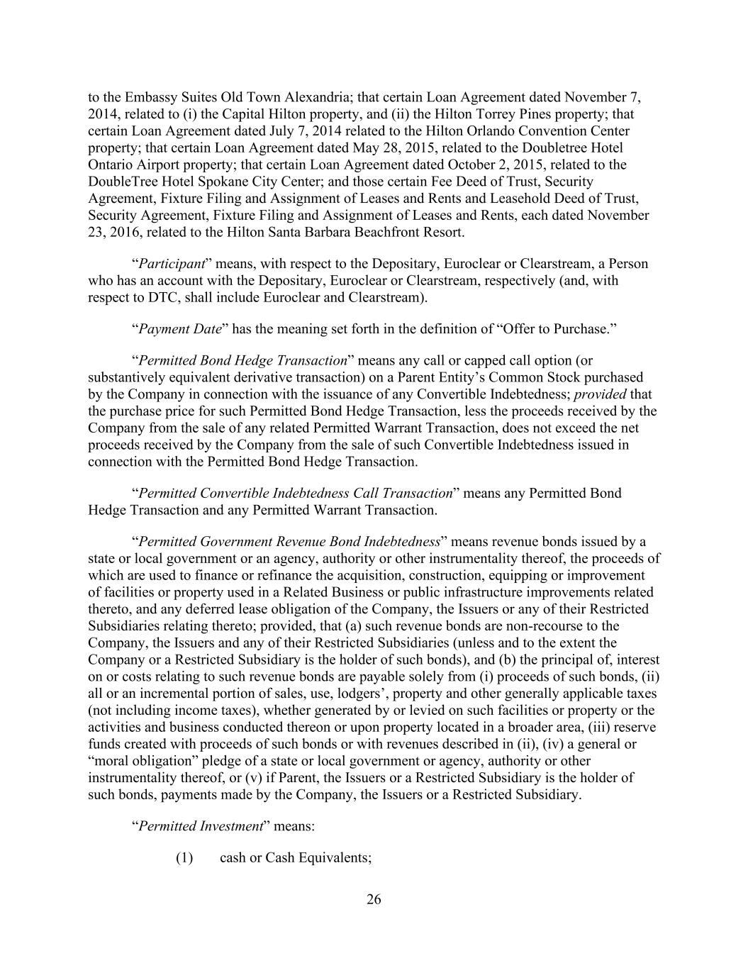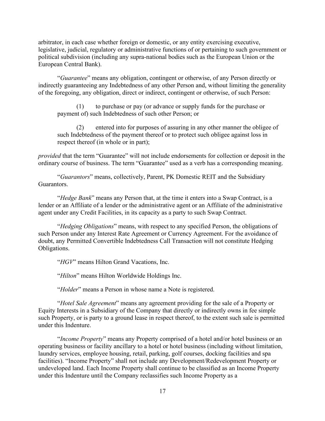 - 25 - “Hilton” means Hilton Worldwide Holdings Inc. “Hilton/HGV Retained Liabilities” collectively has the meaning given to the terms “HLT Retained Liabilities” and “Timeshare Liabilities” in the Distribution Agreement. “Hilton New York” means the Hotel Property commonly known as “New York Hilton Midtown” located at 1335 Avenue of the Americas, New York, New York 10019. “Hostile Acquisition” means (a) the acquisition of the Equity Interests of a Person through a tender offer or similar solicitation of the owners of such Equity Interests which has not been approved or recommended (prior to such acquisition) by the board of directors (or any other applicable governing body) of such Person or by similar action if such Person is not a corporation and (b) any such acquisition as to which such approval or recommendation has been withdrawn. “Hotel Property” means a Property on which there is located an operating hotel, which shall include any operating business ancillary to such operating hotel (including, without limitation, laundry services, employee housing, retail, parking, golf courses, docking facilities and spa facilities). “Hotel Sale Agreement” means any agreement providing for the sale of a Hotel Property or Equity Interests in a Wholly Owned Subsidiary of the Company that directly or indirectly owns in fee simple such Hotel Property, or is party to a ground lease in respect thereof, to the extent such sale is permitted under this Agreement. “Incremental Facility” has the meaning given that term in Section 2.17.(a). “Incremental Facility Amendment” has the meaning given that term in Section 2.17.(d). “Incremental Revolving Commitments” has the meaning given that term in Section 2.17.(a). “Incremental Term Loan Advance” has the meaning given that term in Section 2.17.(a). “Incremental Term Loan Facility” has the meaning given that term in Section 2.17.(a). “Indebtedness” means, with respect to a Person, at the time of computation thereof, all of the following (without duplication): (a) all obligations of such Person in respect of money borrowed or for the deferred purchase price of property or services (other than (i) trade debt incurred in the ordinary course of business and not more than ninety (90) days past due unless being contested in good faith and (ii) bank drafts arising in the ordinary course of business); (b) all obligations of such Person, whether or not for money borrowed (i) represented by notes payable, or drafts accepted, in each case representing extensions of credit, (ii) evidenced by bonds, debentures, notes or similar instruments, or (iii) constituting purchase money indebtedness, conditional sales contracts, title retention debt instruments or other similar instruments, upon which interest charges are customarily paid or that are issued or assumed as full or partial payment for property or for services rendered (other than (i) trade debt incurred in the ordinary course of business and not more than ninety (90) days past due unless being contested in good faith and (ii) bank drafts arising in the ordinary course of business); (c) Capitalized Lease Obligations of such Person;