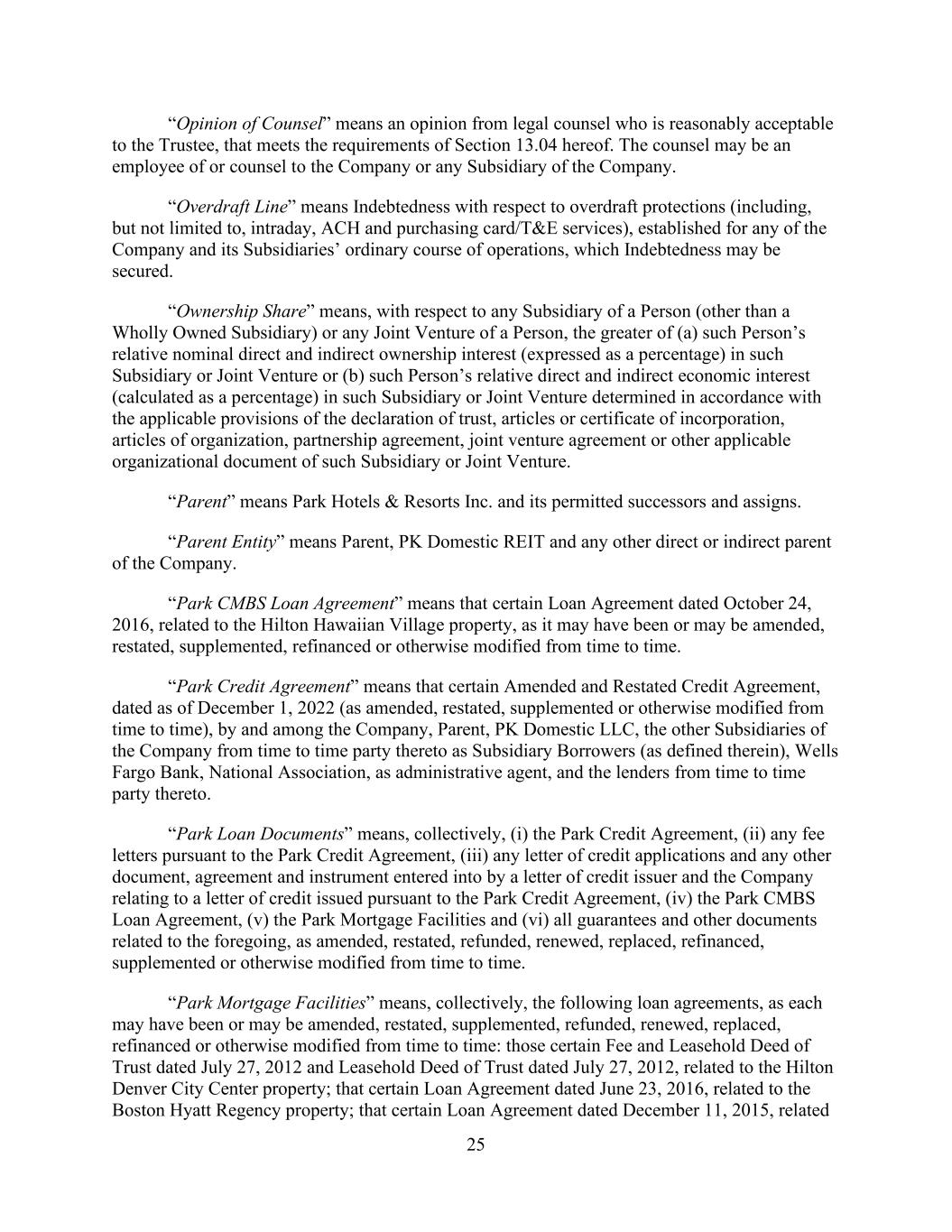 - 52 - exceed $1,000,000 at any time, (c) subordinated intercompany Indebtedness owing to the Parent, (d) intercompany Indebtedness between or among any of the Company and its Subsidiaries, (e) Hilton/HGV Retained Liabilities (solely to the extent Hilton, HGV or their respective Affiliates (other than the Parent and its Subsidiaries) agree to assume, indemnify or reimburse the Parent or any of its Subsidiaries for all obligations or payments made in respect of such Hilton/HGV Retained Liabilities and the assumption, retention or indemnification of such Hilton/HGV Retained Liabilities by Hilton, HGV or their respective Affiliates (other than the Parent and its Subsidiaries) shall not be subject to dispute for a period greater than 45 days following the receipt of a written notice of an Agreement Dispute pursuant to Article IX of the Distribution Agreement or otherwise determined to be unenforceable) and (f) Indebtedness of any non-Wholly Owned Subsidiary the incurrence of which was not subject to the Control or affirmative consent of the Company or any of its Subsidiaries); provided, however, that any non-Wholly Owned Subsidiary that Guarantees Unsecured Indebtedness described above in this definition of the Parent or any Wholly Owned Subsidiary shall be an Unsecured Indebtedness Subsidiary. “Unsecured Interest Expense” means, with respect to a Person and for any period of four consecutive fiscal quarters, the actual Consolidated Interest Expense of such Person for such period on all Unsecured Indebtedness of such Person. “U.S. Government Securities Business Day” means any day except for (a) a Saturday, (b) a Sunday or (c) a day on which the Securities Industry and Financial Markets Association recommends that the fixed income departments of its members be closed for the entire day for purposes of trading in United States government securities; provided, that for purposes of notice requirements in Article II and Section 4.2, such day is also a Business Day. “U.S. Person” means any Person that is a “United States person” as defined in Section 7701(a)(30) of the Internal Revenue Code. “U.S. Special Resolution Regimes” has the meaning given that term in Section 12.10. “U.S. Tax Compliance Certificate” has the meaning assigned to such term in Section 3.10.(g)(ii)(B)(III). “Wells Fargo” means Wells Fargo Bank, National Association, and its successors and assigns. “Wells Fargo Fee Letter” has the meaning assigned to such term in the definition of “Fee Letters”.Letters” means, collectively, (i) that certain fee letter dated as of November 9, 2022, by and among the Company, PK Domestic LLC, Wells Fargo Securities, LLC and the Administrative Agent, and (ii) that certain fee letter dated as of April 17, 2024, by and among the Company, PK Domestic LLC, Wells Fargo Securities, LLC and the Administrative Agent. “Wholly Owned Subsidiary” means any Subsidiary of a Person in respect of which all of the Equity Interests (other than (x) in the case of a corporation, directors’ qualifying shares or (y) Acceptable Preferred Equity Interests) are at the time directly or indirectly owned or controlled by such Person or one or more other Subsidiaries of such Person or by such Person and one or more other Subsidiaries of such Person. “Withholding Agent” means (a) the Company, (b) any other Loan Party and (c) the Administrative Agent, as applicable. “Write-Down and Conversion Powers” means (a) with respect to any EEA Resolution Authority, the write-down and conversion powers of such EEA Resolution Authority from time to time under the Bail-