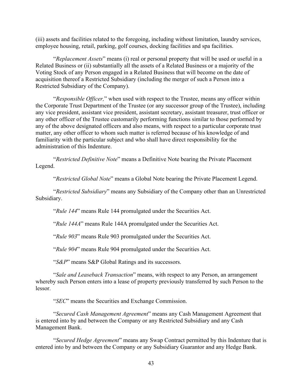 - 45 - “Seasoned Property” means (a) each Hotel Property (other than a New Property or a Development/Redevelopment Property) owned in fee simple by, or subject to a ground lease to, the Company or any of its Subsidiaries or Unconsolidated Affiliates and (b) upon the occurrence of the Seasoned Date of any New Property or election by the Company with respect to any New Property or Development/Redevelopment Property, such Hotel Property. “SEC” means the U.S. Securities and Exchange Commission, or any Governmental Authority succeeding to any of its principal functions. “Secured Indebtedness” means, with respect to a Person as of a given date, the aggregate principal amount of all Indebtedness of such Person outstanding on such date that is secured in any manner by any Lien on any Property or (to the extent hereinafter provided) any Equity Interests; provided, however, that Indebtedness of the type described in clause (g) of the definition of Indebtedness shall not constitute Secured Indebtedness. Notwithstanding the foregoing, Indebtedness that is secured by a pledge of Equity Interests and not by Property owned by the issuer of such Equity Interests shall constitute Secured Indebtedness only if such Property also secures Indebtedness of such issuer. “Secured Leverage Ratio” has the meaning given that term in Section 9.1.(c). “Securities Act” means the Securities Act of 1933. “SOFR” means a rate equal to the secured overnight financing rate as administered by the SOFR Administrator. “SOFR Administrator” means the Federal Reserve Bank of New York (or a successor administrator of the secured overnight financing rate). “SOFR Administrator’s Website” means the website of the Federal Reserve Bank of New York, currently at http://www.newyorkfed.org, or any successor source for the secured overnight financing rate identified as such by the SOFR Administrator from time to time. “SOFR Auction” means a solicitation of Bid Rate Quotes setting forth SOFR Margin Loans based on SOFR pursuant to Section 2.3. “SOFR Margin” has the meaning given that term in Section 2.3.(c)(ii)(D). “SOFR Margin Loan” means a Bid Rate Loan the interest rate on which is determined on the basis of SOFR pursuant to a SOFR Auction. “Solvent” means, when used with respect to any Person, that (a) the fair value and the fair salable value of its assets (excluding any Indebtedness due from any Affiliate of such Person) are each in excess of the fair valuation of its total existing debts and liabilities (including all contingent liabilities), as such value and such liabilities are determined in accordance with Section 101 of the Bankruptcy Code or Sections 1 and 2 of the Uniform Fraudulent Transfer Act; (b) such Person is able to generally pay its debts or other obligations in the ordinary course as they mature; and (c) such Person has capital not unreasonably small to carry on its business and all business in which it proposes to be engaged. “Specified Cash Management Agreement” means any Cash Management Agreement that is made or entered into at any time, or in effect at any time now or hereafter, whether as a result of an assignment or transfer or otherwise, between or among any Loan Party and any Specified Cash
