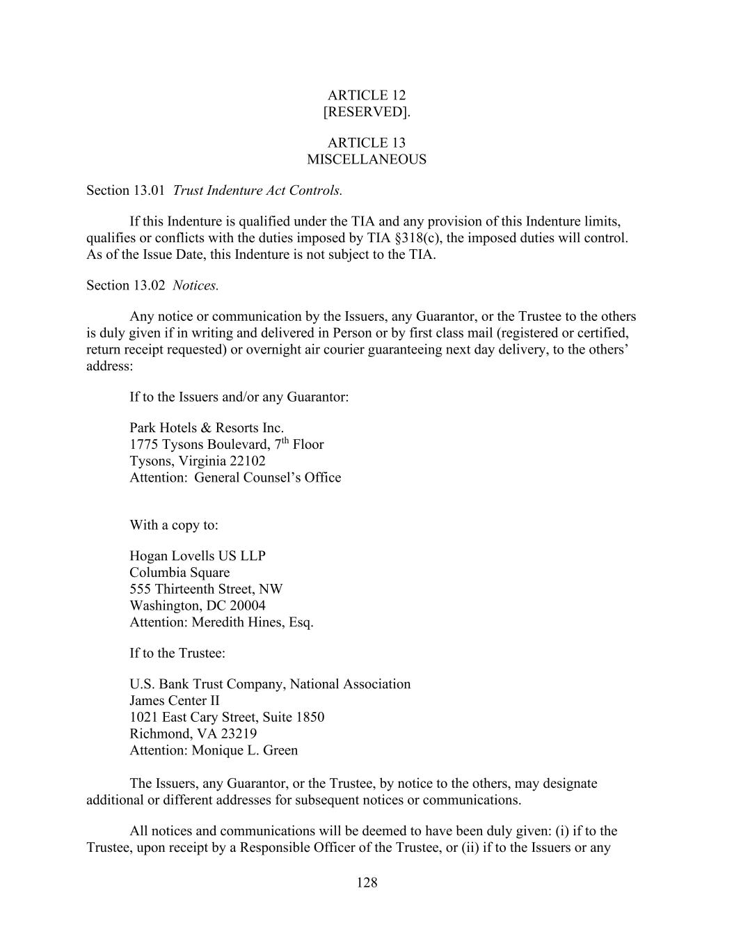 - 143 - and solely with respect to the amount of such Erroneous Payment that is, comprised of funds received by the Administrative Agent from a Borrower or any other Loan Party for the purpose of making a payment on the Obligations and (z) to the extent that an Erroneous Payment was in any way or at any time credited as payment or satisfaction of any of the Obligations, the Obligations or any part thereof that were so credited, and all rights of the Payment Recipient, as the case may be, shall be reinstated and continue in full force and effect as if such payment or satisfaction had never been received. (f) Each party’s obligations under this Section 11.12. shall survive the resignation or replacement of the Administrative Agent or any transfer of right or obligations by, or the replacement of, a Lender, the termination of the Revolving Commitments or the repayment, satisfaction or discharge of all Obligations (or any portion thereof) under any Loan Document. Nothing in this Section 11.12. will constitute a waiver or release of any claim of any party hereunder arising from any Payment Recipient’s receipt of an Erroneous Payment. ARTICLE XII. Miscellaneous Section 12.1. Notices. (a) Unless otherwise provided herein (including, without limitation, as provided in Section 8.5.), communications provided for hereunder shall be in writing and shall be mailed, e-mailed, or delivered as follows: If to the Borrower: Park Intermediate Holdings LLC c/o Park Hotels & Resorts Inc. 1775 Tysons Blvd., 7th Floor McLean, VA 22102 Attn: General Counsel’s Office Telephone: (571) 302-5757 E-mail: generalcounsel@pkhotelsandresorts.com and nvu@pkhotelsandresorts.com If to the Parent: Park Hotels & Resorts Inc. 1775 Tysons Blvd., 7th Floor McLean, VA 22102 Attn: General Counsel’s Office Telephone: (571) 302-5757 E-mail: generalcounsel@pkhotelsandresorts.com and nvu@pkhotelsandresorts.com If to the Administrative Agent: Wells Fargo Bank, National Association 550 South Tryon Street, 20th Floor Charlotte, NC 28202 Attn: Dan Dyer Telephone: (704) 715-8147 E-mail: Daniel.S.Dyer@wellsfargo.com