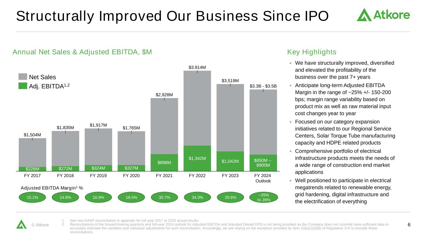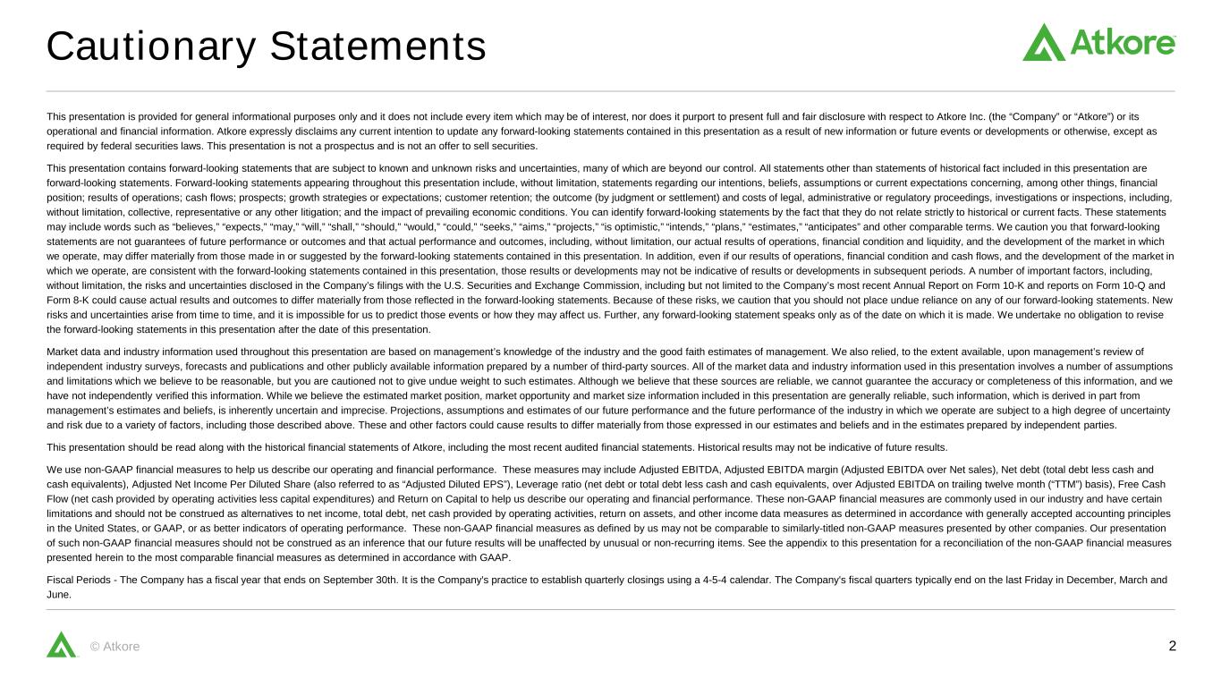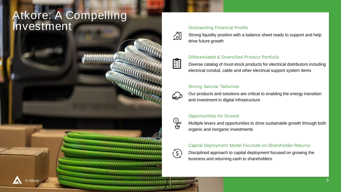 2© Atkore This presentation is provided for general informational purposes only and it does not include every item which may be of interest, nor does it purport to present full and fair disclosure with respect to Atkore Inc. (the “Company” or “Atkore”) or its operational and financial information. Atkore expressly disclaims any current intention to update any forward-looking statements contained in this presentation as a result of new information or future events or developments or otherwise, except as required by federal securities laws. This presentation is not a prospectus and is not an offer to sell securities. This presentation contains forward-looking statements that are subject to known and unknown risks and uncertainties, many of which are beyond our control. All statements other than statements of historical fact included in this presentation are forward-looking statements. Forward-looking statements appearing throughout this presentation include, without limitation, statements regarding our intentions, beliefs, assumptions or current expectations concerning, among other things, financial position; results of operations; cash flows; prospects; growth strategies or expectations; customer retention; the outcome (by judgment or settlement) and costs of legal, administrative or regulatory proceedings, investigations or inspections, including, without limitation, collective, representative or any other litigation; and the impact of prevailing economic conditions. You can identify forward-looking statements by the fact that they do not relate strictly to historical or current facts. These statements may include words such as “believes,” “expects,” “may,” “will,” “shall,” “should,” “would,” “could,” “seeks,” “aims,” “projects,” “is optimistic,” “intends,” “plans,” “estimates,” “anticipates” and other comparable terms. We caution you that forward-looking statements are not guarantees of future performance or outcomes and that actual performance and outcomes, including, without limitation, our actual results of operations, financial condition and liquidity, and the development of the market in which we operate, may differ materially from those made in or suggested by the forward-looking statements contained in this presentation. In addition, even if our results of operations, financial condition and cash flows, and the development of the market in which we operate, are consistent with the forward-looking statements contained in this presentation, those results or developments may not be indicative of results or developments in subsequent periods. A number of important factors, including, without limitation, the risks and uncertainties disclosed in the Company’s filings with the U.S. Securities and Exchange Commission, including but not limited to the Company’s most recent Annual Report on Form 10-K and reports on Form 10-Q and Form 8-K could cause actual results and outcomes to differ materially from those reflected in the forward-looking statements. Because of these risks, we caution that you should not place undue reliance on any of our forward-looking statements. New risks and uncertainties arise from time to time, and it is impossible for us to predict those events or how they may affect us. Further, any forward-looking statement speaks only as of the date on which it is made. We undertake no obligation to revise the forward-looking statements in this presentation after the date of this presentation. Market data and industry information used throughout this presentation are based on management’s knowledge of the industry and the good faith estimates of management. We also relied, to the extent available, upon management’s review of independent industry surveys, forecasts and publications and other publicly available information prepared by a number of third-party sources. All of the market data and industry information used in this presentation involves a number of assumptions and limitations which we believe to be reasonable, but you are cautioned not to give undue weight to such estimates. Although we believe that these sources are reliable, we cannot guarantee the accuracy or completeness of this information, and we have not independently verified this information. While we believe the estimated market position, market opportunity and market size information included in this presentation are generally reliable, such information, which is derived in part from management’s estimates and beliefs, is inherently uncertain and imprecise. Projections, assumptions and estimates of our future performance and the future performance of the industry in which we operate are subject to a high degree of uncertainty and risk due to a variety of factors, including those described above. These and other factors could cause results to differ materially from those expressed in our estimates and beliefs and in the estimates prepared by independent parties. This presentation should be read along with the historical financial statements of Atkore, including the most recent audited financial statements. Historical results may not be indicative of future results. We use non-GAAP financial measures to help us describe our operating and financial performance. These measures may include Adjusted EBITDA, Adjusted EBITDA margin (Adjusted EBITDA over Net sales), Net debt (total debt less cash and cash equivalents), Adjusted Net Income Per Diluted Share (also referred to as “Adjusted Diluted EPS”), Leverage ratio (net debt or total debt less cash and cash equivalents, over Adjusted EBITDA on trailing twelve month (“TTM”) basis), Free Cash Flow (net cash provided by operating activities less capital expenditures) and Return on Capital to help us describe our operating and financial performance. These non-GAAP financial measures are commonly used in our industry and have certain limitations and should not be construed as alt