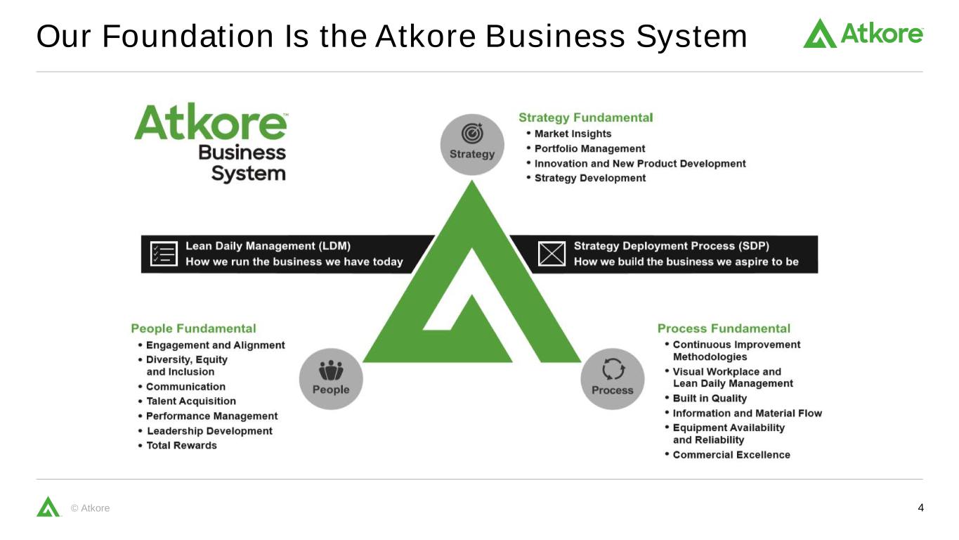 3© Atkore Atkore: A Compelling Investment Outstanding Financial Profile Strong liquidity position with a balance sheet ready to support and help drive future growth Differentiated & Diversified Product Portfolio Diverse catalog of must-stock products for electrical distributors including electrical conduit, cable and other electrical support system items Strong Secular Tailwinds Our products and solutions are critical to enabling the energy transition and investment in digital infrastructure Opportunities for Growth Multiple levers and opportunities to drive sustainable growth through both organic and inorganic investments Capital Deployment Model Focused on Shareholder Returns Disciplined approach to capital deployment focused on growing the business and returning cash to shareholders