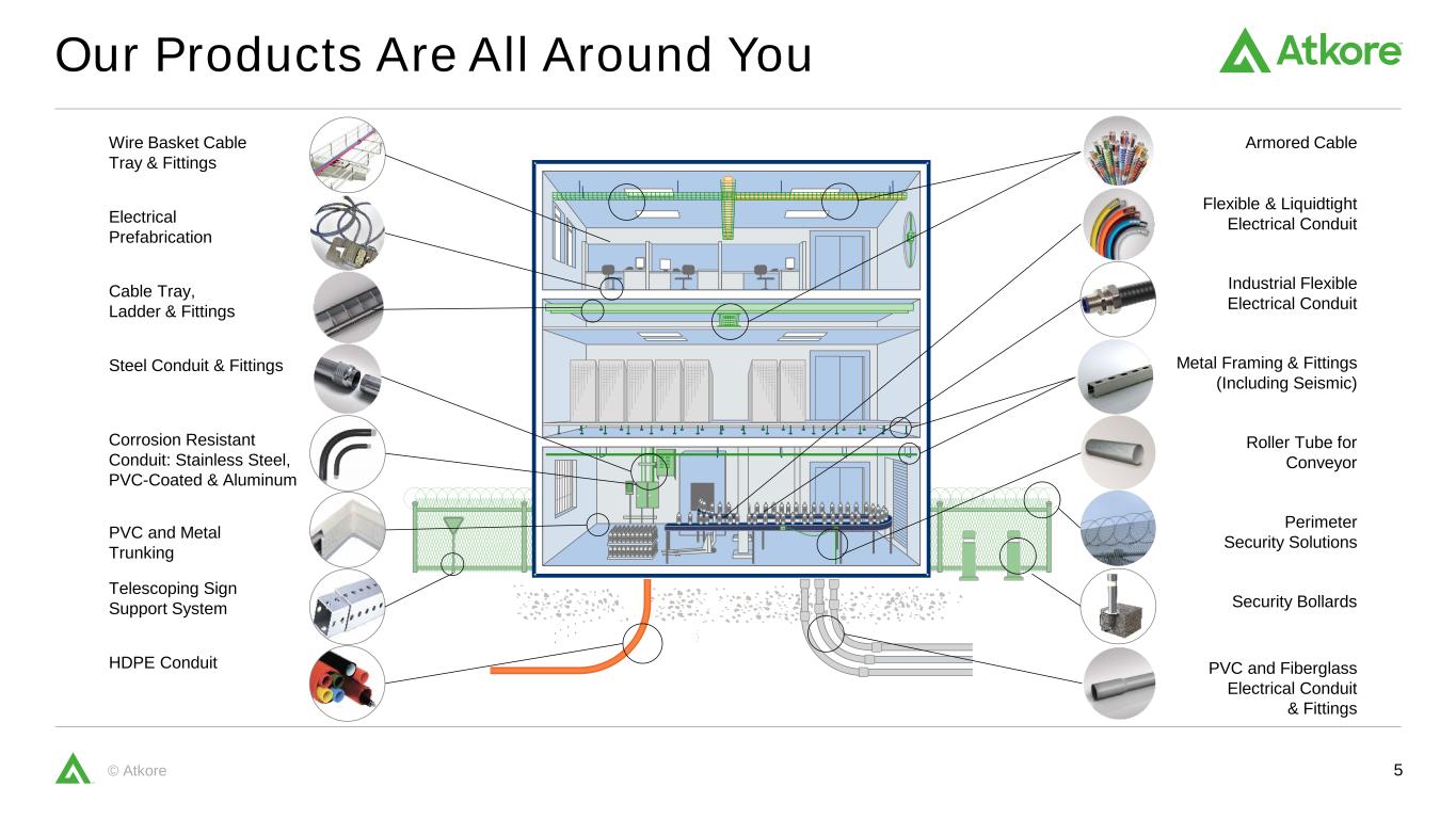5© Atkore Our Products Are All Around You HDPE Conduit Wire Basket Cable Tray & Fittings Telescoping Sign Support System Cable Tray, Ladder & Fittings Steel Conduit & Fittings PVC and Metal Trunking Electrical Prefabrication Flexible & Liquidtight Electrical Conduit Industrial Flexible Electrical Conduit Roller Tube for Conveyor PVC and Fiberglass Electrical Conduit & Fittings Metal Framing & Fittings (Including Seismic) Perimeter Security Solutions Security Bollards Armored Cable Corrosion Resistant Conduit: Stainless Steel, PVC-Coated & Aluminum
