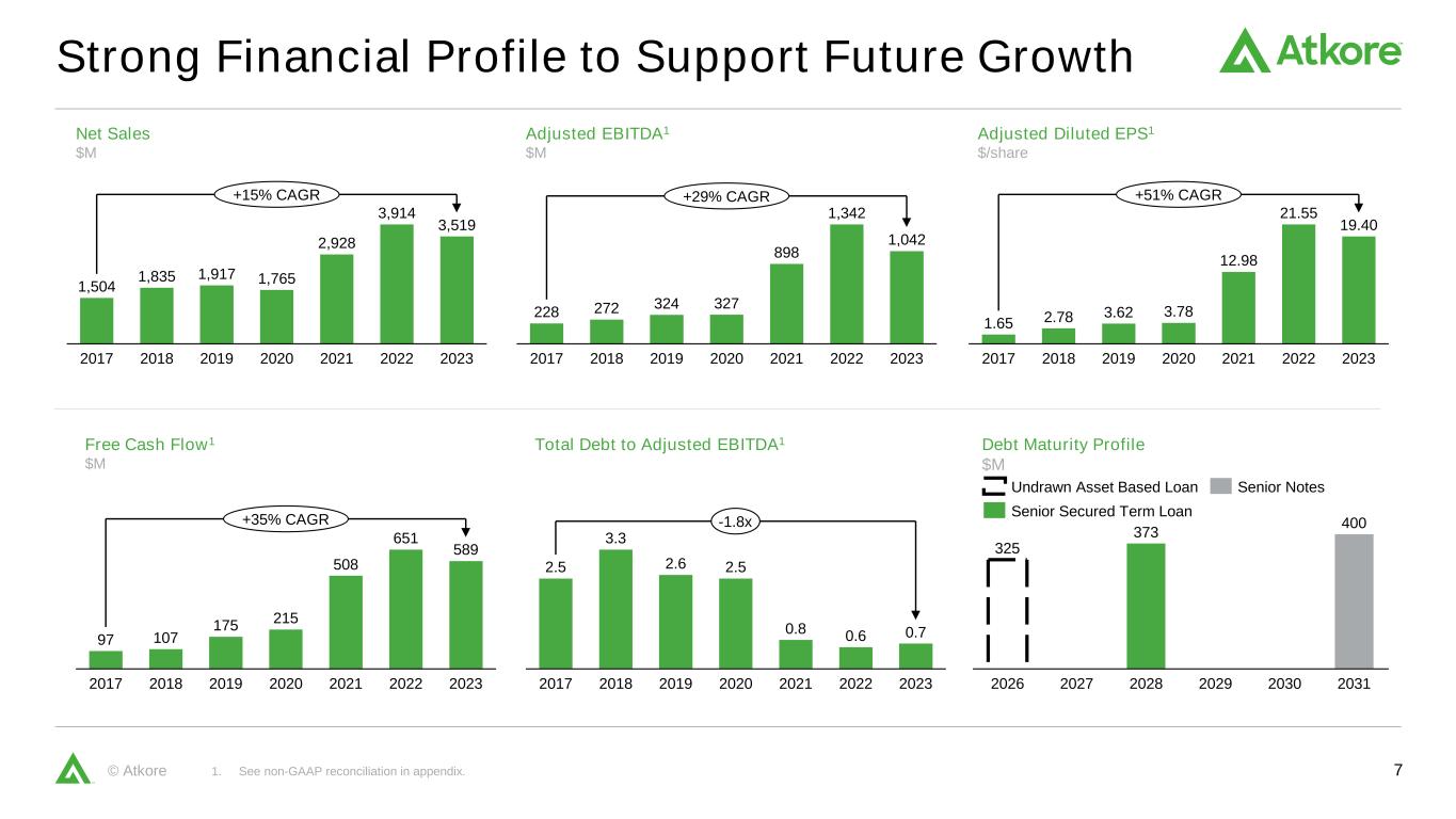 6© Atkore Structurally Improved Our Business Since IPO Annual Net Sales & Adjusted EBITDA, $M 1. See non-GAAP reconciliation in appendix for full year 2017 to 2023 actual results. 2. Reconciliations of the forward-looking quarterly and full-year 2024 outlook for Adjusted EBITDA and Adjusted Diluted EPS is not being provided as the Company does not currently have sufficient data to accurately estimate the variables and individual adjustments for such reconciliation. Accordingly, we are relying on the exception provided by Item 10(e)(1)(i)(B) of Regulation S-K to exclude these reconciliations. F 2023 $228M $272M $324M $327M $898M $1,342M $1,042M $1,504M $1,835M $1,917M $1,765M $2,928M $3,914M $3,519M FY 2017 FY 2018 FY 2019 FY 2020 FY 2021 FY 2022 FY 2023 $3.3B - $3.5B $850M – $900M FY 2024 Outlook Net Sales Adj. EBITDA1,2 15.1% 14.8% 16.9% 18.5% 30.7% 34.3% 29.6% ~25% to 26% Adjusted EBITDA Margin1 % We have structurally improved, diversified and elevated the profitability of the business over the past 7+ years Anticipate long-term Adjusted EBITDA Margin in the range of ~25% +/- 150-200 bps; margin range variability based on product mix as well as raw material input cost changes year to year Focused on our category expansion initiatives related to our Regional Service Centers, Solar Torque Tube manufacturing capacity and HDPE related products Comprehensive portfolio of electrical infrastructure products meets the needs of a wide range of construction end market applications Well positioned to participate in electrical megatrends related to renewable energy, grid hardening, digital infrastructure and the electrification of everything Key Highlights