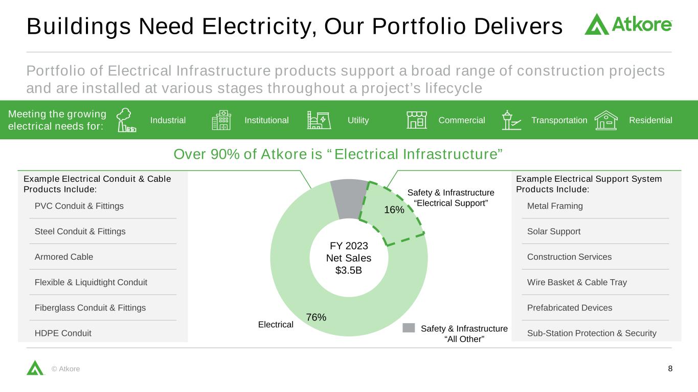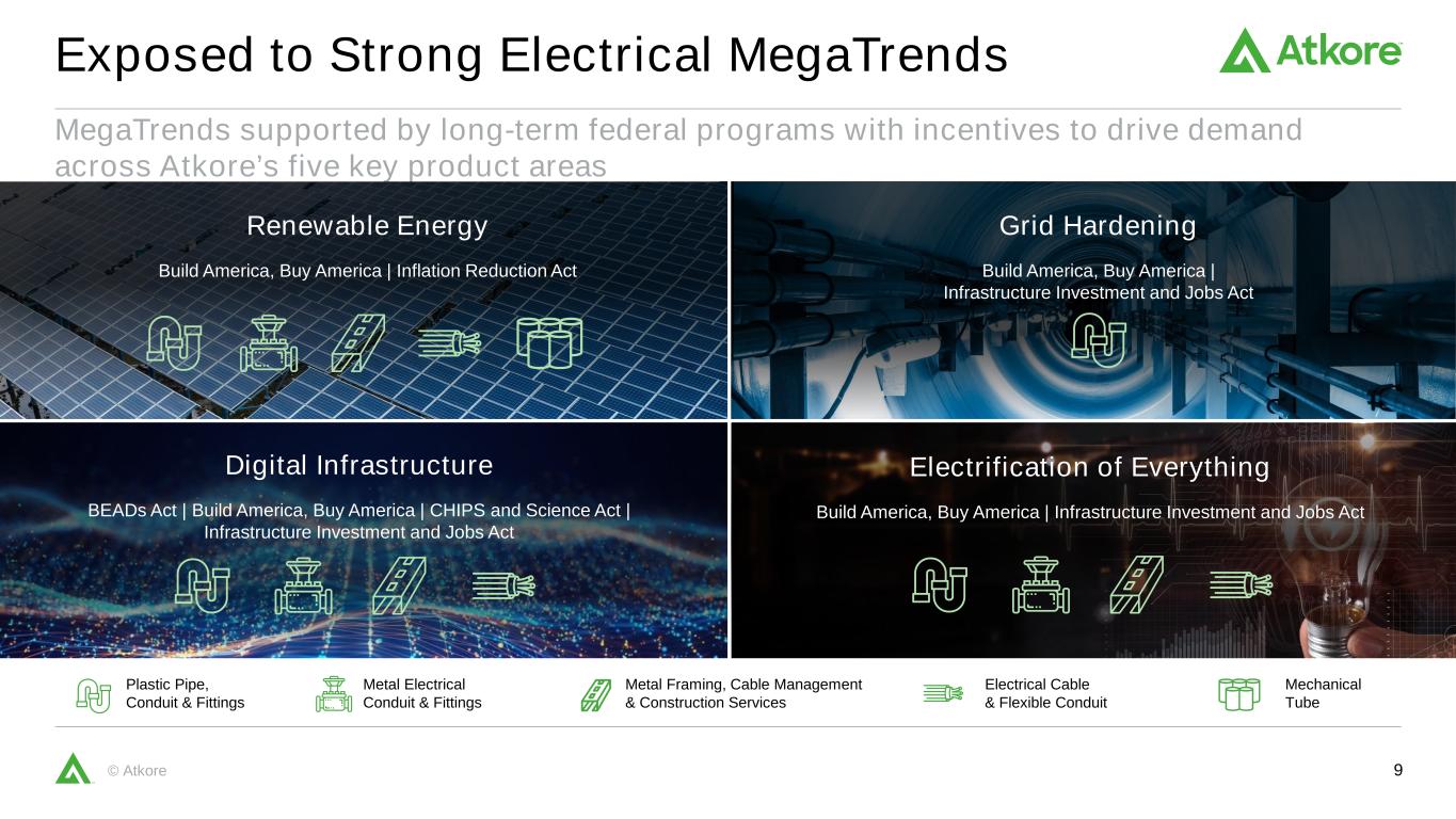 8© Atkore Portfolio of Electrical Infrastructure products support a broad range of construction projects and are installed at various stages throughout a project’s lifecycle Buildings Need Electricity, Our Portfolio Delivers Over 90% of Atkore is “Electrical Infrastructure” CommercialIndustrial Institutional TransportationUtility ResidentialMeeting the growing electrical needs for: 16% 76% FY 2023 Net Sales $3.5B Example Electrical Conduit & Cable Products Include: PVC Conduit & Fittings Steel Conduit & Fittings Armored Cable Flexible & Liquidtight Conduit Fiberglass Conduit & Fittings HDPE Conduit Safety & Infrastructure -- "All Other" Safety & Infrastructure “Electrical Support” Electrical Safety & Infrastructure “Al ther” Example Electrical Support System Products Include: Metal Framing Solar Support Construction Services Wire Basket & Cable Tray Prefabricated Devices Sub-Station Protection & Security