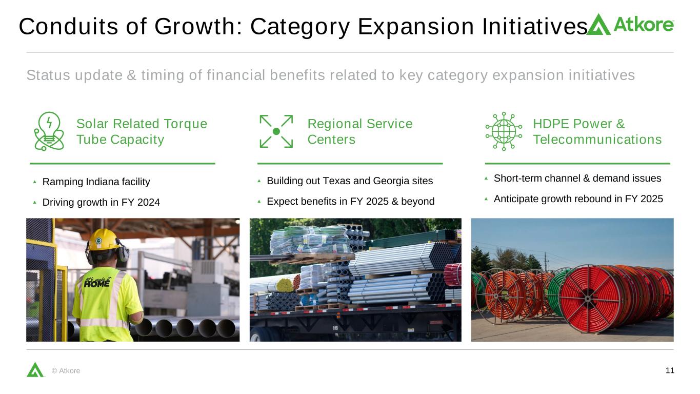 10© Atkore Product Portfolio Aligned to Strong Growth Trends 1. Atkore estimated analysis of electrical products installed per project type. 2. Atkore analysis based on expected change in total construction starts from industry sources such as Dodge Construction Network for 2019-2023 baseline compared to 2024-2028 projections. Average Atkore Product Use & Anticipated Growth by End Market Category Above AverageBelow Average Average Use Density1 Data CenterOffice Education HealthcareMulti-Family LodgingWarehouse Manufacturing 2024-2028 Anticipated Growth2 Dodge Construction Network expects growth in data centers, manufacturing, healthcare, lodging, education, and multi-family from 2024-2028. EC&M expects non-residential construction spend to remain healthy in 2024, driven by growth in manufacturing, hotels, healthcare and education. S&P Global reports that the software segment of the Generative AI movement is expected to grow approximately 10X over the next several years, which should drive additional demand for physical AI infrastructure, such as data centers. Major electrical contractors and global peers continue to report elevated backlogs at record, or near-record levels. Atkore’s business model is designed to succeed through fluctuations in various category end market demand, and our product portfolio is well-positioned with the projected growth in several end-markets