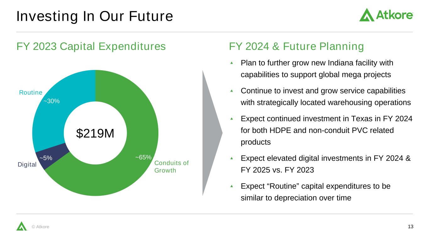 12© Atkore Updated Capital Deployment Model 1. Plan announced in November 2021. Balanced Capital Deployment Model Focused on Growth & Returns to Stockholders Updated Capital Deployment Model Capital Investments Stock Repurchases M&A Priority Uses for Capital Maintain Total Debt to normalized Adj. EBITDA ratio at ~2x or below; willing to go above for select strategic opportunities Between $175M - $200M in expected capital expenditures in FY 2024; includes further investment in both our Conduits of Growth and our digital capabilities Over $1B in stock repurchases completed since November 2021; Board approved new $500M program, available upon completion of our existing $1.3B plan. Target Cash Flow from Operating Activities to be approximately 100% of Net Income Averaged Over a 3-Year Period Status Update Dividends Quarterly dividend program: Atkore’s Board of Directors added a quarterly dividend program to the capital deployment model in November 2023 and declared the Company’s first quarterly cash dividend on January 30, 2024. Disciplined approach: Expect M&A to be focused on growing portfolio or expanding presence in select areas and categories